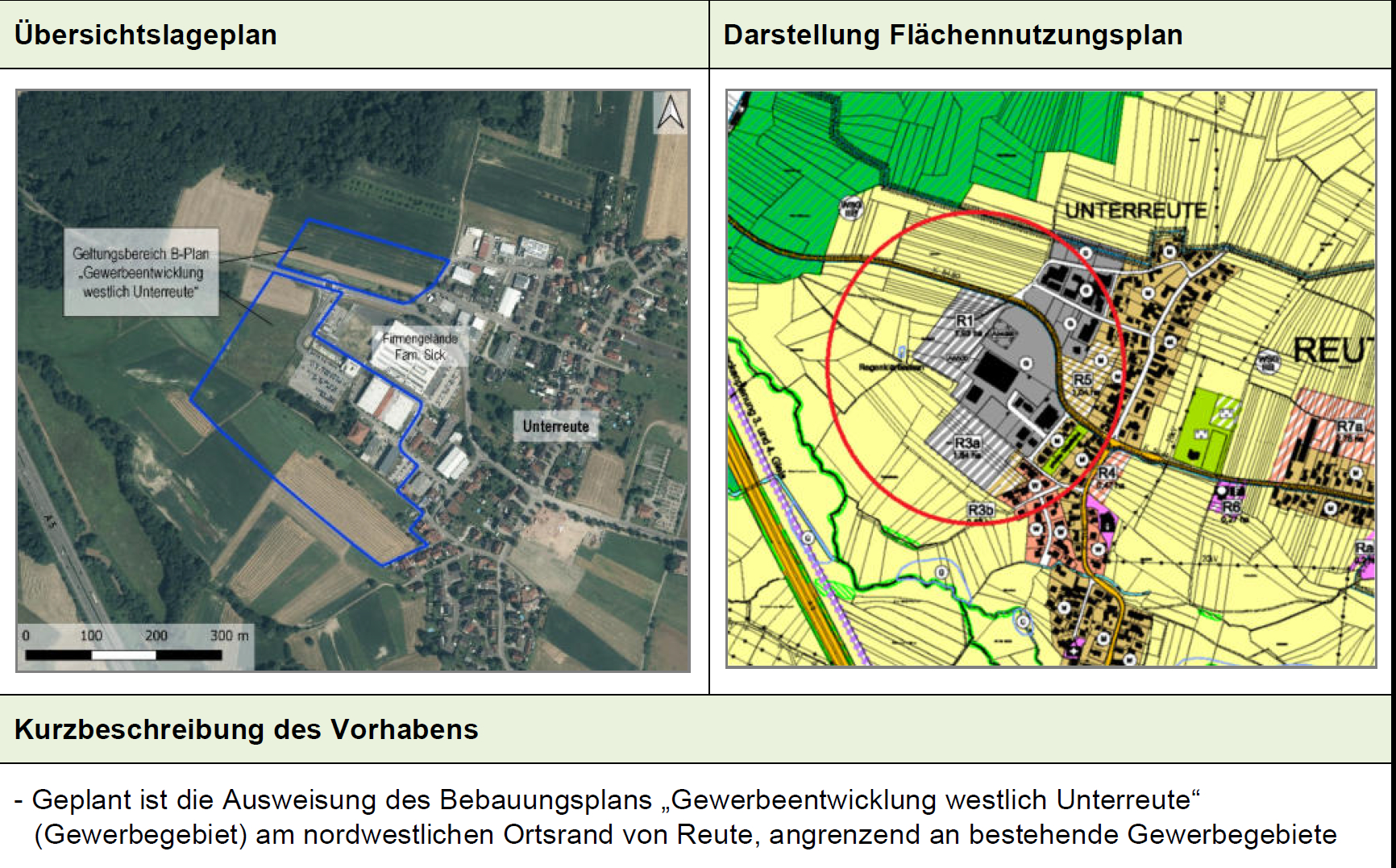 Kurzbeschreibung des Vorhabens: - In dem Geltungsbereich der 4. Flächennutzungsplan-Änderung ist die Ausweisung des Bebauungsplans „Gewerbeentwicklung westlich Unterreute“ (Gewerbegebiet) am nordwestlichen Ortsrand von Reute geplant, angrenzend an den bestehenden Standort der SICK AG sowie bestehende Gewerbegebiete. - Der Gemeinderat hat beschlossen, für dieses Gebiet einen Bebauungsplan aufzustellen. Das Umlegungsgebiet liegt im Geltungsbereich dieses Bebauungsplans. - Das Plangebiet wird durch die K5130 in einen südlichen und nördlichen Teilbereich untergliedert. - Es gibt eine Bauverpflichtung.