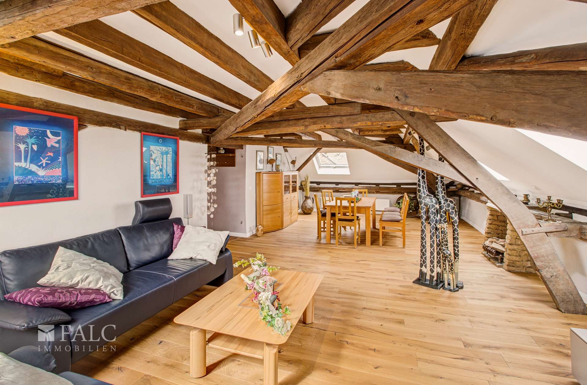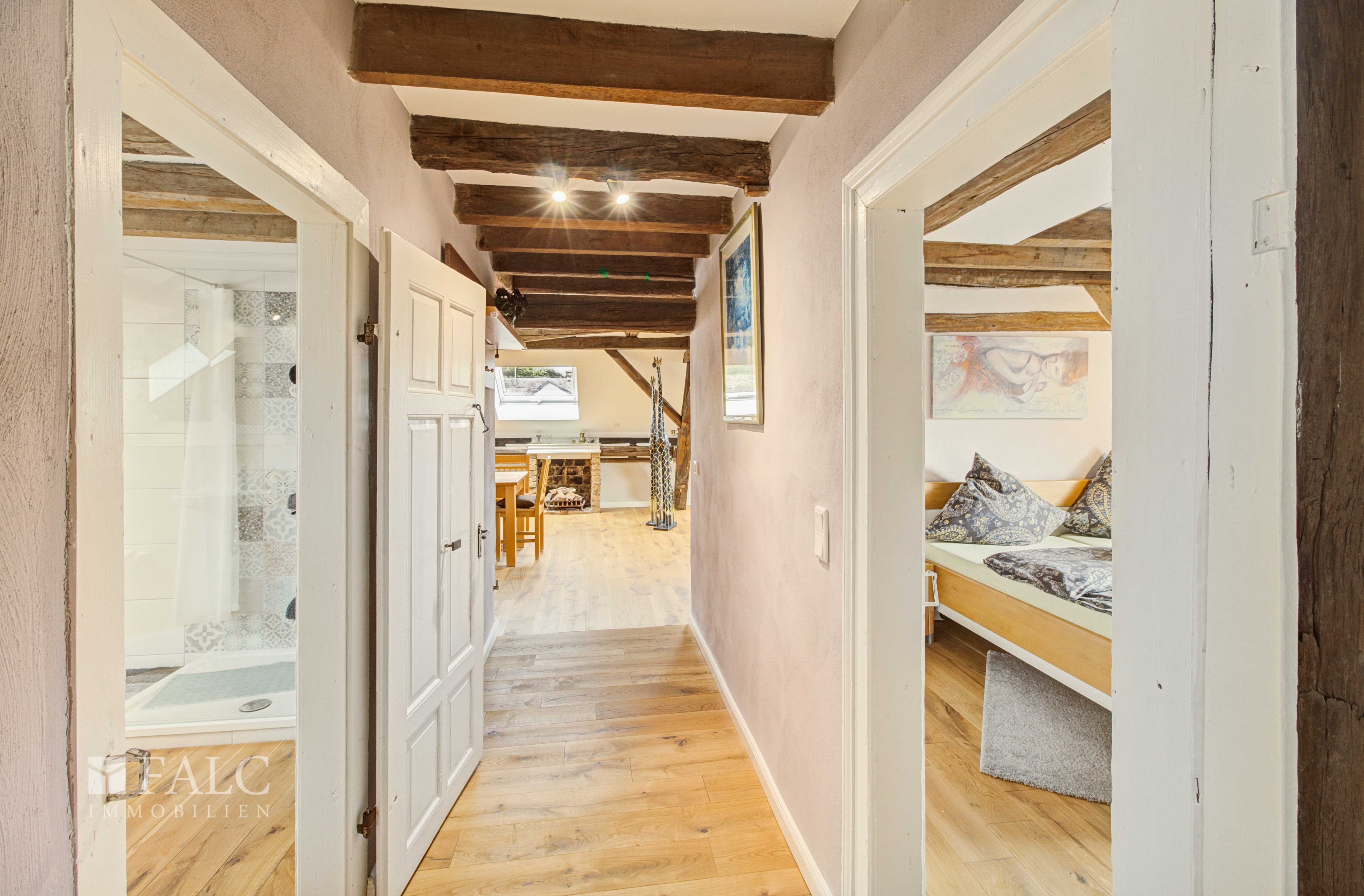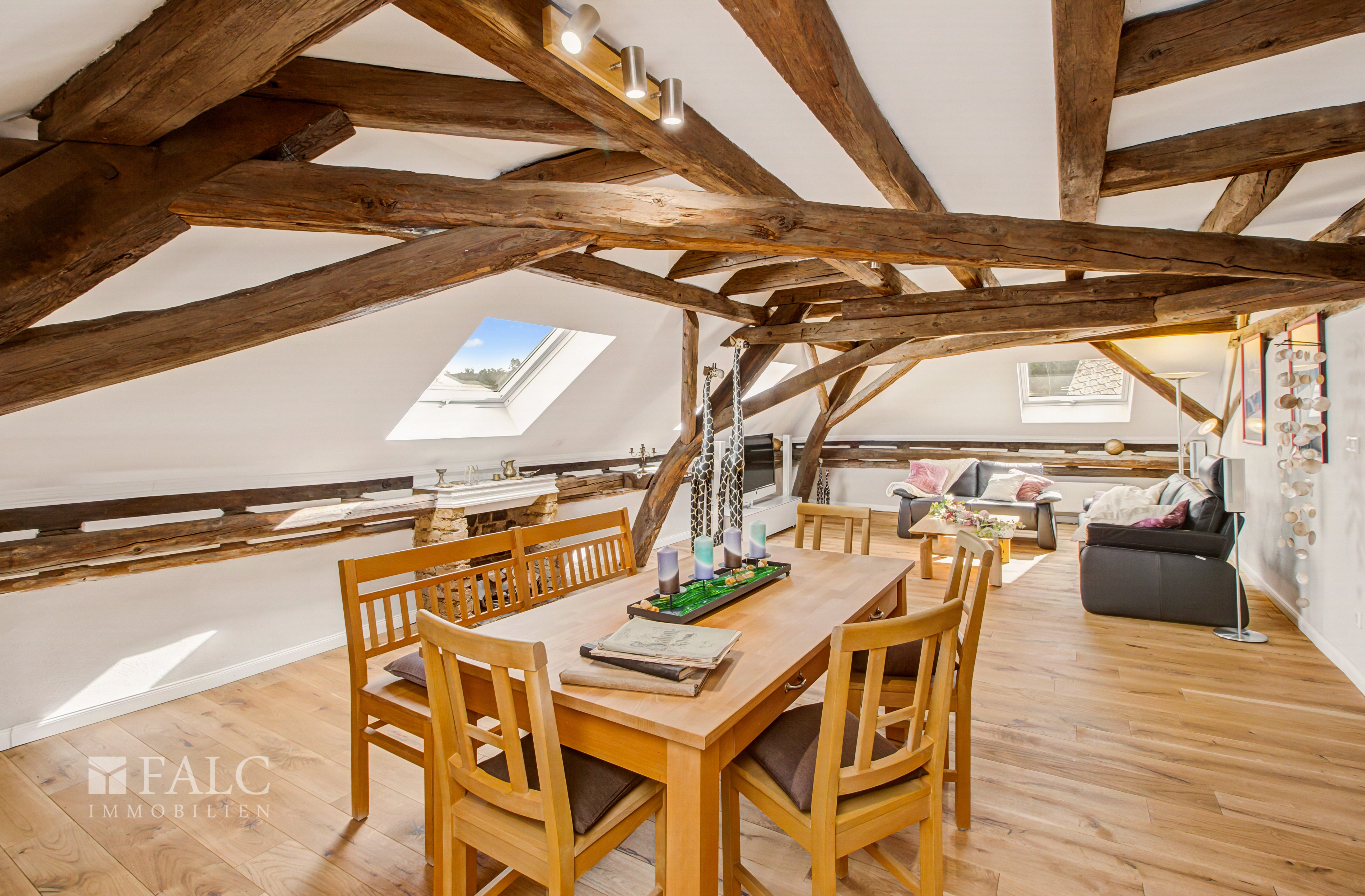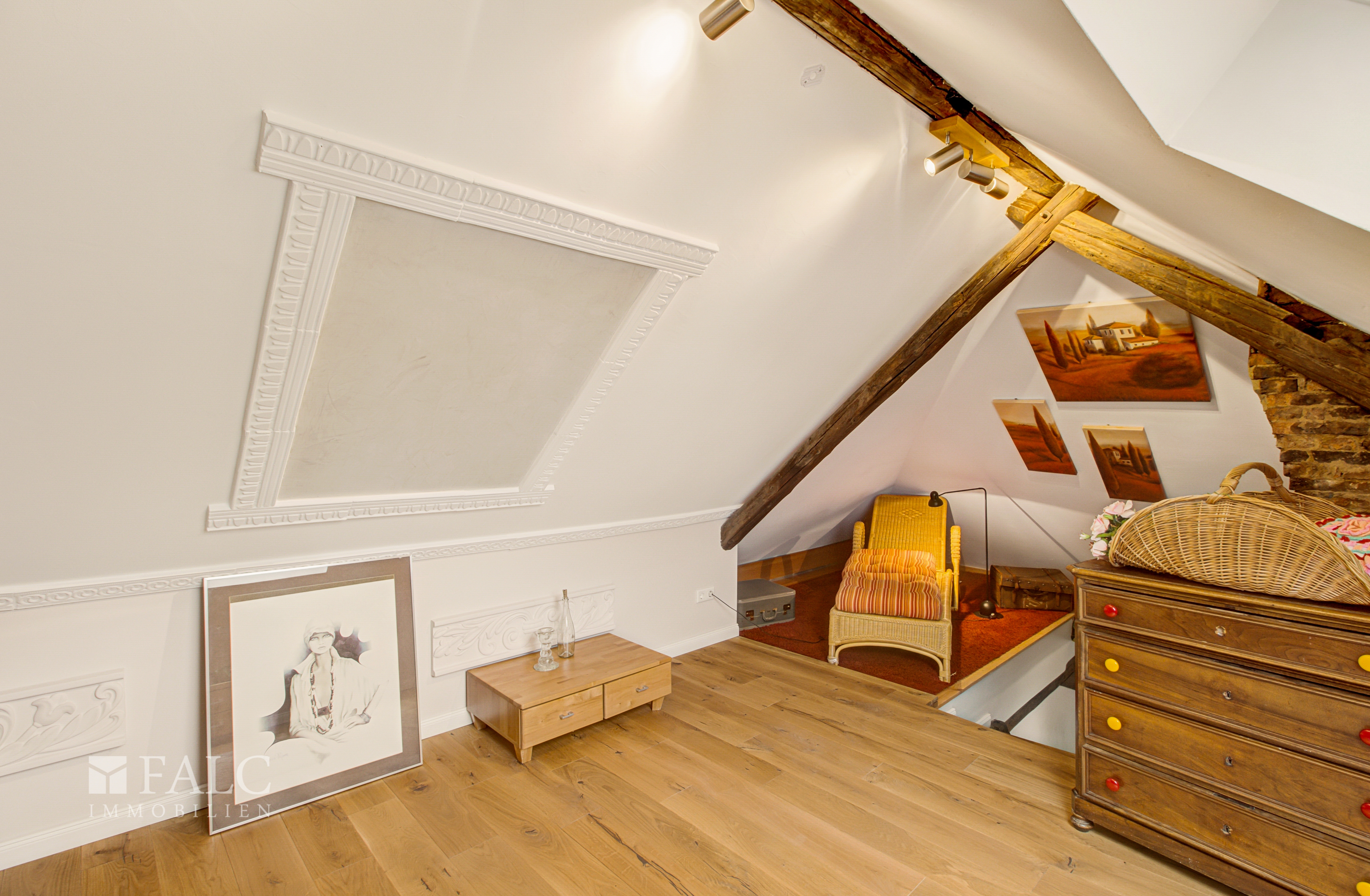 Die dritte Etage verzaubert mit ihren charmanten Dachschrägen und sichtbaren Holzbalken, die dieser Ebene eine ganz besondere Atmosphäre verleihen. Neben einem großen Wohn- und Esszimmer, zwei gemütlichen Schlafzimmern, einer offenen Küche und einem geräumigen Badezimmer bietet diese Etage Zugang zum ausgebauten Spitzboden – eine ideale Erweiterung als zusätzliche Nutzfläche.