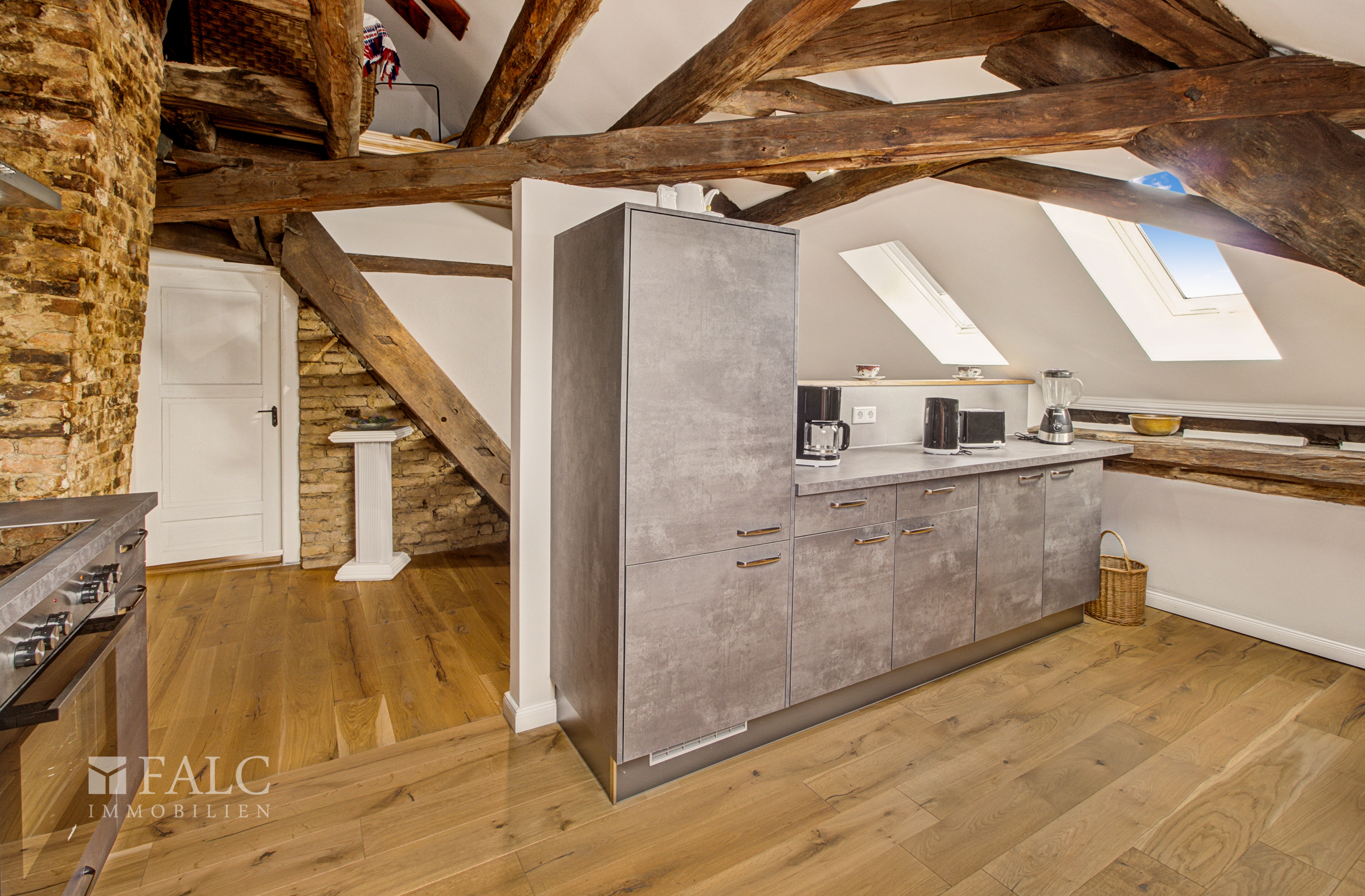 Im zweiten Obergeschoss erwartet Sie eine dritte Wohneinheit, die durch ein offenes Wohn- und Esszimmer mit Fachwerk-Flair und einer praktischen Küche besticht. Das Schlafzimmer und das elegante Badezimmer schaffen eine angenehme Atmosphäre. Darüber hinaus gibt es auf dieser Etage ein großzügiges Büro, dass vom Treppenhaus aus erreichbar ist.