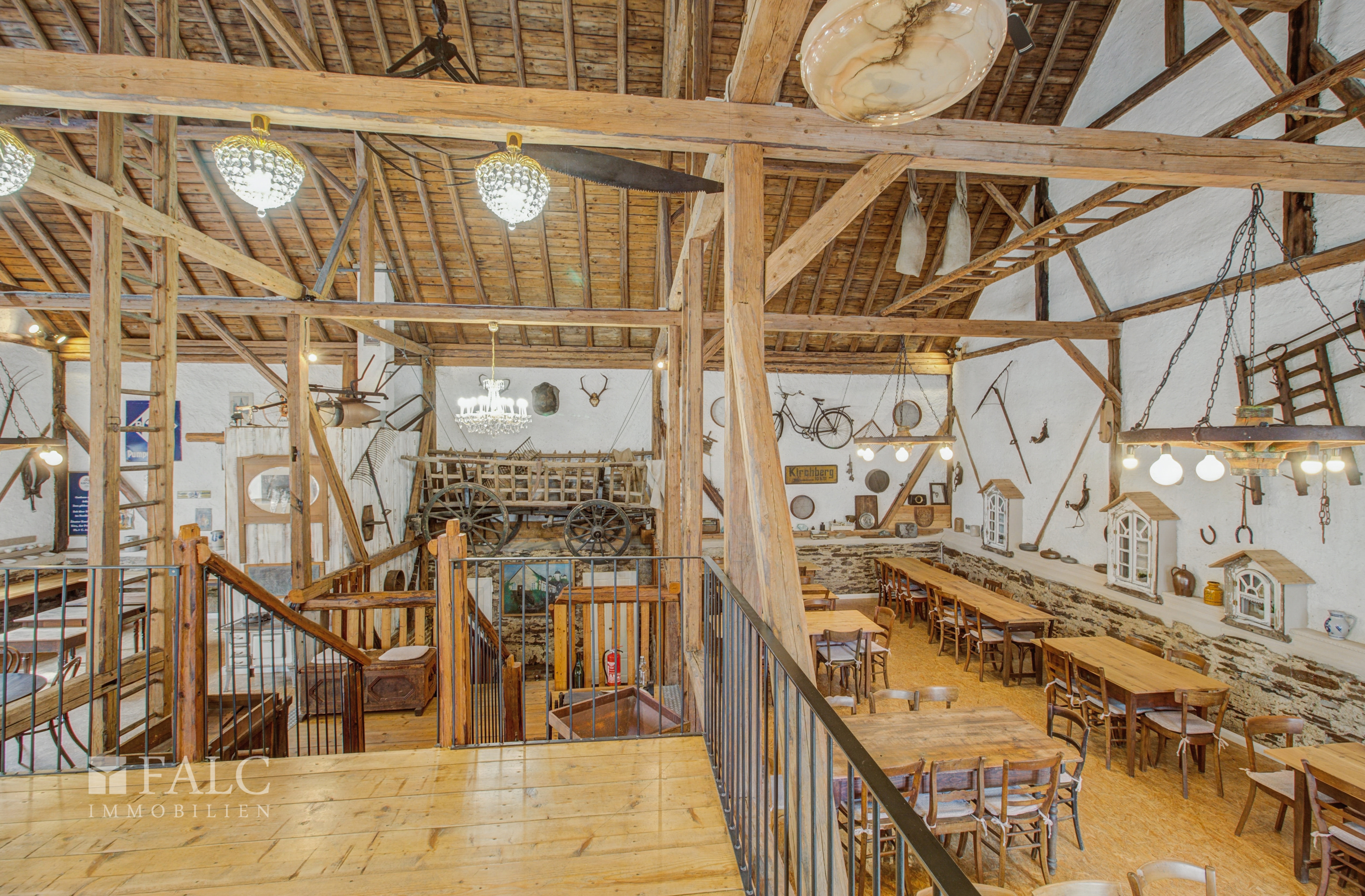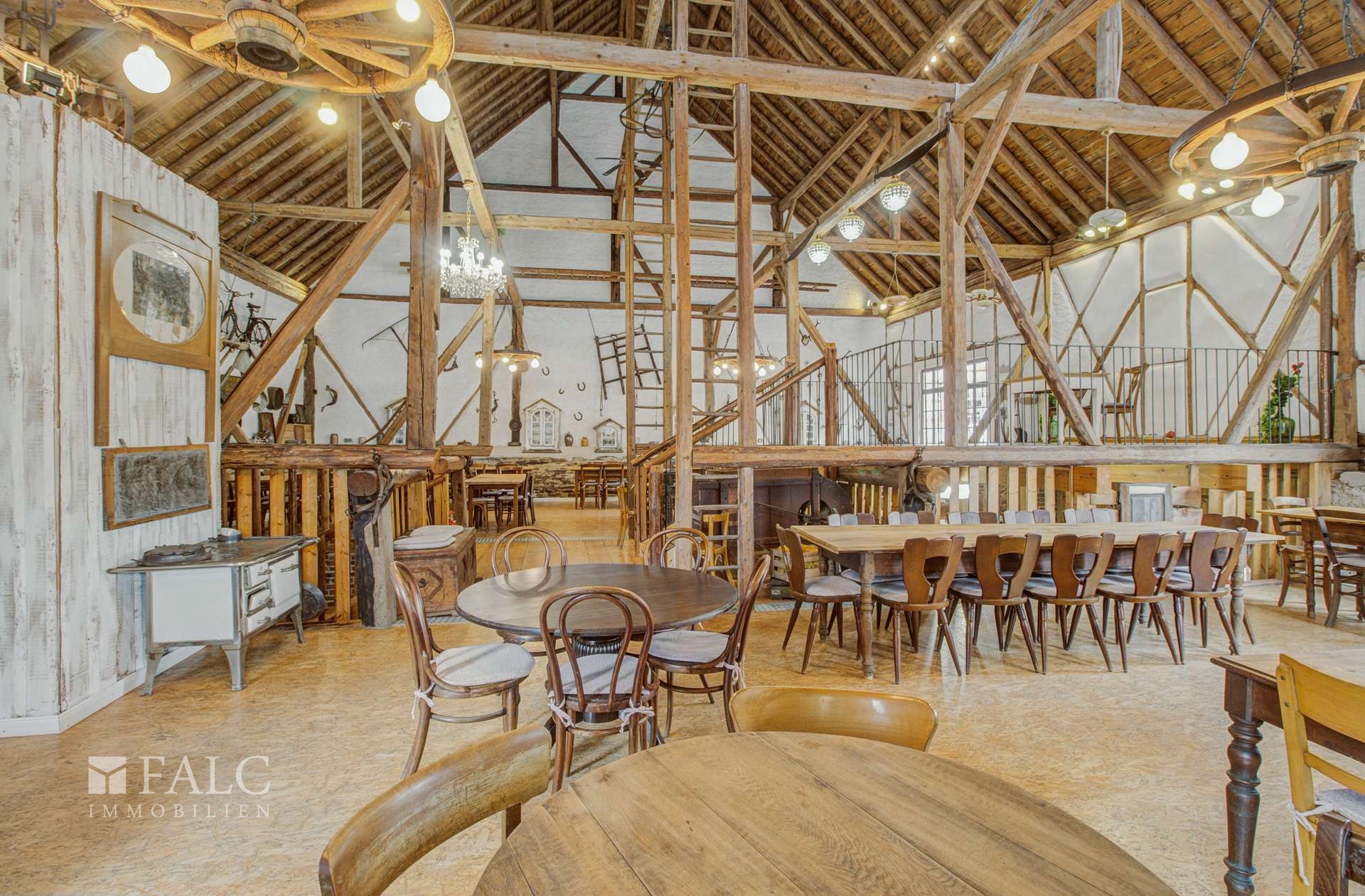 Eventscheune ca. 318 m² komplett eingerichtet - Fußbodenheizung im OG - Kühlhaus - Speisenaufzug - massive Holztreppe - 2023 größtenteils Heizung und Elektro neu - Versorgungsleitungen und Sanitär komplett neu - OSB Böden - teilweise echter Stuck an den Wänden - Dacheindeckung und Holzunterlattung neu - PV Anlage ca. 22KW Rückseite Scheunendach - Garage