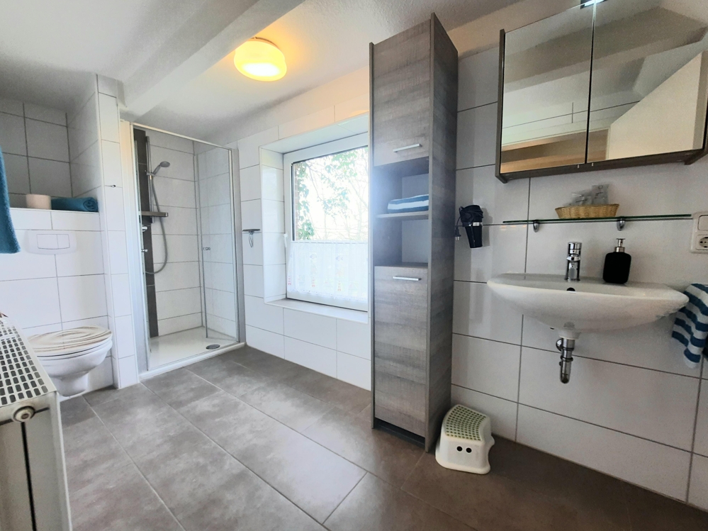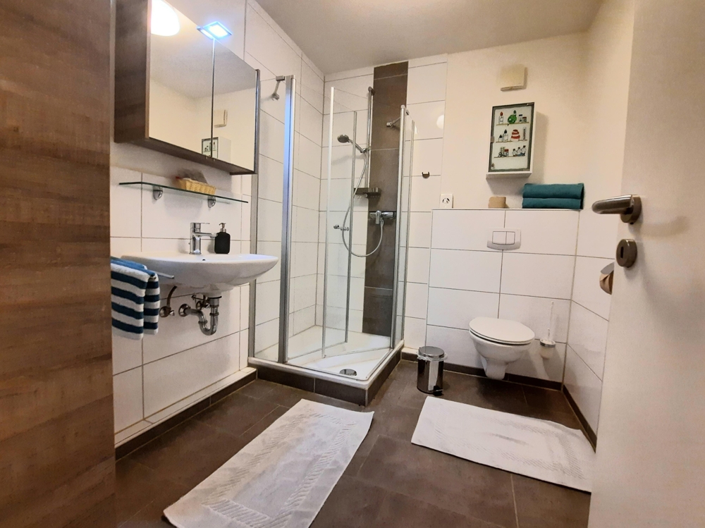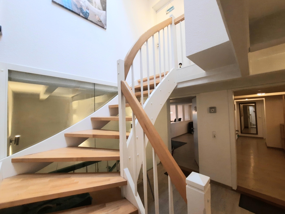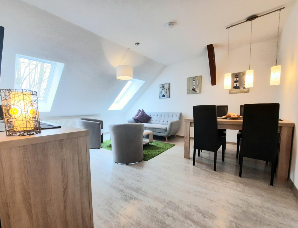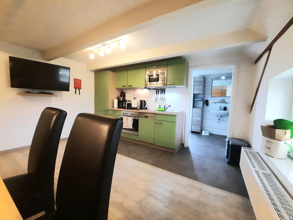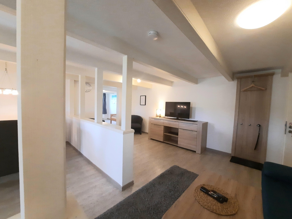 Der sog. Wohnteil beherbergt im EG eine riesige Diele mit hohen Decken, eine kleine Rezeption und ein neuwertiges, barrierefreies, behindertengerechtes Gäste-WC. Im hinteren Bereich der großen Eingangsdiele befindet sich das renovierte, teilverglaste Treppenhaus, von dem aus man in 3 der 5 Ferienwohnungen sowie die Eigentümerwohnung gelangt. Ebenfalls abgehend von der großen Diele geht man nach links in den großen Frühstücks- u. Aufenthaltsraum, in dem sich neben Sitzgelegenheiten ein großer, offener Kamin und ein neuwertiges Eck-Buffet sowie eine kleine Gästebibliothek befindet. Dahinter befinden sich eine große gewerbl. Wirtschaftsküche und insgesamt 5 Abstellräume, teilweise mit integr. Kühl- u. Gefrierschränken. Außerdem gelangt man vom hinteren Flurbereich und der großen Gastronomieküche in die ca. 11qm große stilvolle Veranda (Holzanbau) und von dort aus wiederum in den etwa 1200qm großen, komplett eingefriedeten und teilweise uneinsehbaren Gartenbereich. Geht man in der Haupteingangsdiele nach rechts, gelangt man in die kleinste der insgesamt fünf Ferienwohnungen, die im Übrigen allesamt und einzeln mit 4 (!) Sternen durch den DEUTSCHEN TOURISMUS VERBAND klassifiziert wurden.