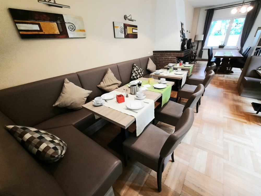 Der sog. Wohnteil beherbergt im EG eine riesige Diele mit hohen Decken, eine kleine Rezeption und ein neuwertiges, barrierefreies, behindertengerechtes Gäste-WC. Im hinteren Bereich der großen Eingangsdiele befindet sich das renovierte, teilverglaste Treppenhaus, von dem aus man in 3 der 5 Ferienwohnungen sowie die Eigentümerwohnung gelangt. Ebenfalls abgehend von der großen Diele geht man nach links in den großen Frühstücks- u. Aufenthaltsraum, in dem sich neben Sitzgelegenheiten ein großer, offener Kamin und ein neuwertiges Eck-Buffet sowie eine kleine Gästebibliothek befindet. Dahinter befinden sich eine große gewerbl. Wirtschaftsküche und insgesamt 5 Abstellräume, teilweise mit integr. Kühl- u. Gefrierschränken. Außerdem gelangt man vom hinteren Flurbereich und der großen Gastronomieküche in die ca. 11qm große stilvolle Veranda (Holzanbau) und von dort aus wiederum in den etwa 1200qm großen, komplett eingefriedeten und teilweise uneinsehbaren Gartenbereich. Geht man in der Haupteingangsdiele nach rechts, gelangt man in die kleinste der insgesamt fünf Ferienwohnungen, die im Übrigen allesamt und einzeln mit 4 (!) Sternen durch den DEUTSCHEN TOURISMUS VERBAND klassifiziert wurden.