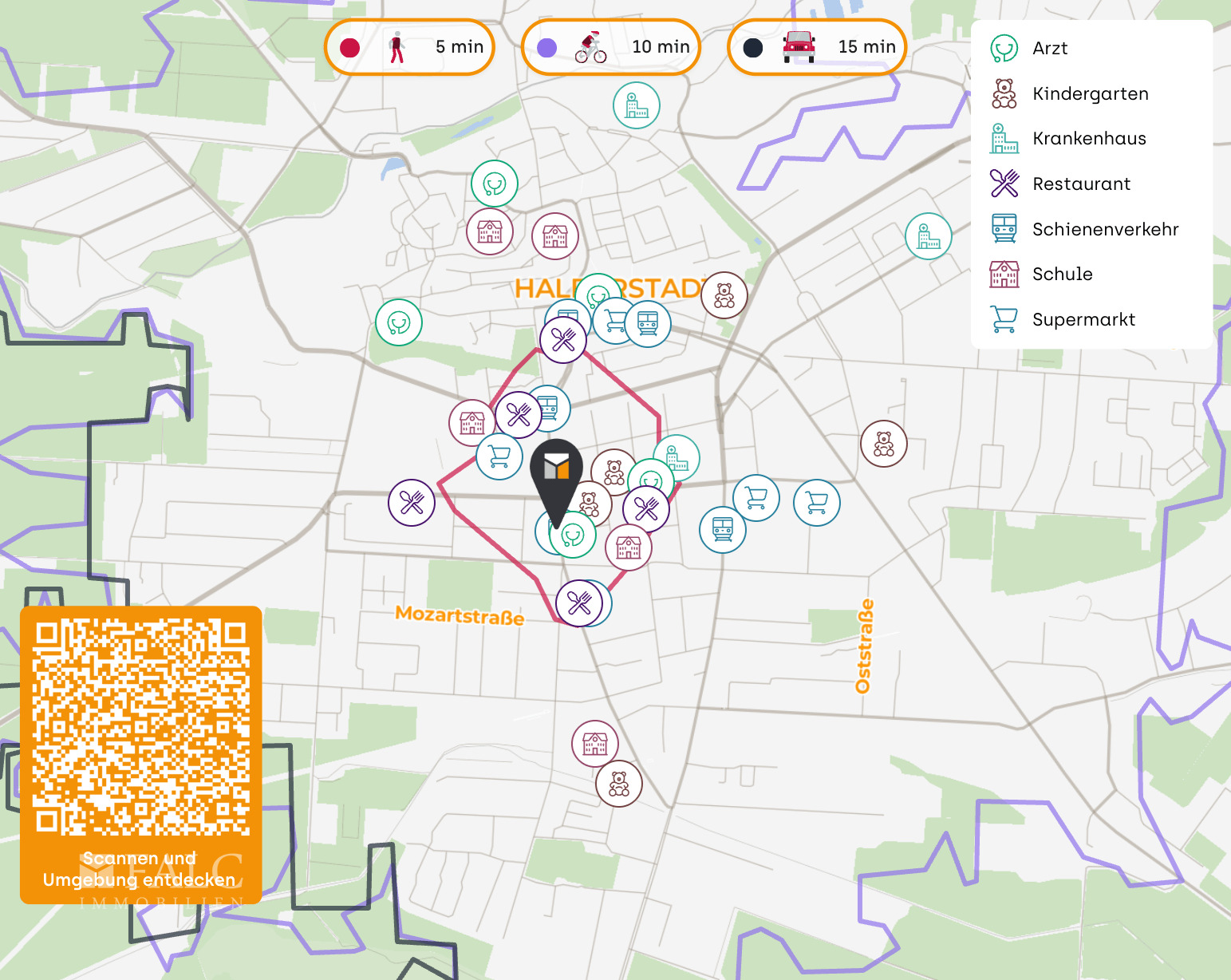 Die Immobilie in der Spiegelstraße 52 in Halberstadt bietet eine hervorragende Anbindung an den öffentlichen Nahverkehr. Die nächste Bushaltestelle, Theater, ist nur ca. 155 Meter entfernt, während die Tram-Station Spiegelstraße in ca. 160 Metern erreichbar ist.