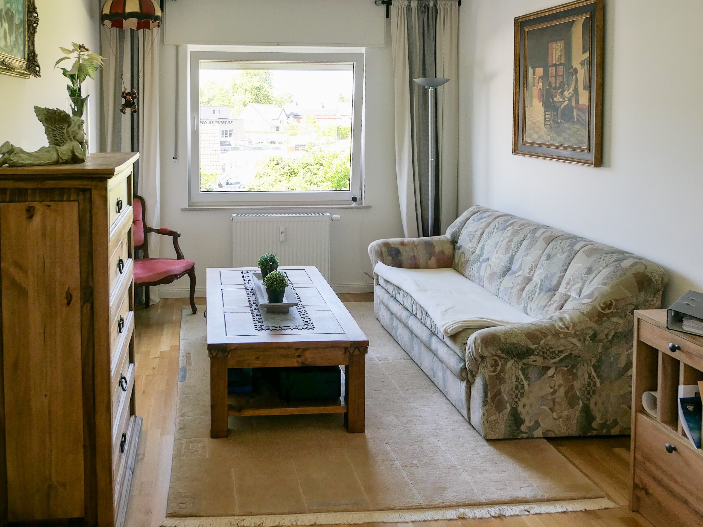 Ein Kellerraum bietet zusätzlichen Stauraum, und für Ihr Auto steht eine Garage mit elektrischem Tor und Licht bereit. Die Wohnung ist frei und wartet auf neue Eigentümer mit Sinn für Qualität und Lage.