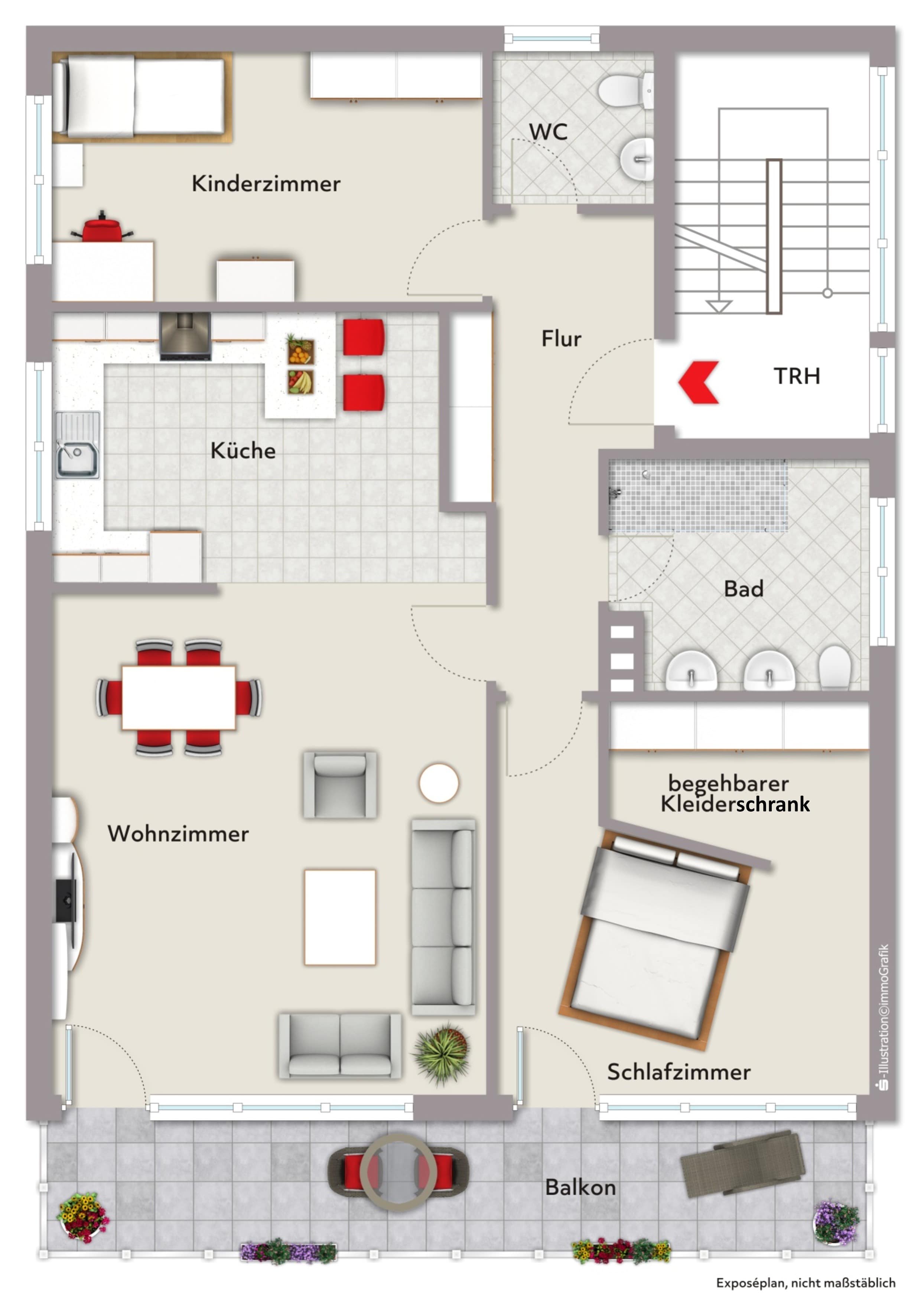 Mit einer Wohnfläche von ca. 110 m² überzeugt die Wohnung durch eine geschickte Raumaufteilung und ein ansprechendes Wohnambiente. Der helle Wohnbereich mit Zugang zum Balkon bietet einen herrlichen Blick in den Garten der Erdgeschosswohnung. Das Schlafzimmer punktet mit einem durch eine Leichtbauwand abgetrennten begehbaren Kleiderschrank – praktisch und stilvoll zugleich.