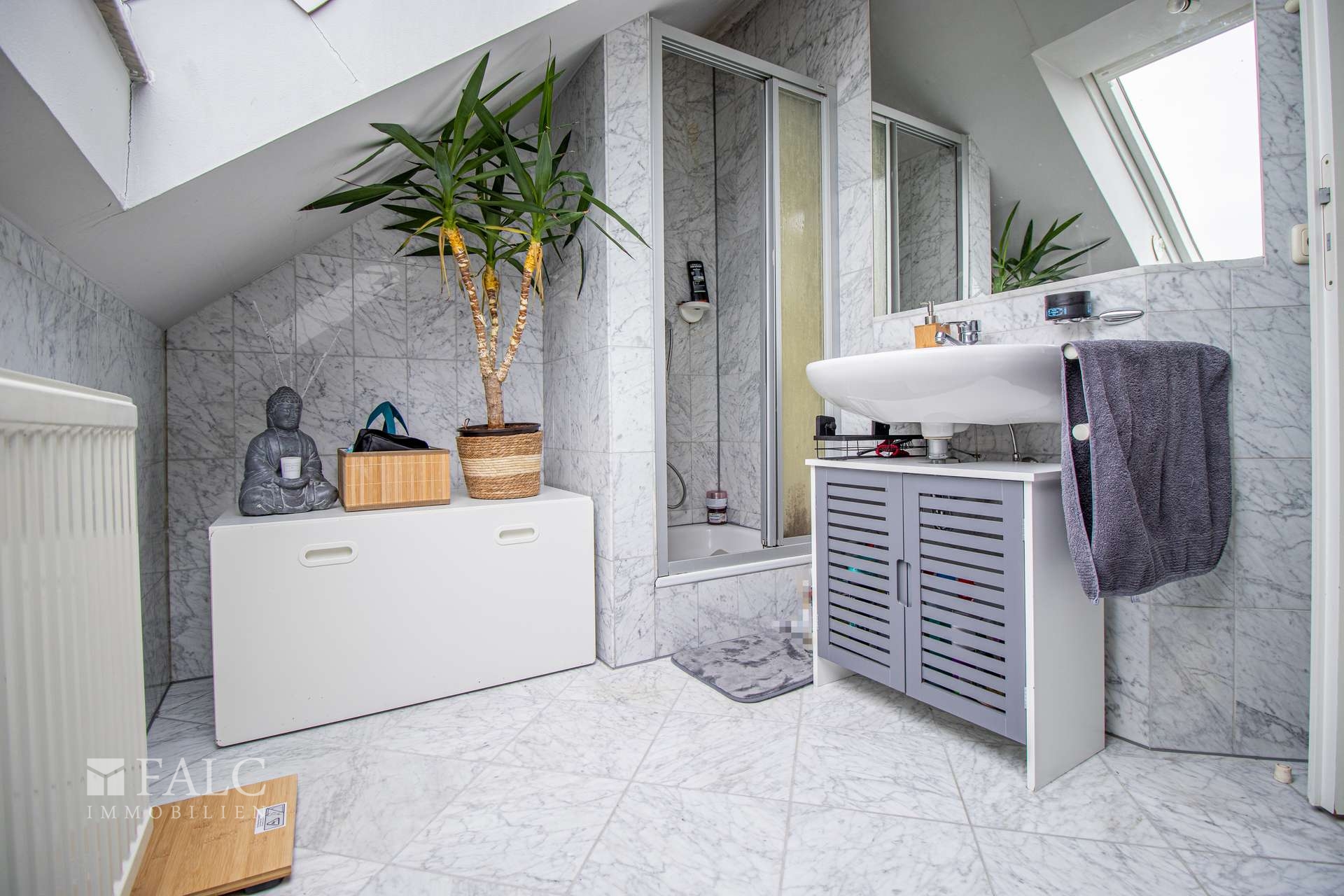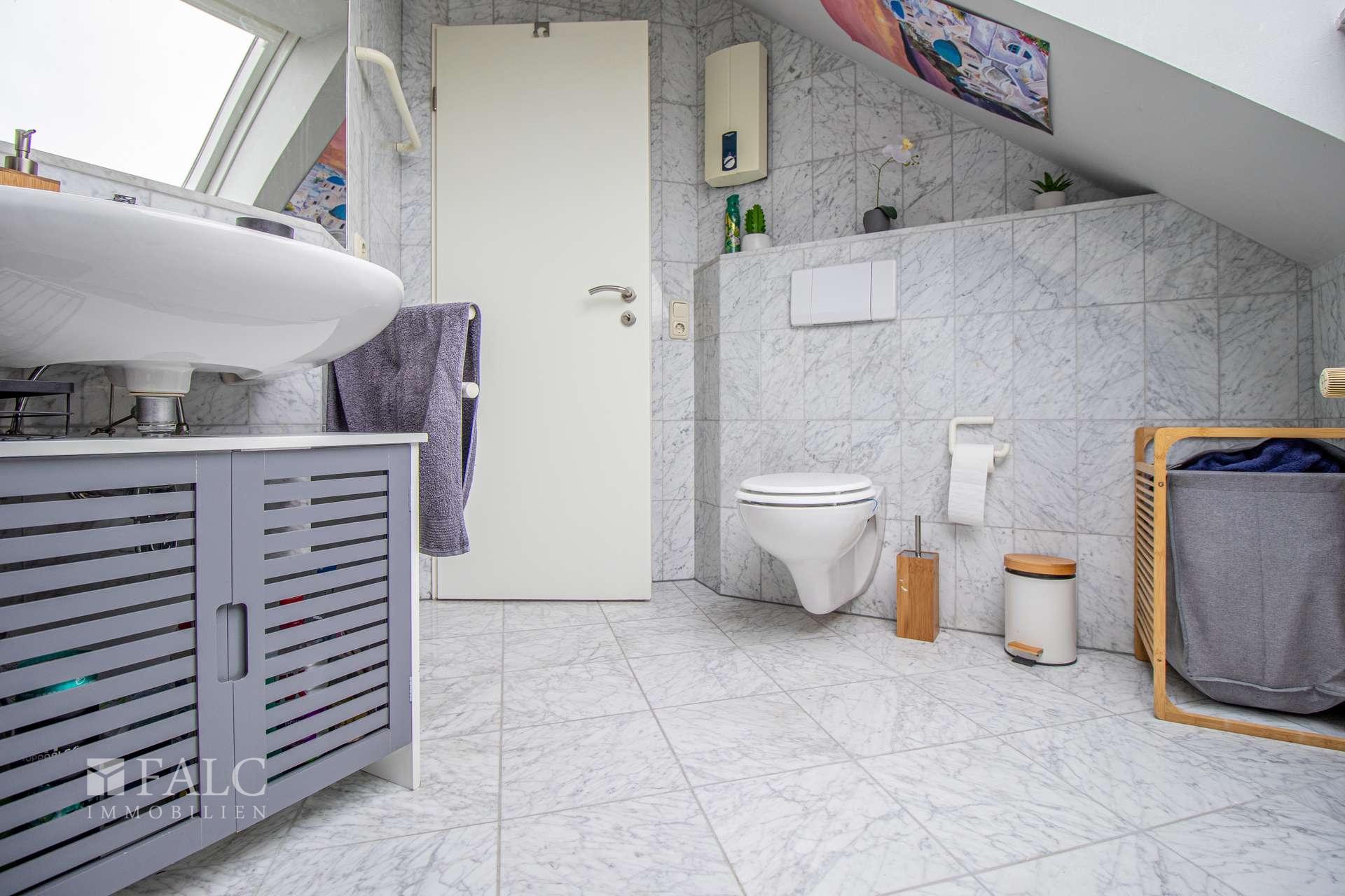 Die Wohnung ist überwiegend mit hellen, pflegeleichten Laminatböden ausgestattet. Für die Küche sowie das Badezimmer wurden zeitlose Fliesen ausgewählt. Das Badezimmer wurde (außer in den Schrägen) raumhoch gefliest.