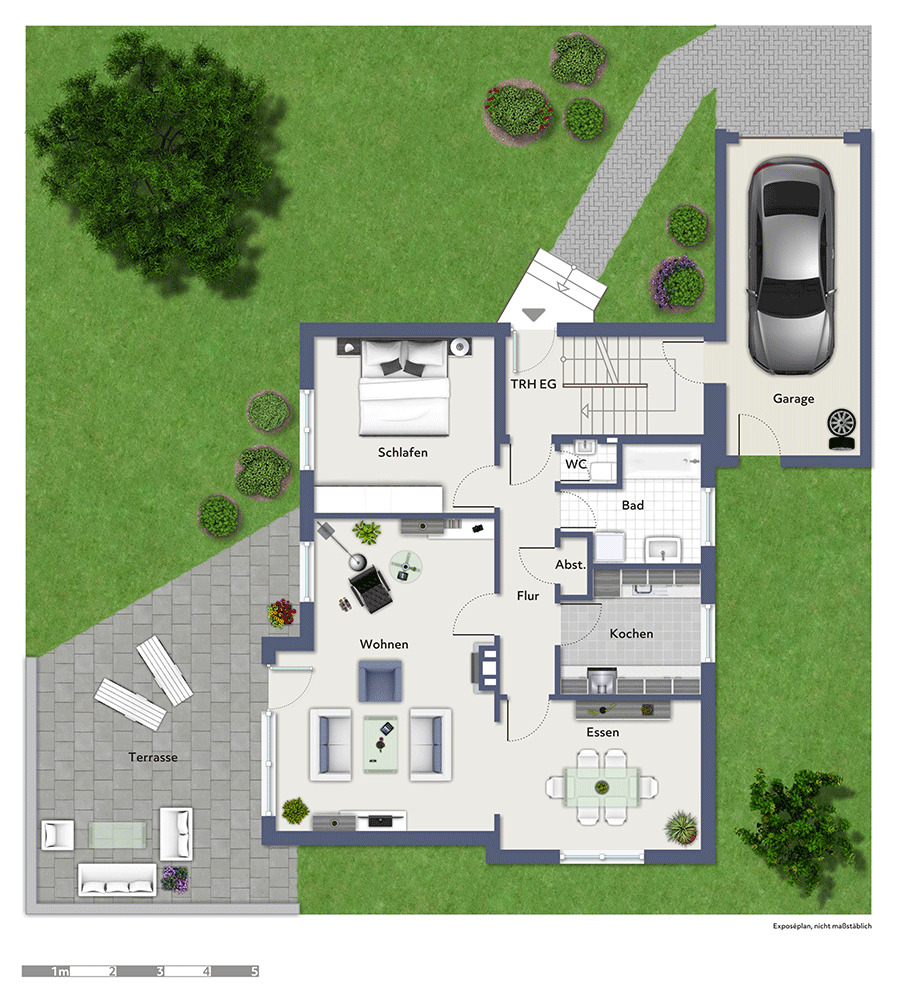 Aus gestalterischen Gründen haben wir die Grundrisse in diesem Exposé überarbeiten lassen. Bei der dargestellten Einrichtung und Ausstattung handelt es sich lediglich um Einrichtungsbeispiele. Wir übernehmen keine Haftung für die Maßstabsgenauigkeit. Sollten bemaßte Originalpläne vorliegen, so stellen wir Ihnen diese gerne zur Verfügung.