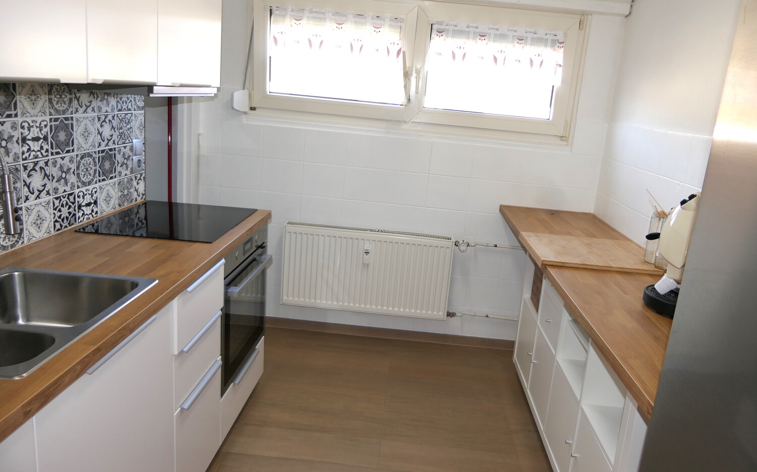 Die Küche ist baujahrestypisch separat gelegen. Sie wurde im letzten Jahr neu gekauft, in 2 parallelen, weißen Küchenzeilen eingerichtet und mit den üblichen Elektrogeräten ausgestattet.