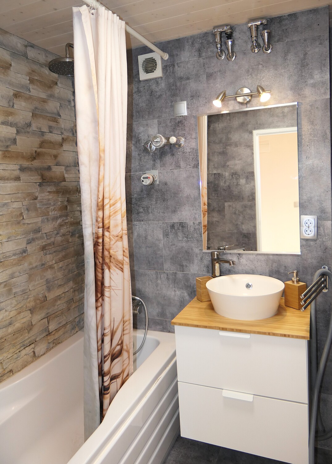Das innen liegende Bad mit Fußbodenheizung, Badewanne, Waschbecken und Waschmaschinenanschluss ist raumhoch gefliest und wird durch die Natursteinwand über der Badewanne zu einem richtigen Wohlfühlort. Das separat gelegene WC ist 3/4 hoch hell gefliest.