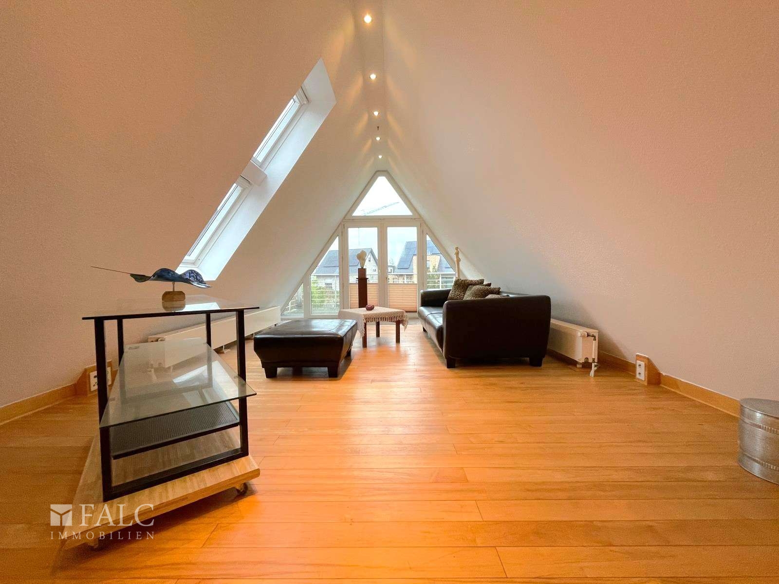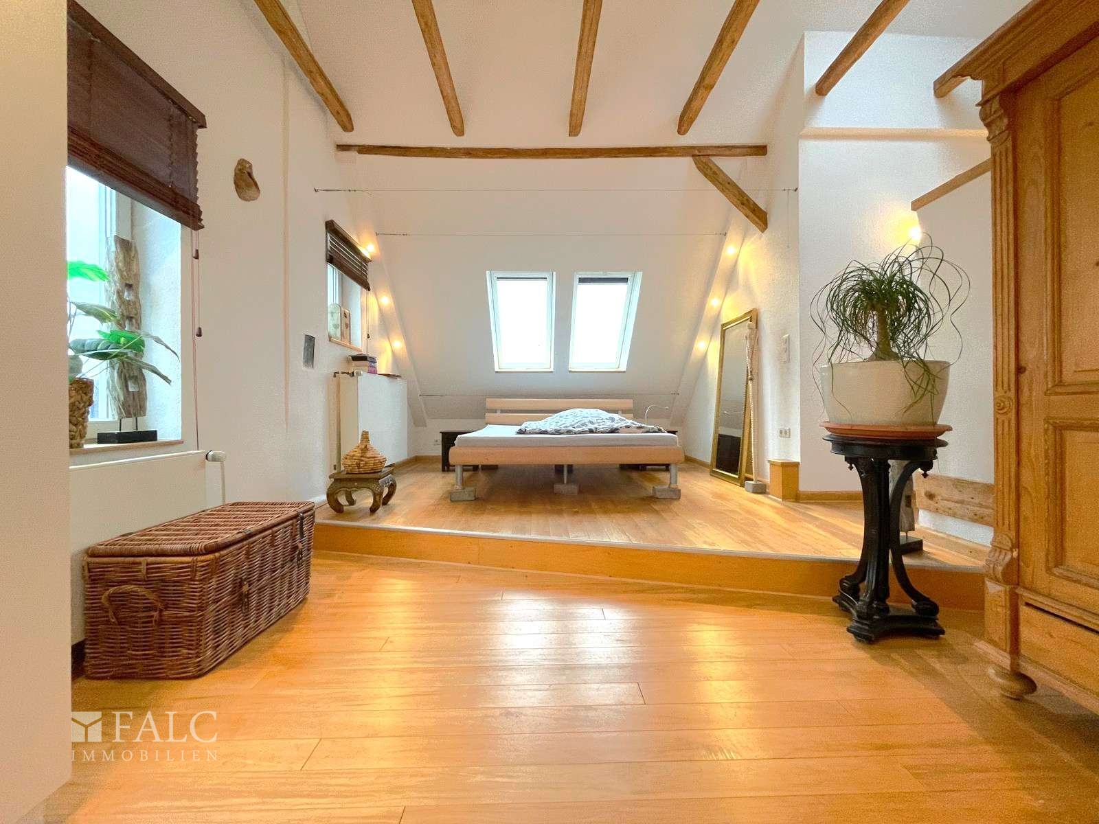 Über die Treppe erreichen Sie das Obergeschoss, in dem ein sehr großer Raum in Studioform mit Zugang zu einem Balkon beeindruckt. Dieser offene Bereich eignet sich ideal als großzügiges Wohnzimmer, Atelier oder Homeoffice. Ein weiteres Schlafzimmer ergänzt das Raumangebot dieser Etage. Zudem befindet sich auf halber Treppenhöhe ein zweites Badezimmer, das aus einem ehemaligem Kinderzimmer geschaffen wurde und modern nutzbar ist. Küchenanschlüsse im Obergeschoss ermöglichen eine potenzielle zweite Wohneinheit.