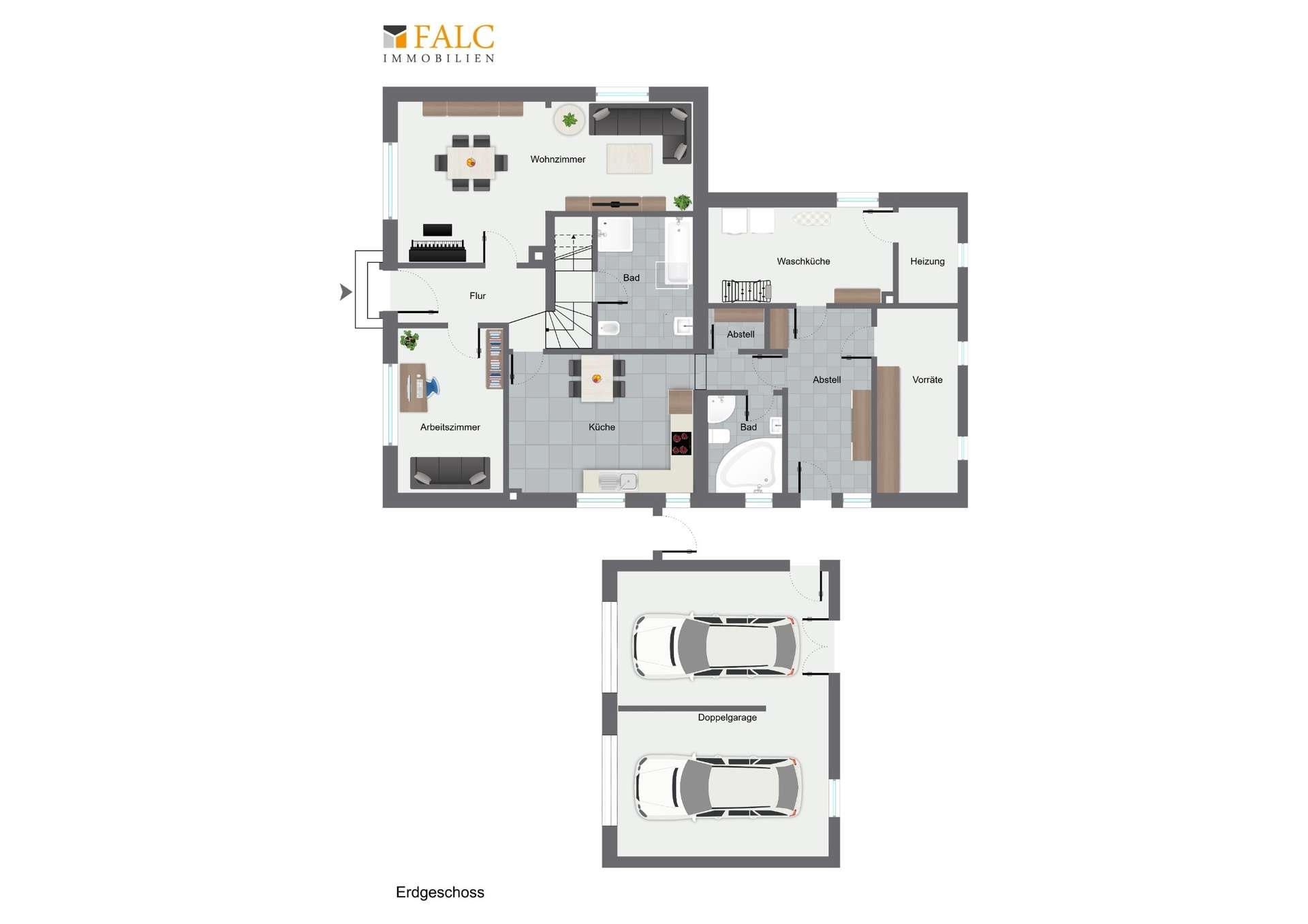 Im Erdgeschoss erwartet Sie ein großes, lichtdurchflutetes Wohnzimmer, das viel Platz für eine gemütliche Wohnlandschaft bietet. Die angrenzende Küche mit großzügigem Essbereich bildet den zentralen Familienbereich des Hauses. Zusätzlich steht hier ein Schlafzimmer, alternativ Home-Office, zur Verfügung – ideal für ebenerdiges Wohnen oder als komfortabler Arbeitsbereich.