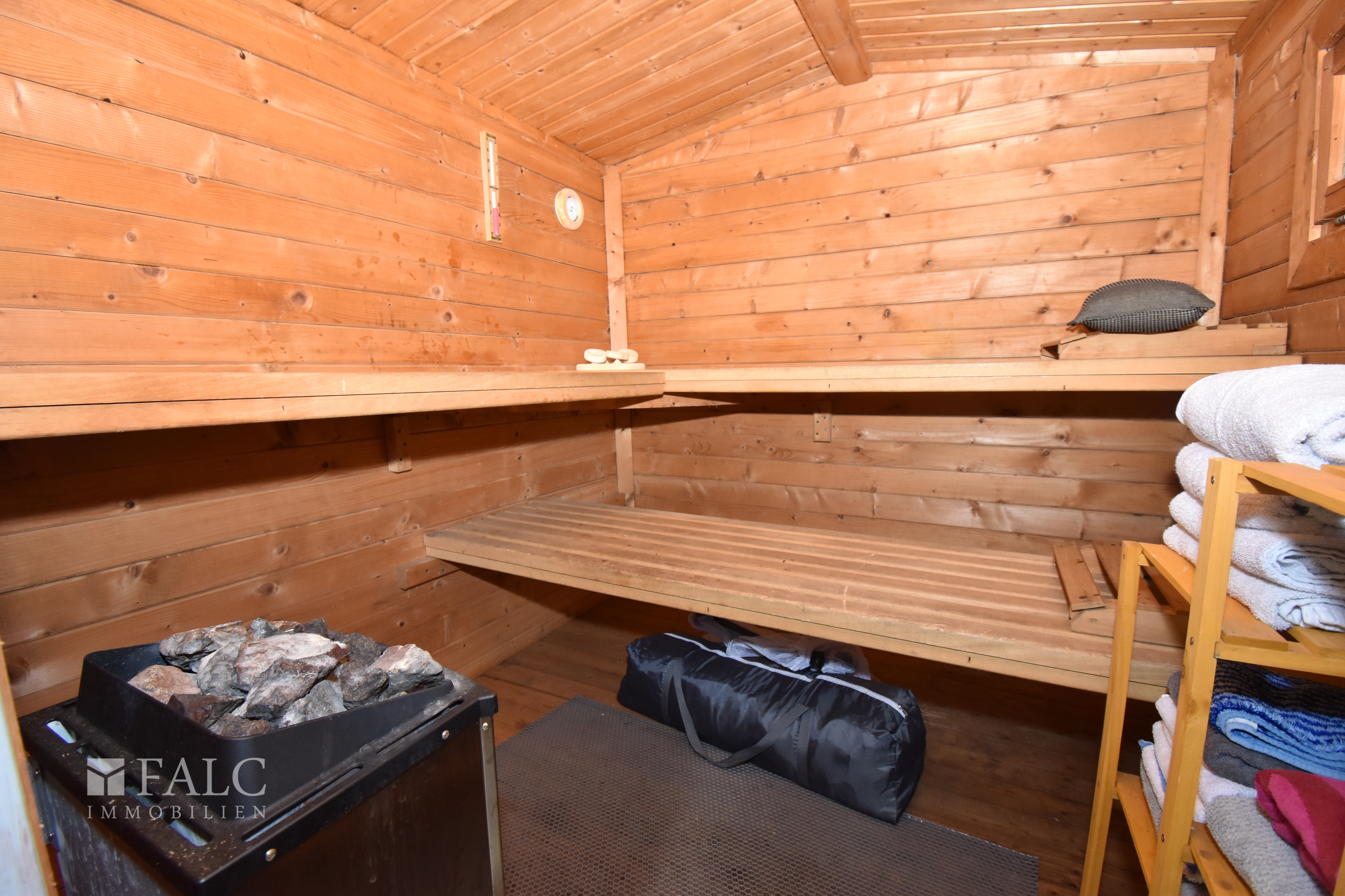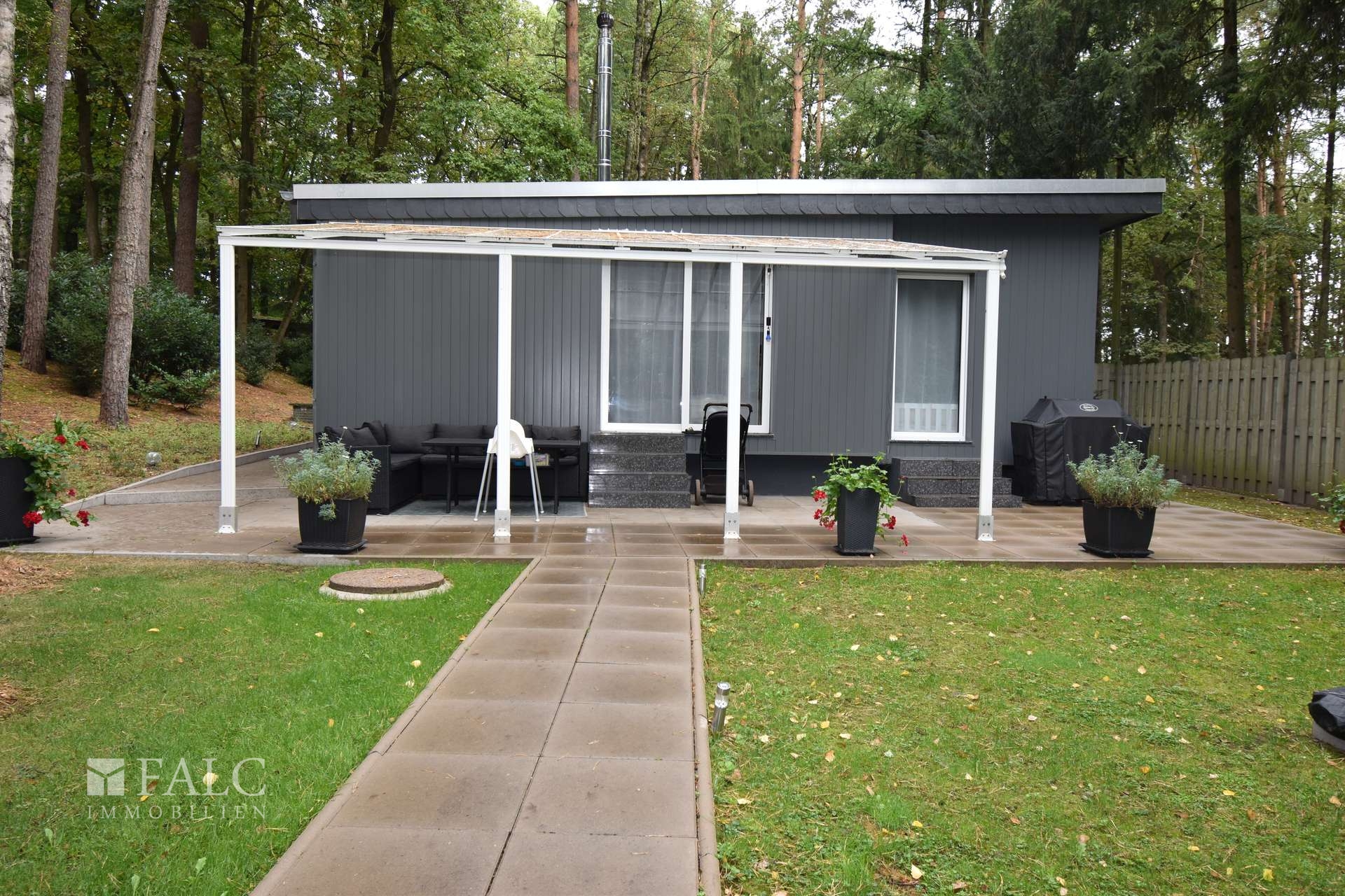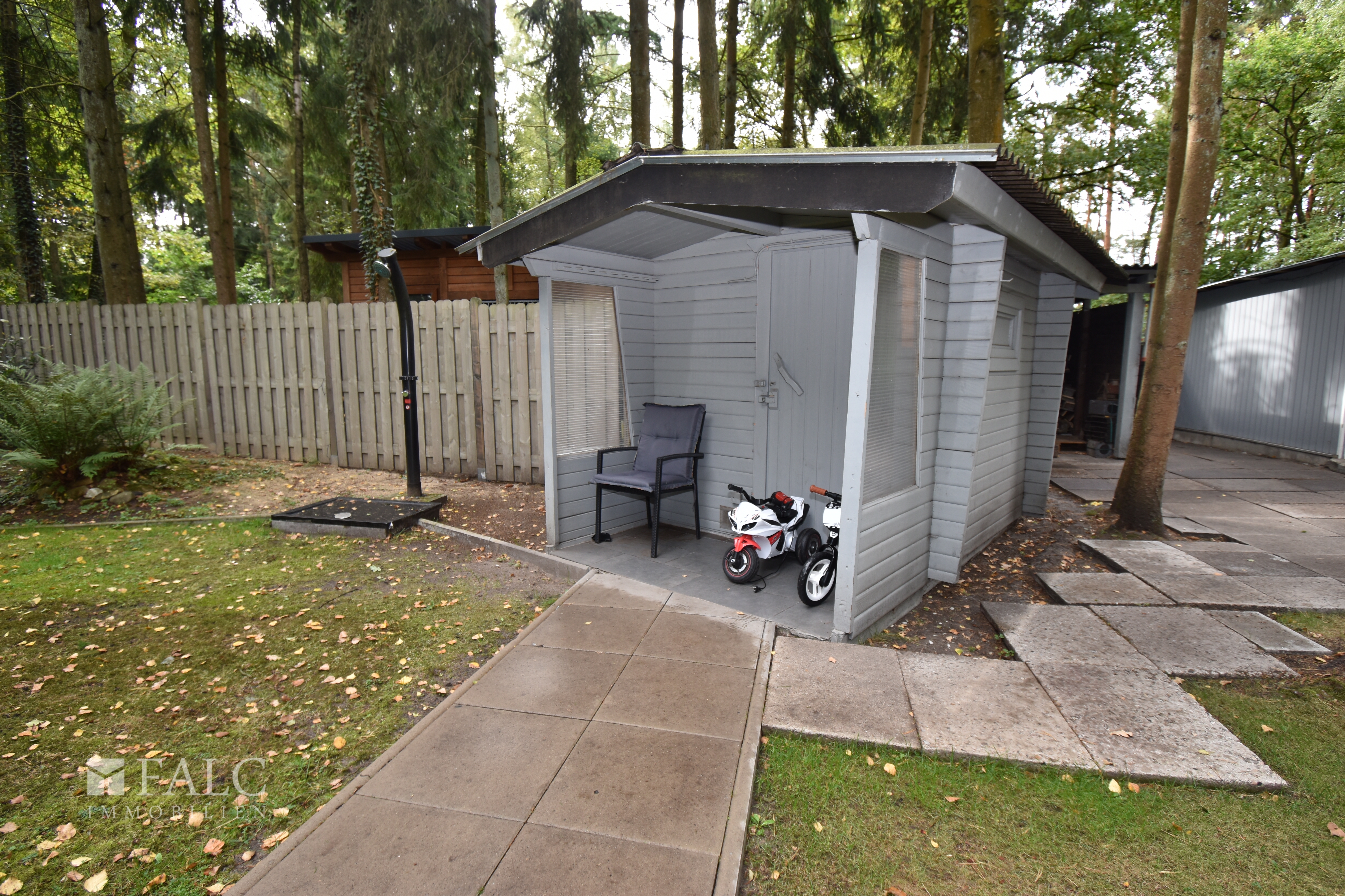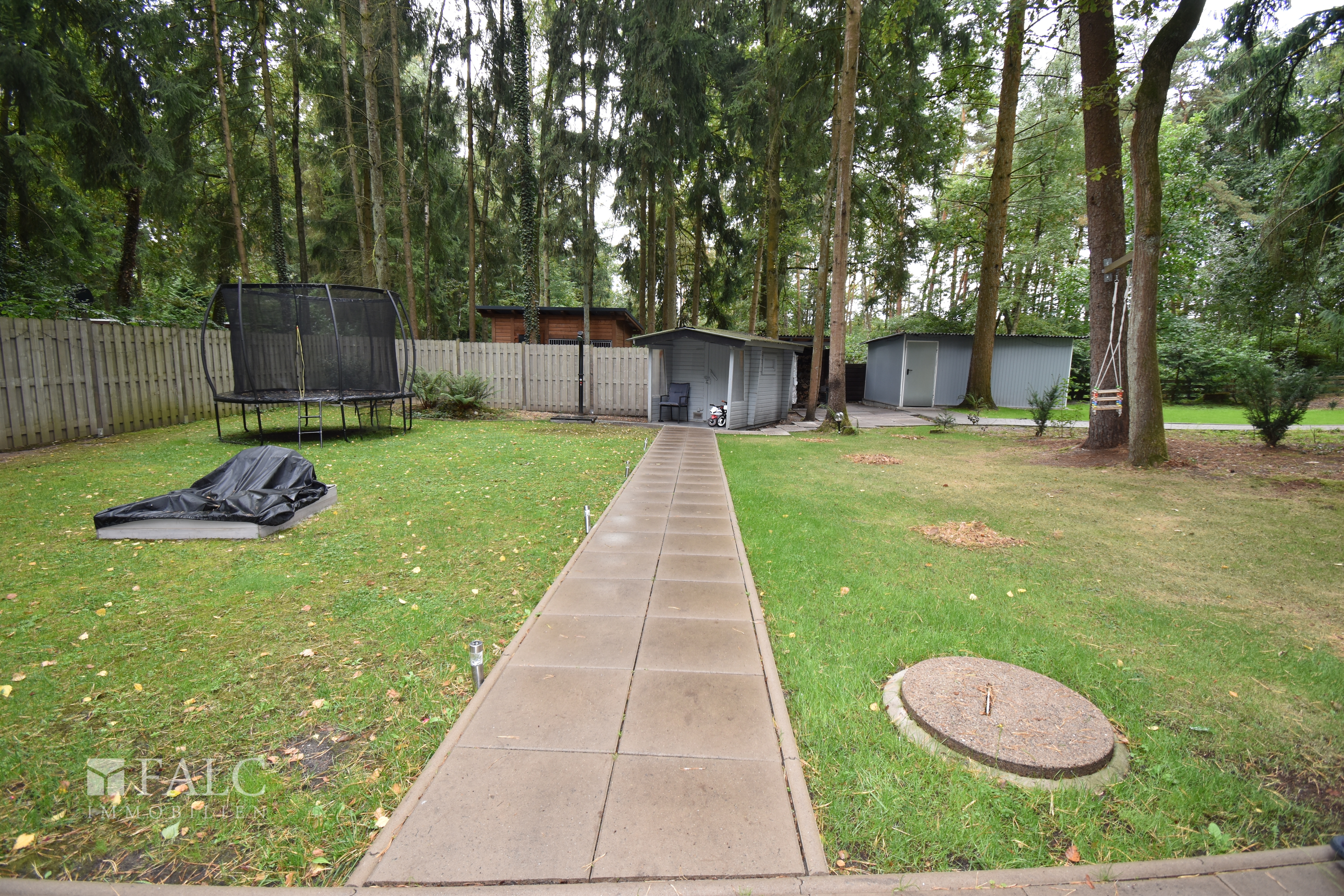 Die großzügige Gartenfläche bietet viele Gestaltungsmöglichkeiten. Und mit der großen überdachten Terrasse hinter dem Haus genießen Sie auch bei Regen komfortable Außenbereiche. Eine Außensauna ergänzt das Wohlbefinden an kühlen Tagen.