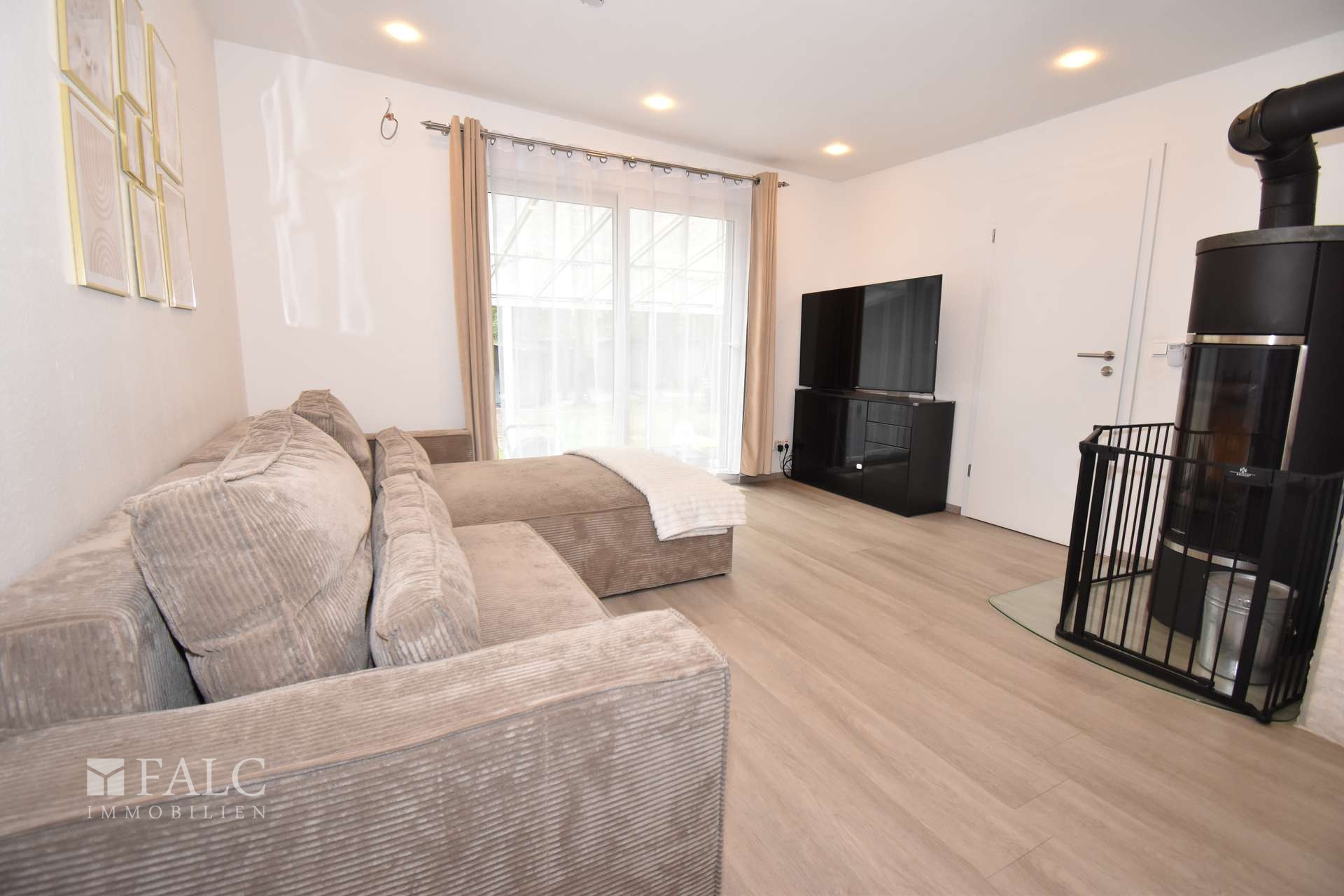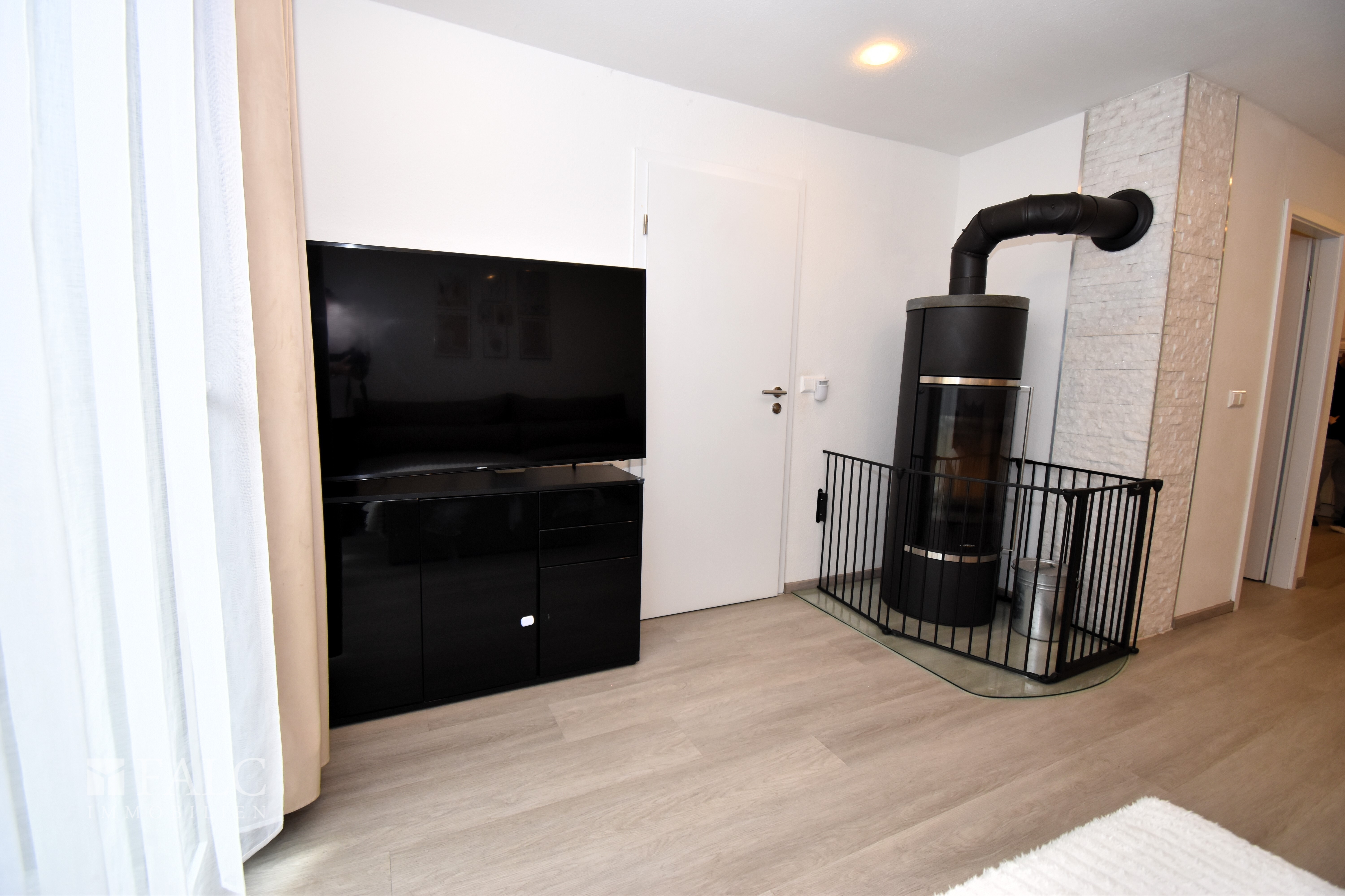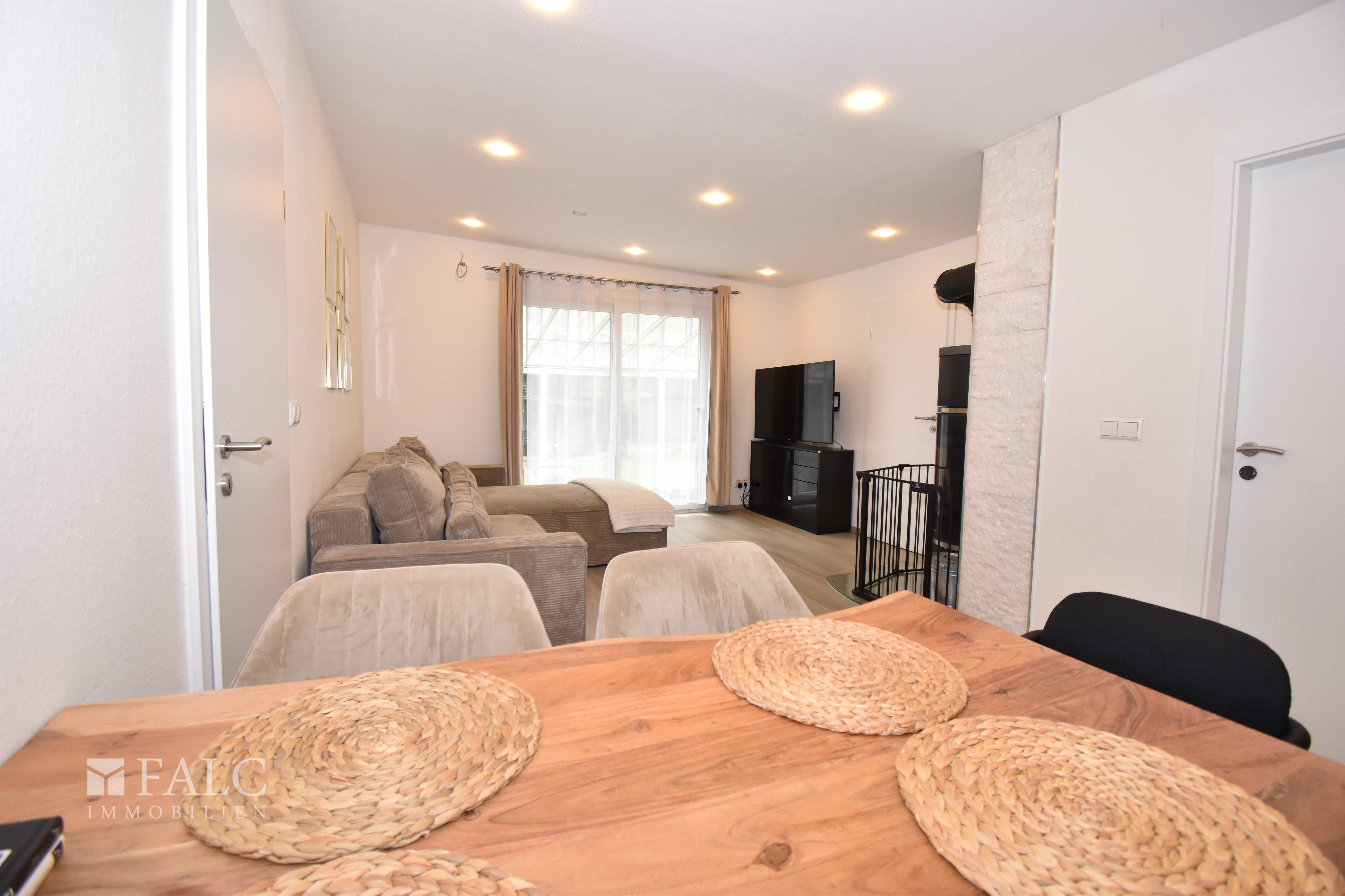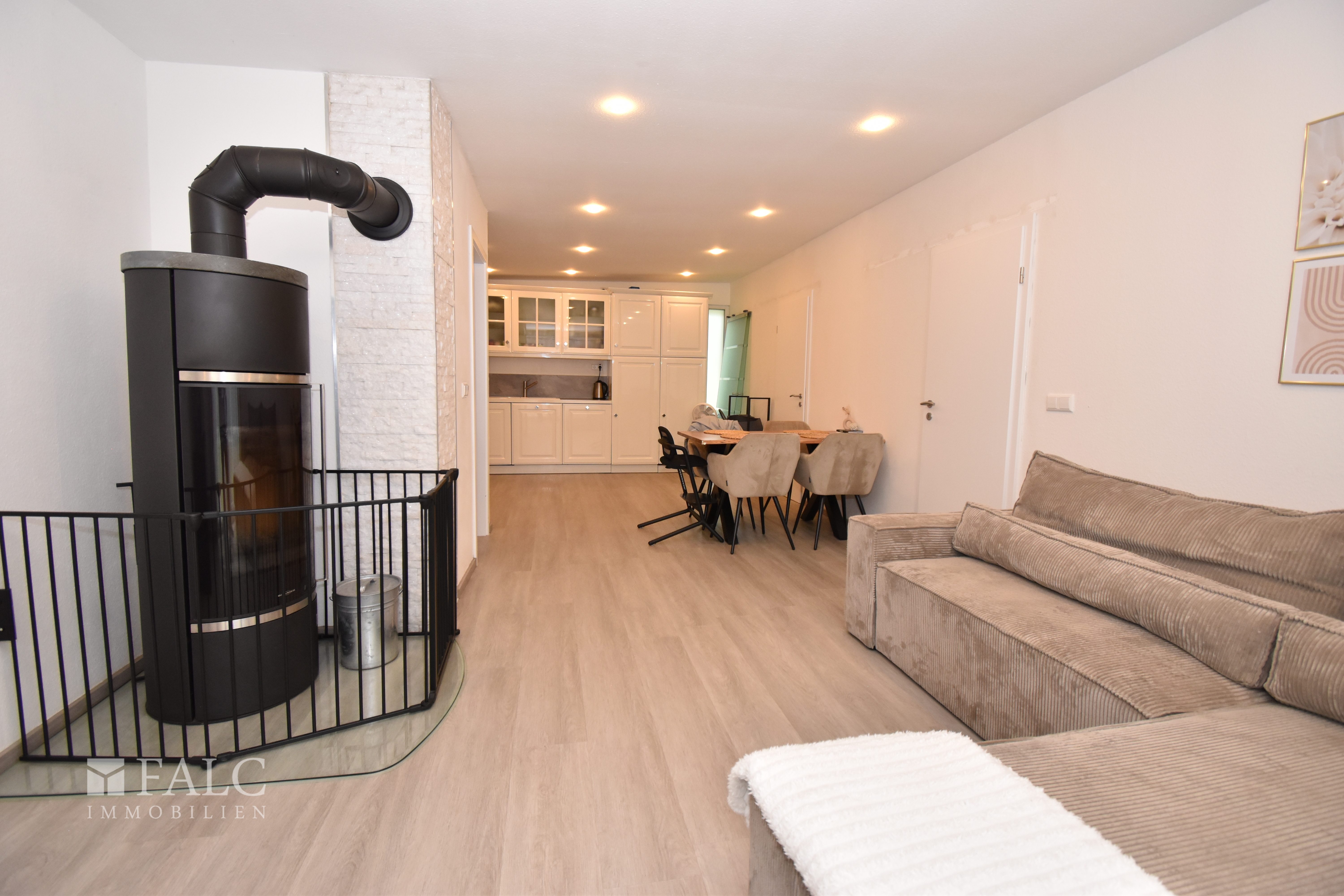Das Herzstück dieses freundlichen Objektes inmitten der Natur bildet das großzügig geschnittene, offene Wohnzimmer mit direktem Anschluss an die moderne Küche und den Essbereich. Durch die offen gestalteten Räume bleibt man stets in Kontakt mit Familie und Freunden. Ein großer Esstisch findet im Wohnbereich ebenso Platz wie eine gemütliche Wohnlandschaft – ideal für gemütliches Beisammensein. Ein hochwertiger Kamin sorgt für gemütliche Abendstunden.