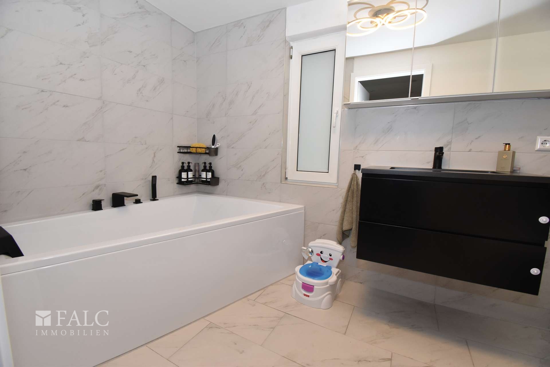 Das helle und moderne Badezimmer mit breiter Badewanne bietet genug Platz für die ganze Familie, und ein Design-Waschtisch sorgt zusätzlich für hohen Komfort.