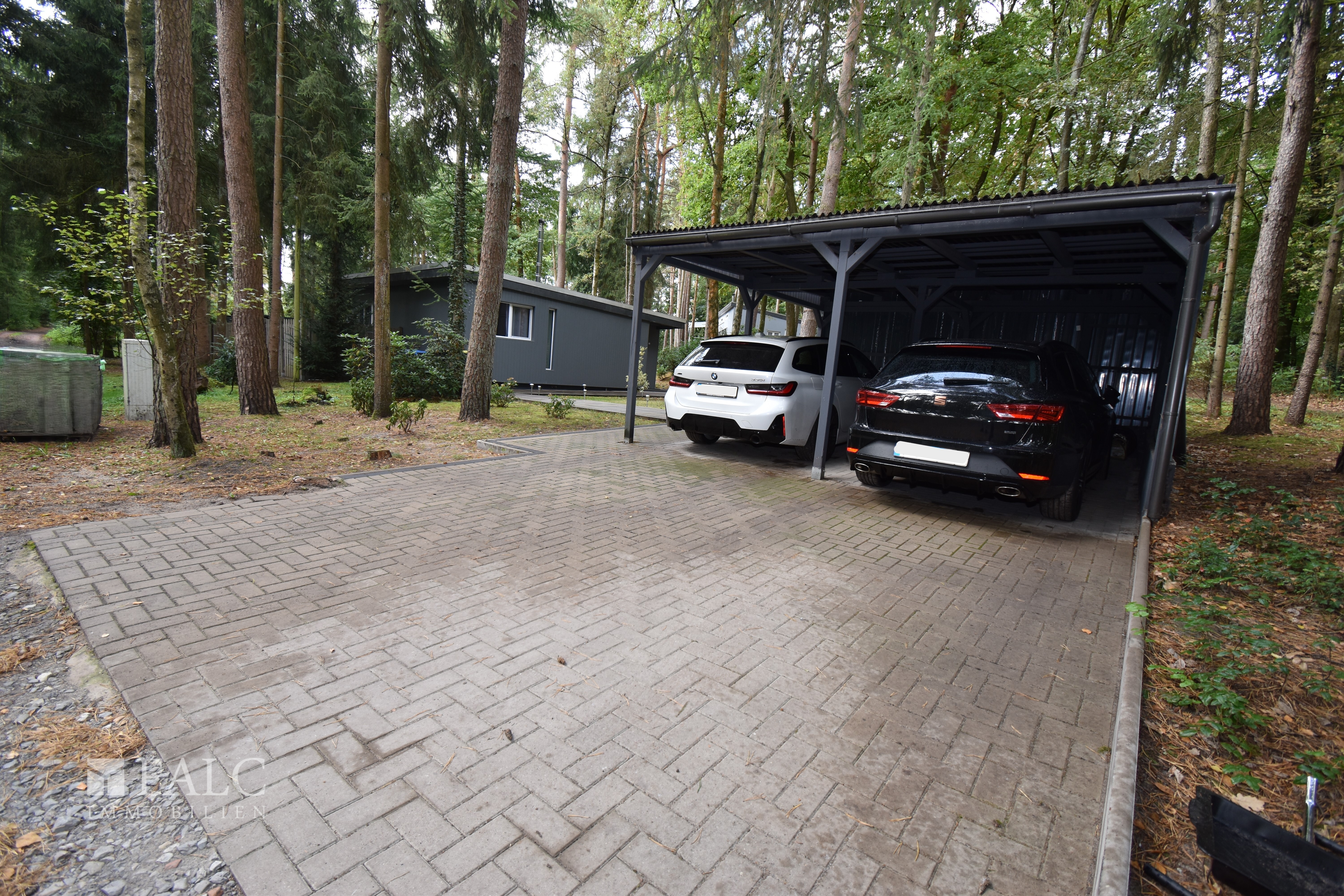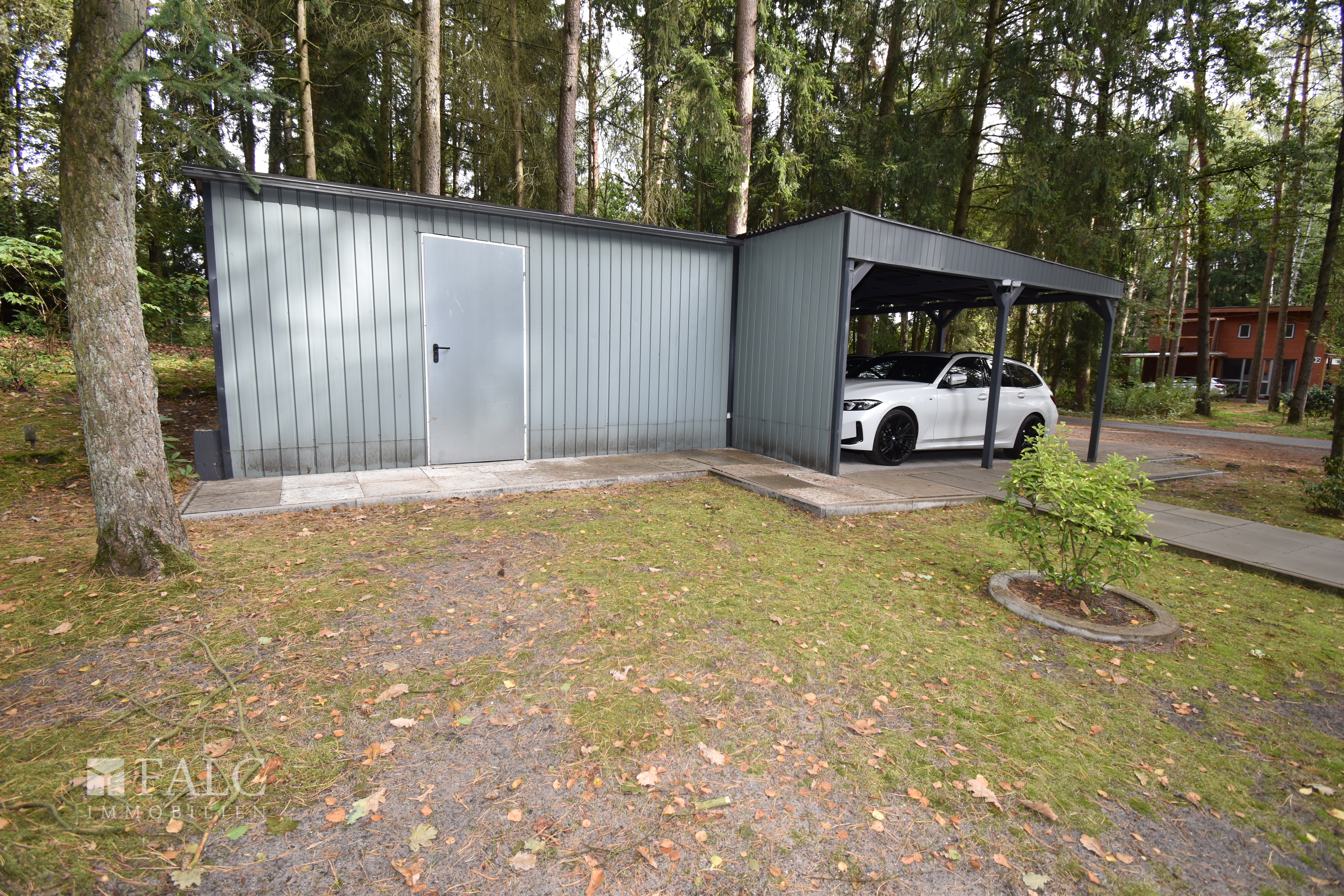 Für Ihre Fahrzeuge steht ein Doppel-Carport mit Anbau, z. B. für Gartengeräte, zur Verfügung.