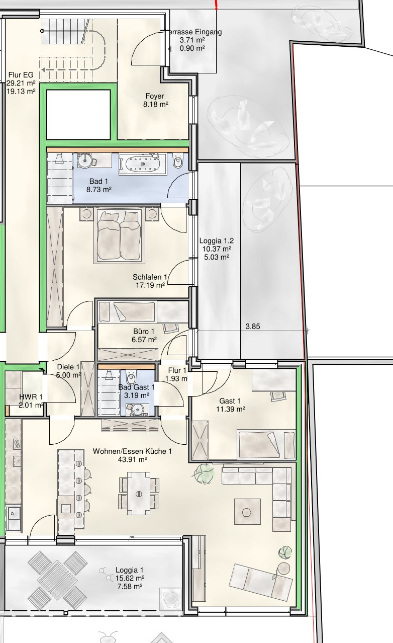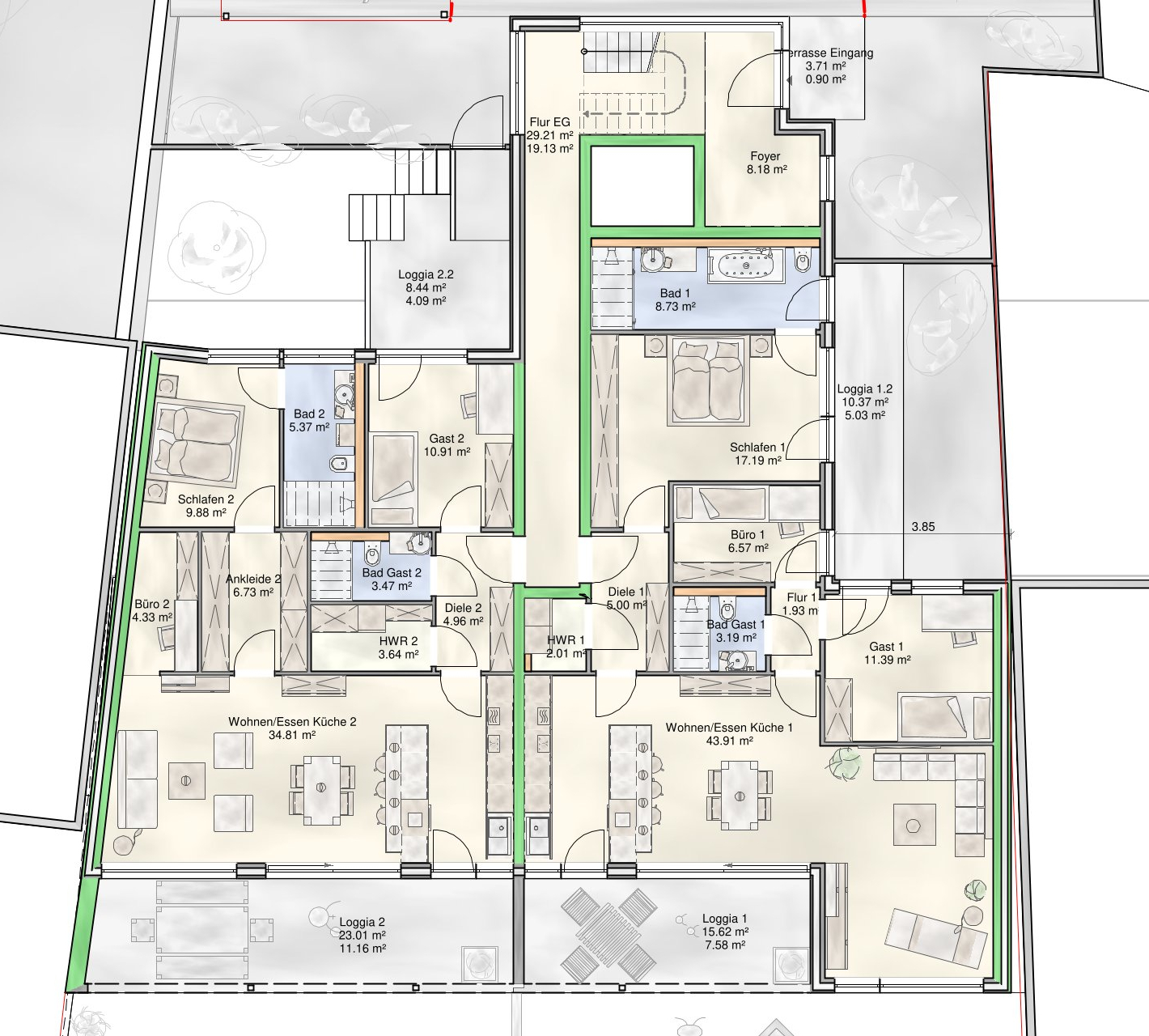 Es besteht die Möglichkeit, Materialien, Bad-Design, Küchenlösungen und Grundrisse individuell an Ihre Wünsche anzupassen, abhängig vom Baufortschritt und den Bauträgerbedingungen.