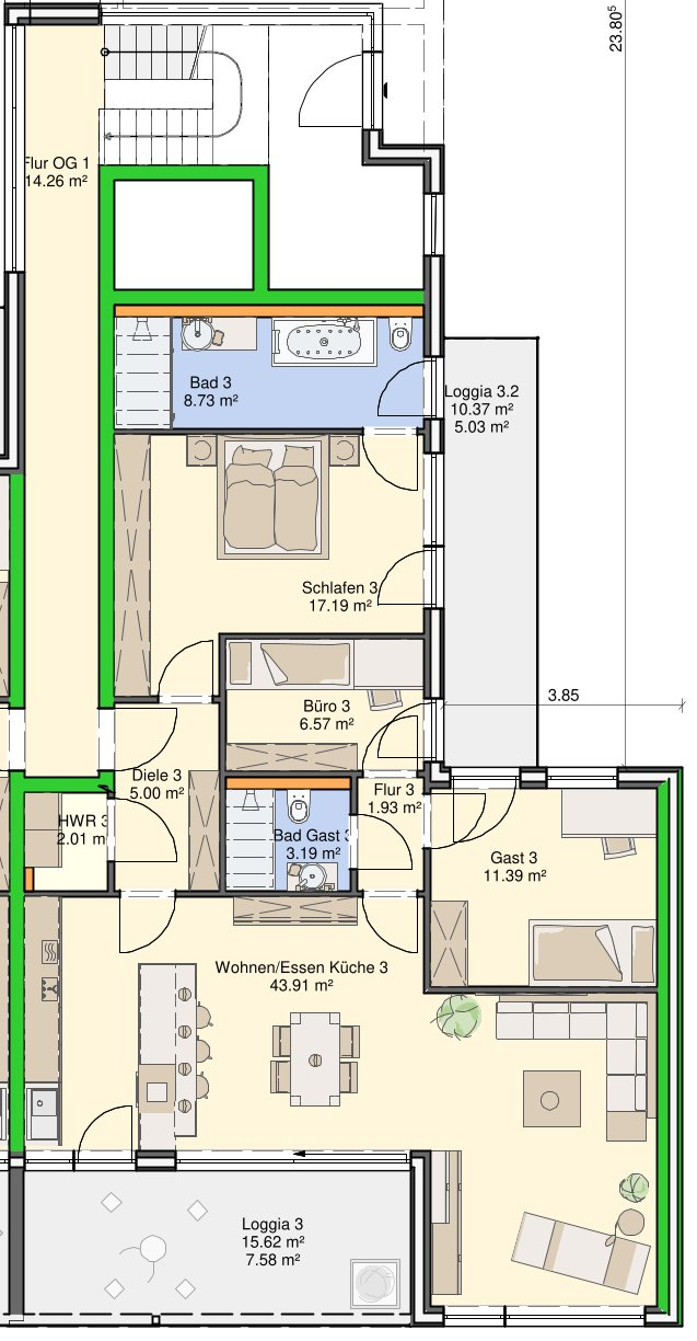 Es besteht die Möglichkeit, Materialien, Bad-Design, Küchenlösungen und Grundrisse individuell an Ihre Wünsche anzupassen, abhängig vom Baufortschritt und den Bauträgerbedingungen.