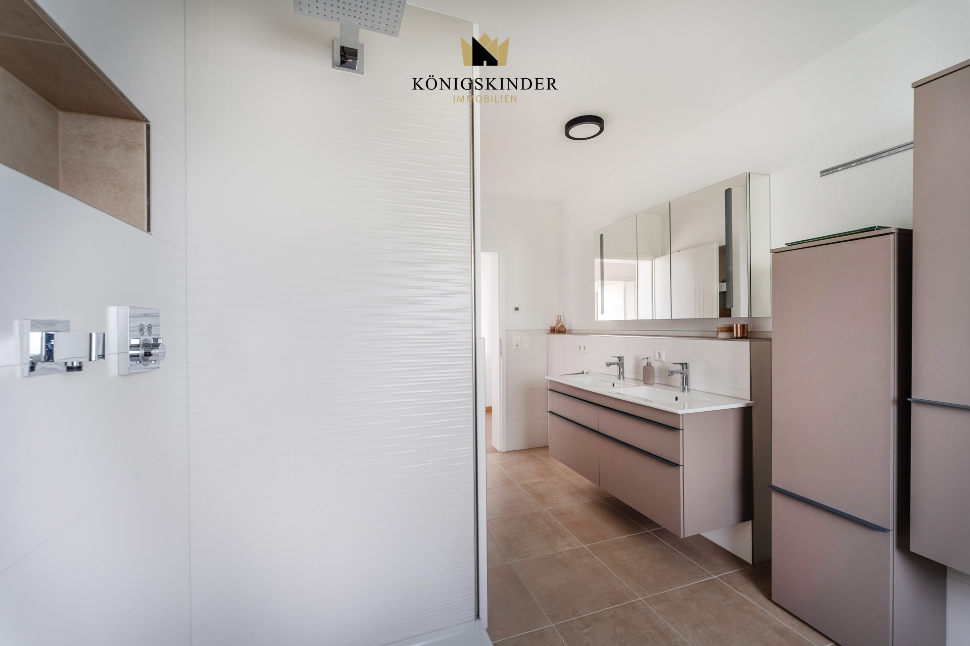 Wenn Sie eintreten, könnte es sein, dass Sie gleich einziehen möchten: Im Erdgeschoss öffnet sich ein sehr geräumiger Eingangsbereich, sowie großzügiger Wohnraum mit bodentiefen Fenstern nach Süden zur Terrasse - dazu die Küche in Creme-Farbe, mit einer hochwertiger Einrichtung und allen notwendigen Geräten - Sehr praktisch: der zusätzliche Abstellraum (Speise) - üppig Platz für die Vorräte und mehr. Ein Gästezimmer und ein separates Duschbad ergänzen das Erdgeschoss ferner ist der direkte Zugang zur Doppelgarage möglich.