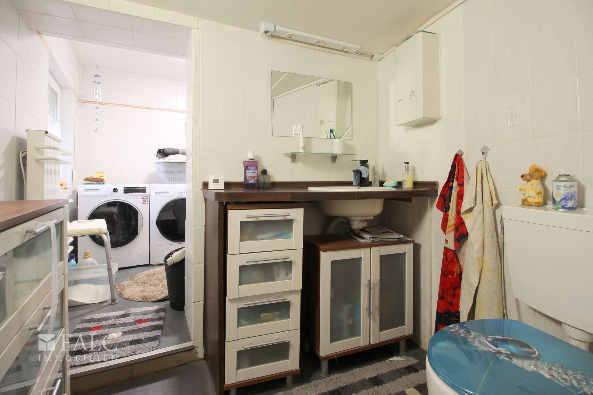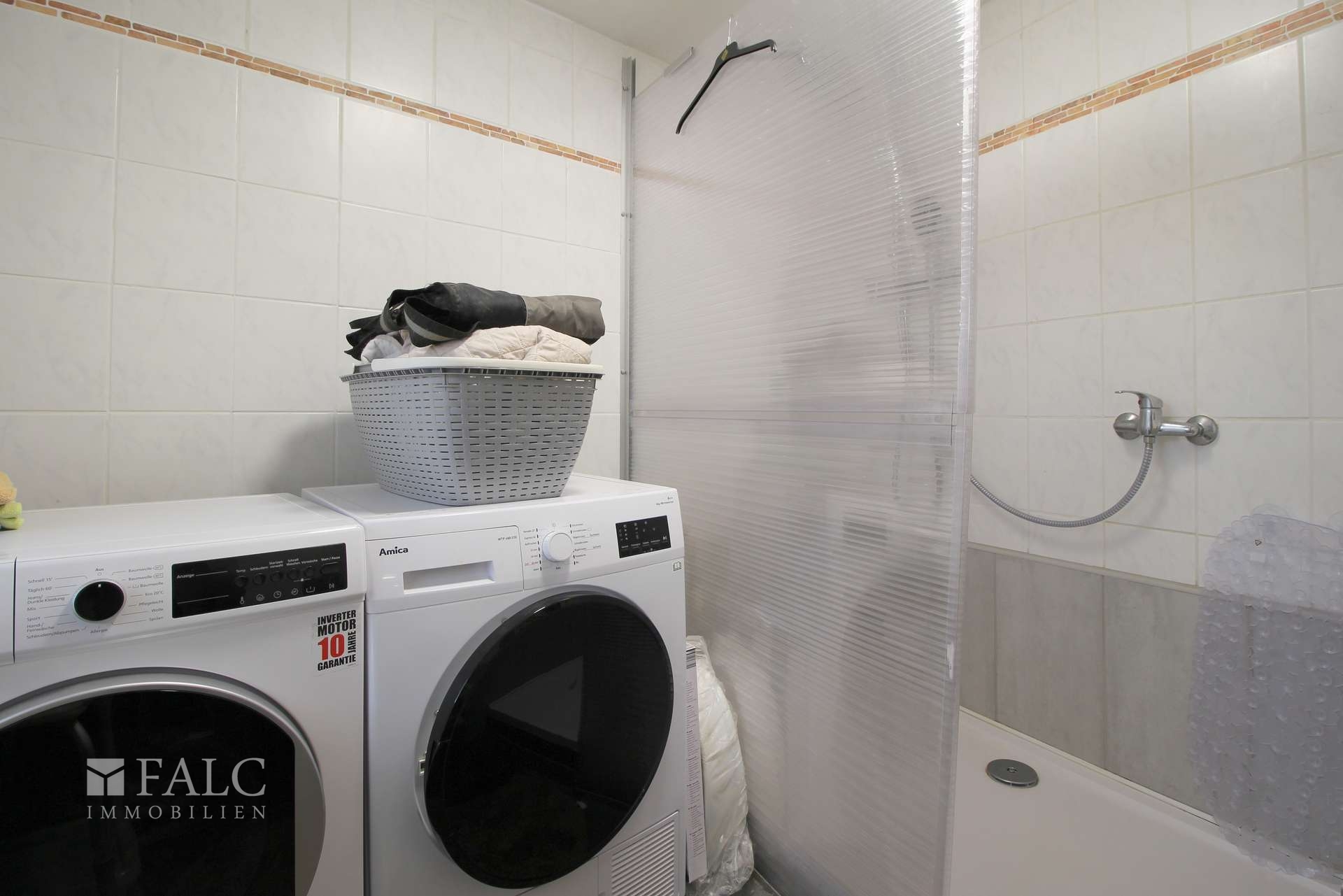 Die Wände im Wohnzimmer sind in neutralen Tönen gehalten, was eine angenehme Atmosphäre schafft. Der Pelletofen sorgt für wohlige Wärme. Das Badezimmer ist praktisch eingerichtet und verfügt über eine Dusche sowie einen Waschmaschinenanschluss. Die hellen Fliesen tragen zur freundlichen Ausstrahlung des Raumes bei.