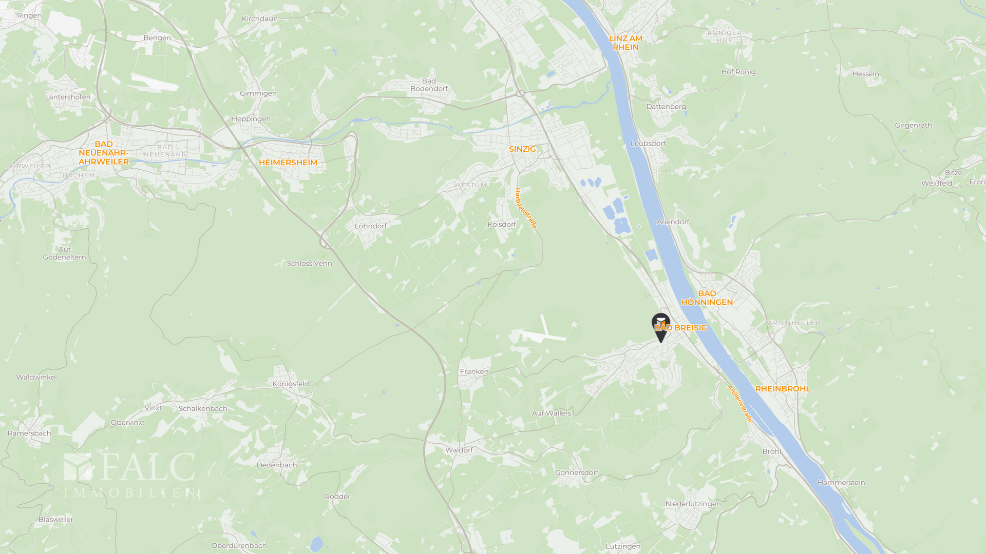Bad Breisig liegt im romantischen Rheintal zwischen Bonn und Koblenz an der Bundesstraße 9, umgeben von der vulkangeprägten Landschaft der Osteifel und dem durch Weinbau bekannten Gebiet der Ahreifel.