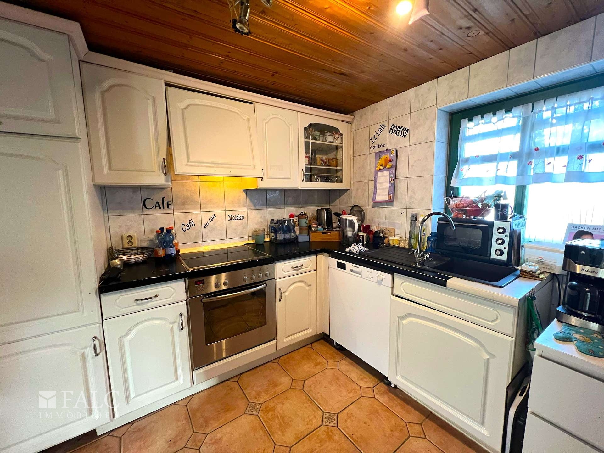 Schon beim Betreten empfängt Sie ein freundliches Foyer mit warmen Holzelementen, das eine angenehme Atmosphäre schafft. Die Küche kombiniert klassische weiße Schränke mit modernen Geräten und bietet reichlich Platz für kulinarische Kreationen. Fliesen und eine stilvolle Holzdecke verleihen dem Raum einen charmanten, rustikalen Touch, während das Fenster für viel natürliches Licht sorgt.
