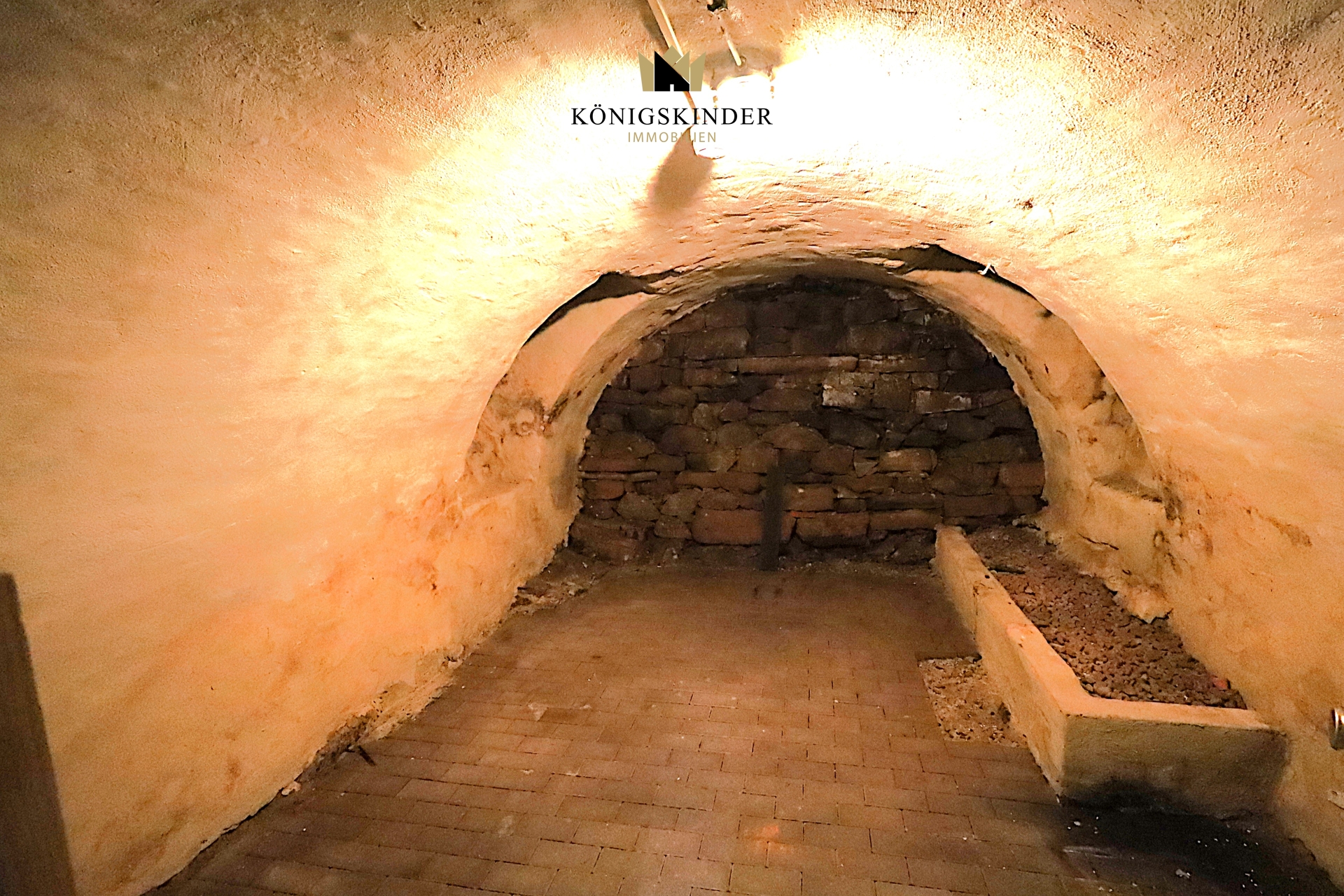 Das Gebäude ist komplett unterkellert mit einem Sandsteingemäuer von ca. 1,12 m Mauerwandstärke und einem Gewölbekeller, angefügt ist ein ebenerdig begehbarer Sanitärbereich und der Heizungsraum.