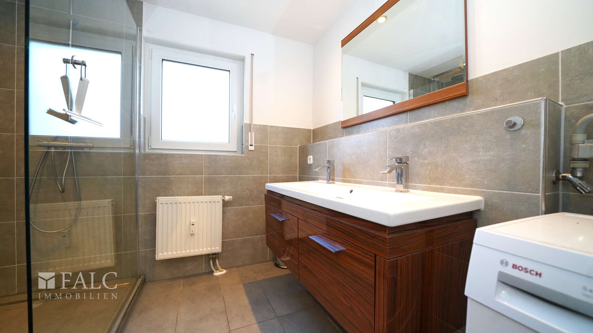 Das Badezimmer wurde im Jahr 2019 vollständig renoviert und modern gestaltet. Es verfügt über eine großzügige, bodengleiche und begehbare Dusche mit moderner Glastrennwand. Großformatige, pflegeleichte Fliesen in elegantem Anthrazit unterstreichen das zeitgemäße Design. Zur weiteren Ausstattung gehören ein Doppelwaschbecken mit großem Spiegel sowie ein praktischer Waschmaschinenanschluss.