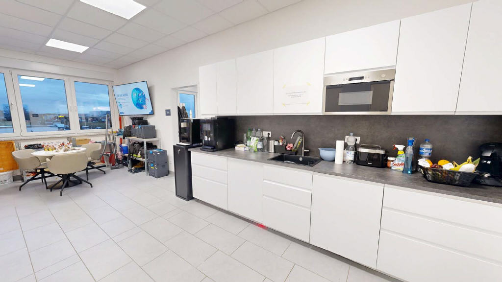 Ca. 132 m² Bürofläche mit WC-Anlage, Abstellraum und Teeküche. Über wenige Stufen erreichen Sie das 1. Obergeschoss links (mit Fahrstuhl).