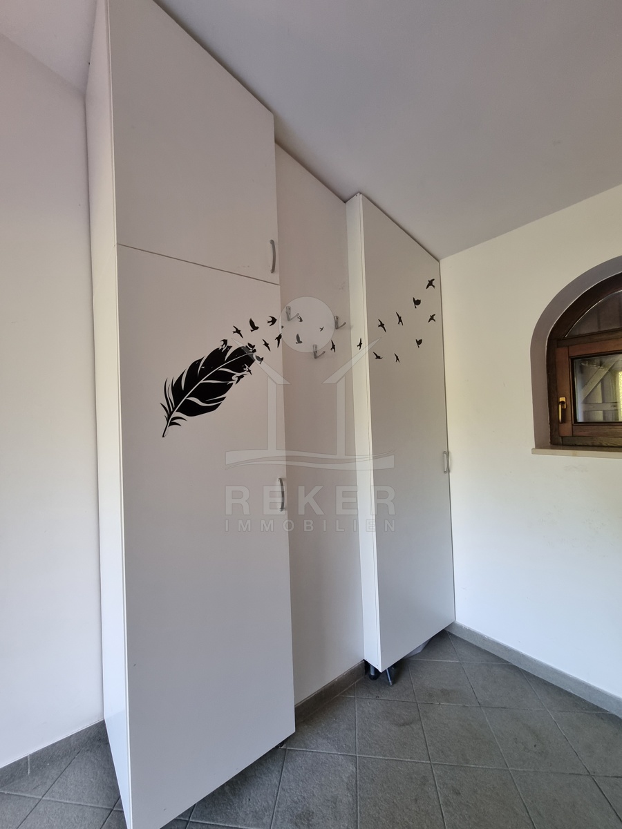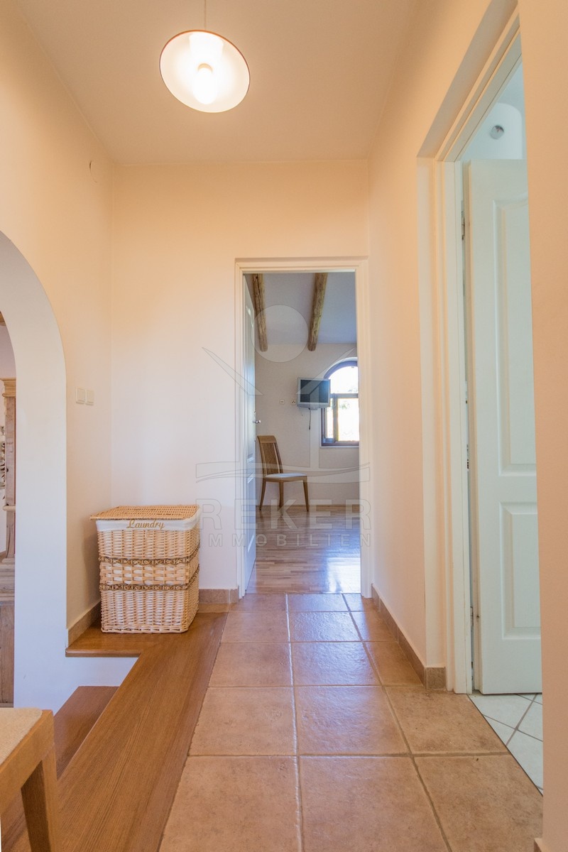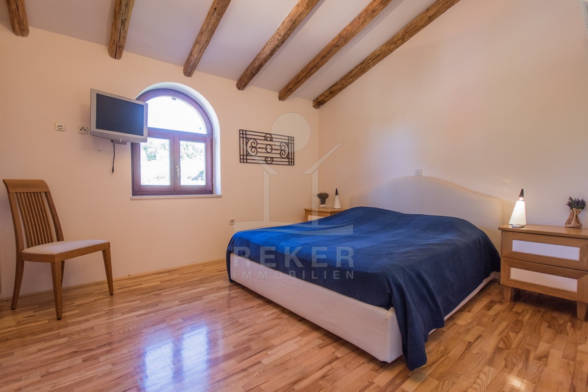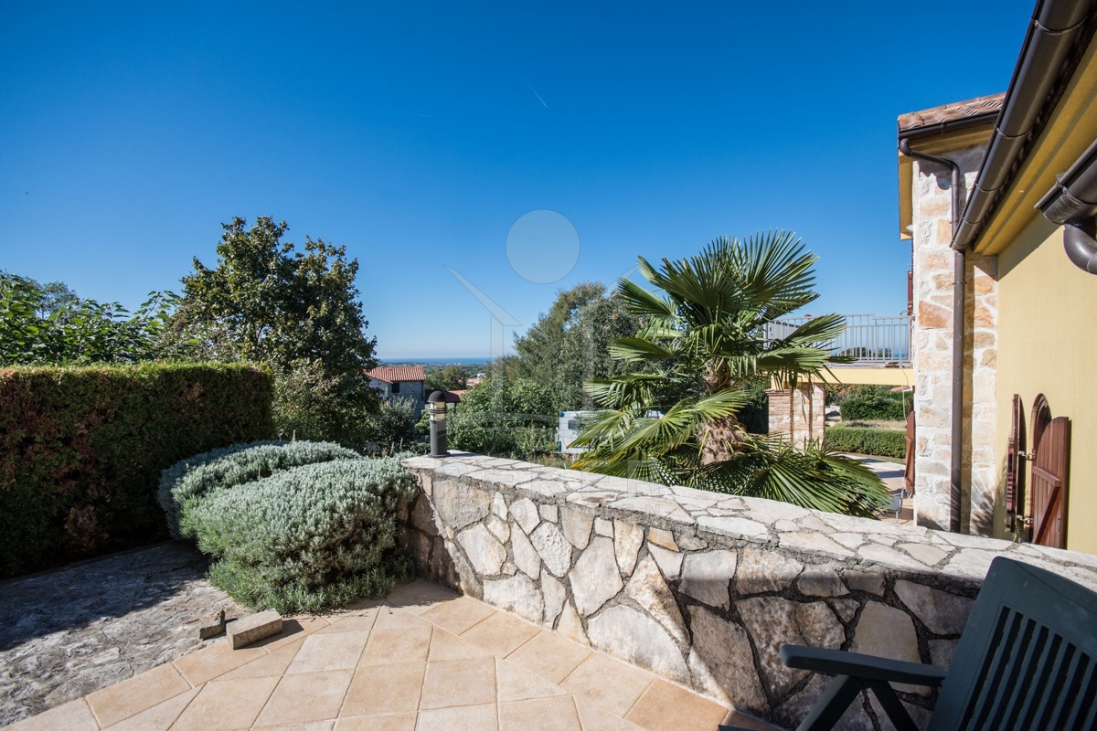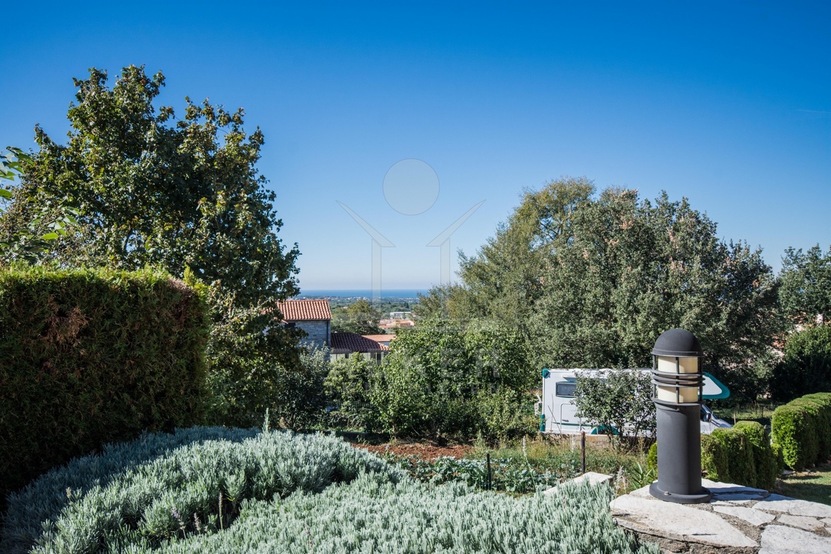 Auf einem Hügel in einem istrischen Ort nahe Poreč steht dieses gepflegte Einfamilienhaus mit weitem Panoramablick auf das Meer. Die Strände erreichen Sie nach rund 10.000 m. Einkaufsmöglichkeiten, Schule und Stadtzentrum sind gut angebunden. Obwohl das Haus baulich als Doppelhaushälfte ausgeführt ist, nutzen Sie eine eigene Zufahrt und einen separaten Zugang. Das sorgt für spürbare Privatsphäre. Auf dem 400 m² großen Grundstück stehen gepflasterte Stellflächen und eine Garage zur Verfügung.