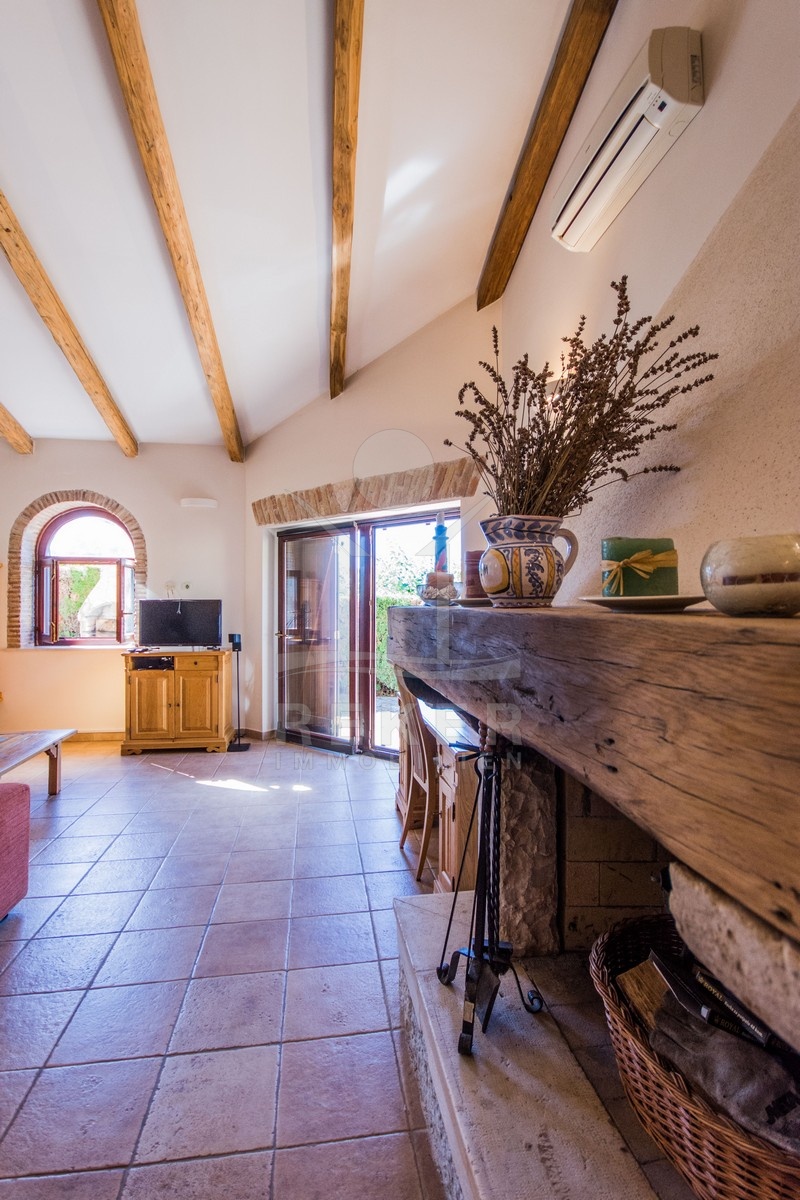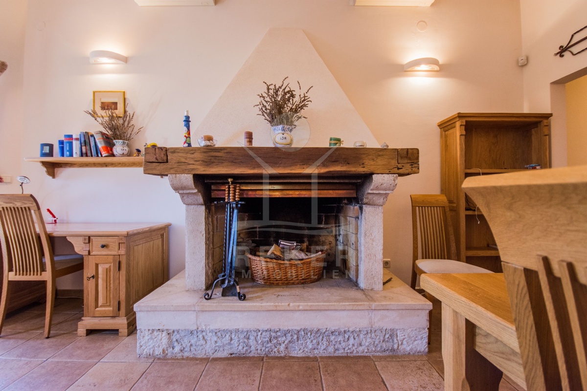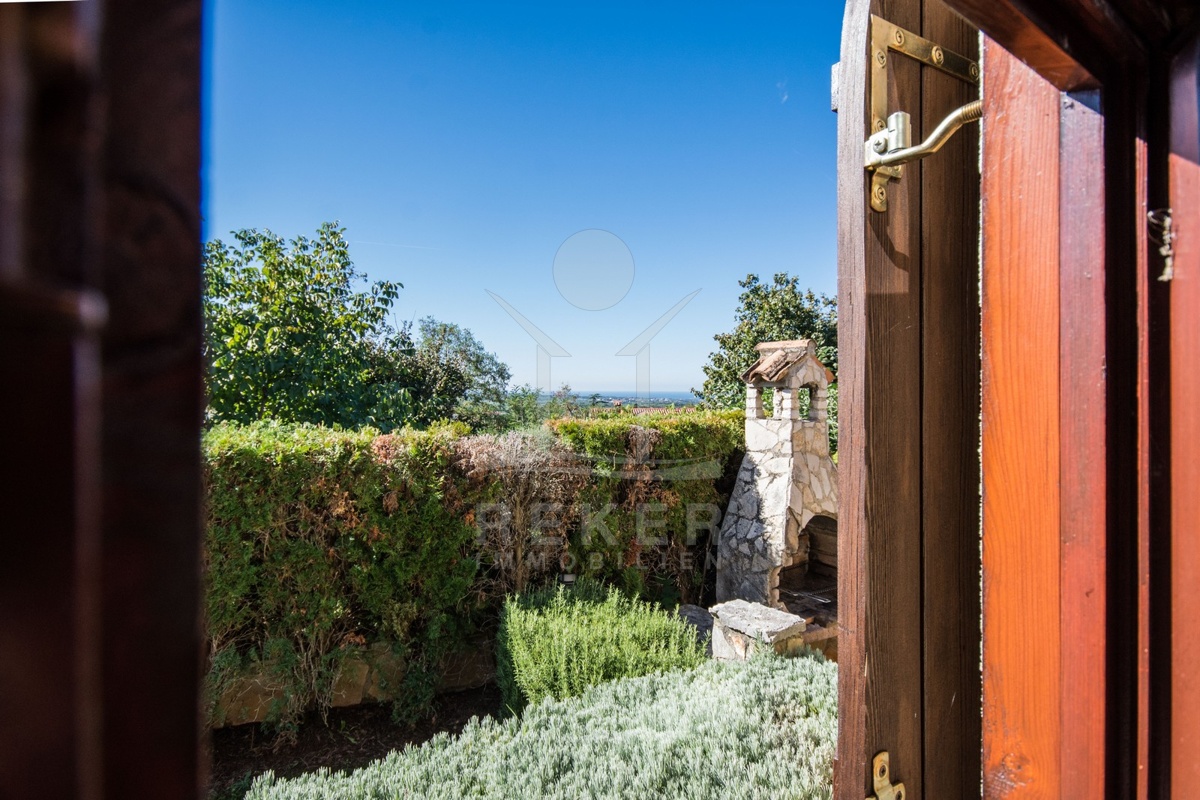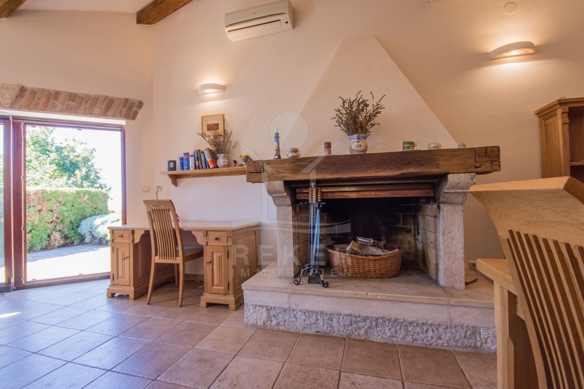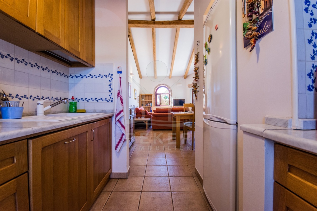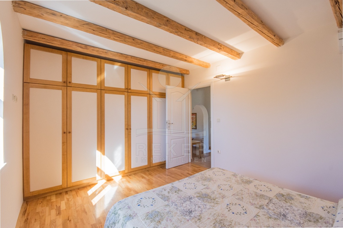 Auf einem Hügel in einem istrischen Ort nahe Poreč steht dieses gepflegte Einfamilienhaus mit weitem Panoramablick auf das Meer. Die Strände erreichen Sie nach rund 10.000 m. Einkaufsmöglichkeiten, Schule und Stadtzentrum sind gut angebunden. Obwohl das Haus baulich als Doppelhaushälfte ausgeführt ist, nutzen Sie eine eigene Zufahrt und einen separaten Zugang. Das sorgt für spürbare Privatsphäre. Auf dem 400 m² großen Grundstück stehen gepflasterte Stellflächen und eine Garage zur Verfügung.