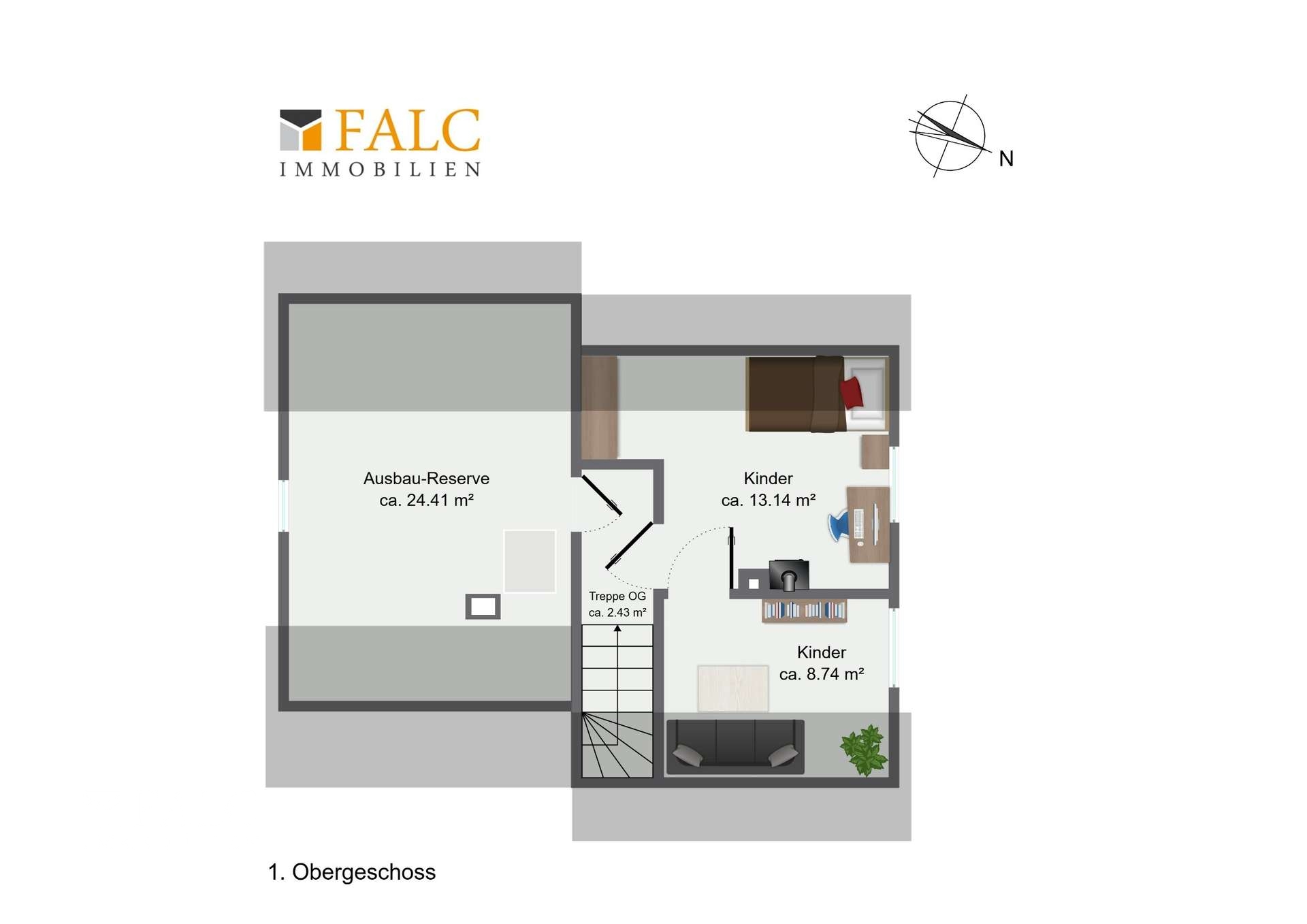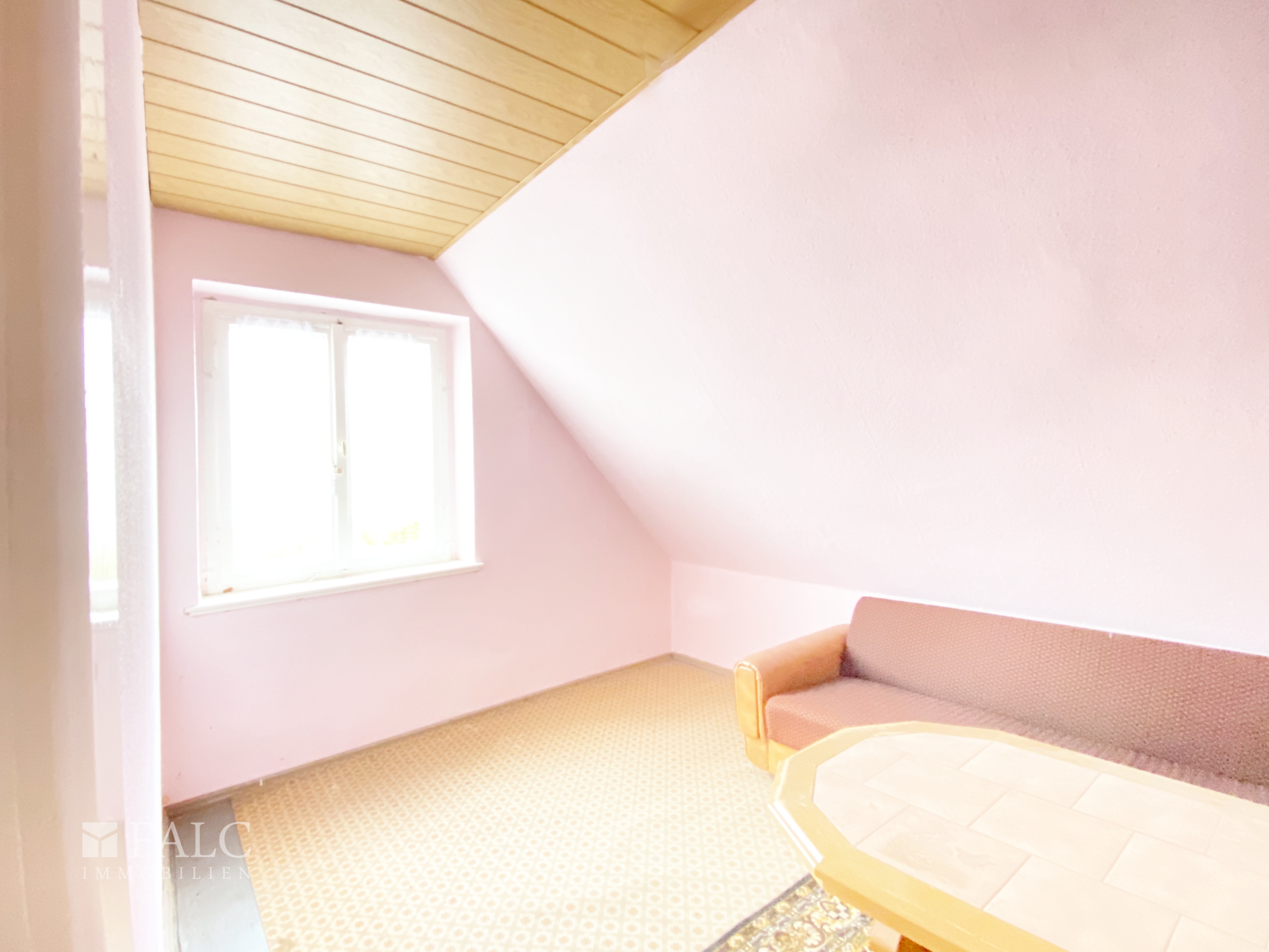 Über eine Treppe gelangen Sie in das Obergeschoss, wo sich zwei weitere Zimmer befinden. Diese eignen sich hervorragend als Kinderzimmer oder Büro. Ein besonderes Highlight ist die Ausbaureserve im Dachgeschoss, die Ihnen die Möglichkeit bietet, zusätzlichen Wohnraum zu schaffen.