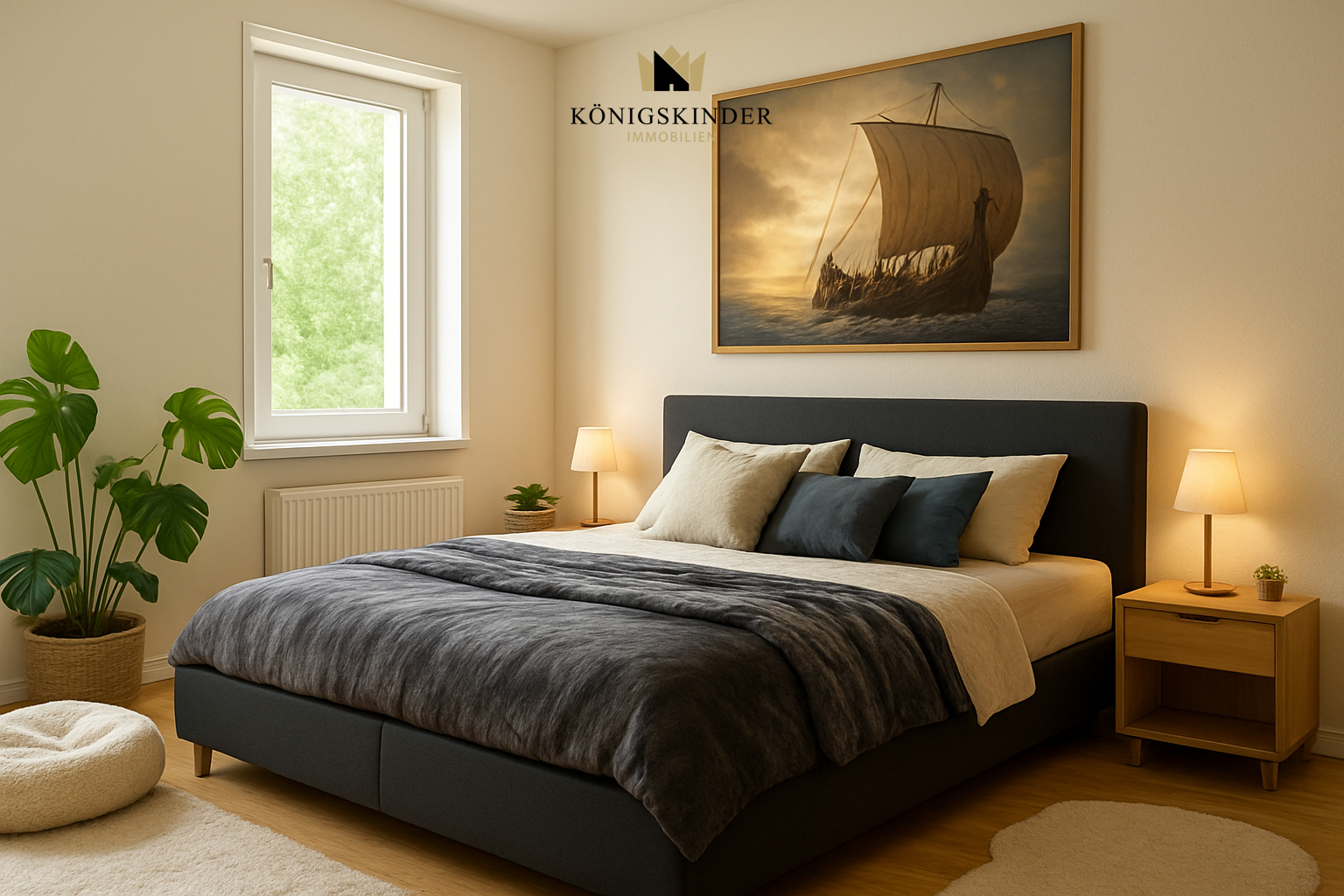 Das Schlafzimmer liegt geschützt und angenehm zurückgezogen. Von hier aus führt der Weg direkt auf die Terrasse, ein kleiner privater Außenraum, der dem Wohnen eine besondere Tiefe gibt. Ein Ort für den ersten Kaffee, frische Luft oder einen ruhigen Tagesausklang.