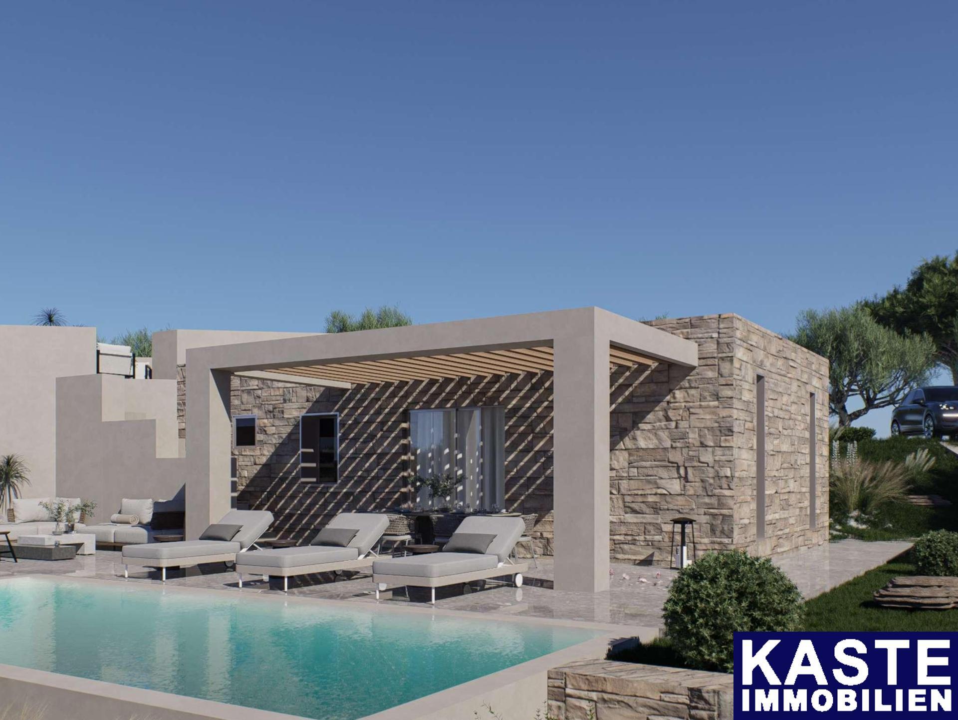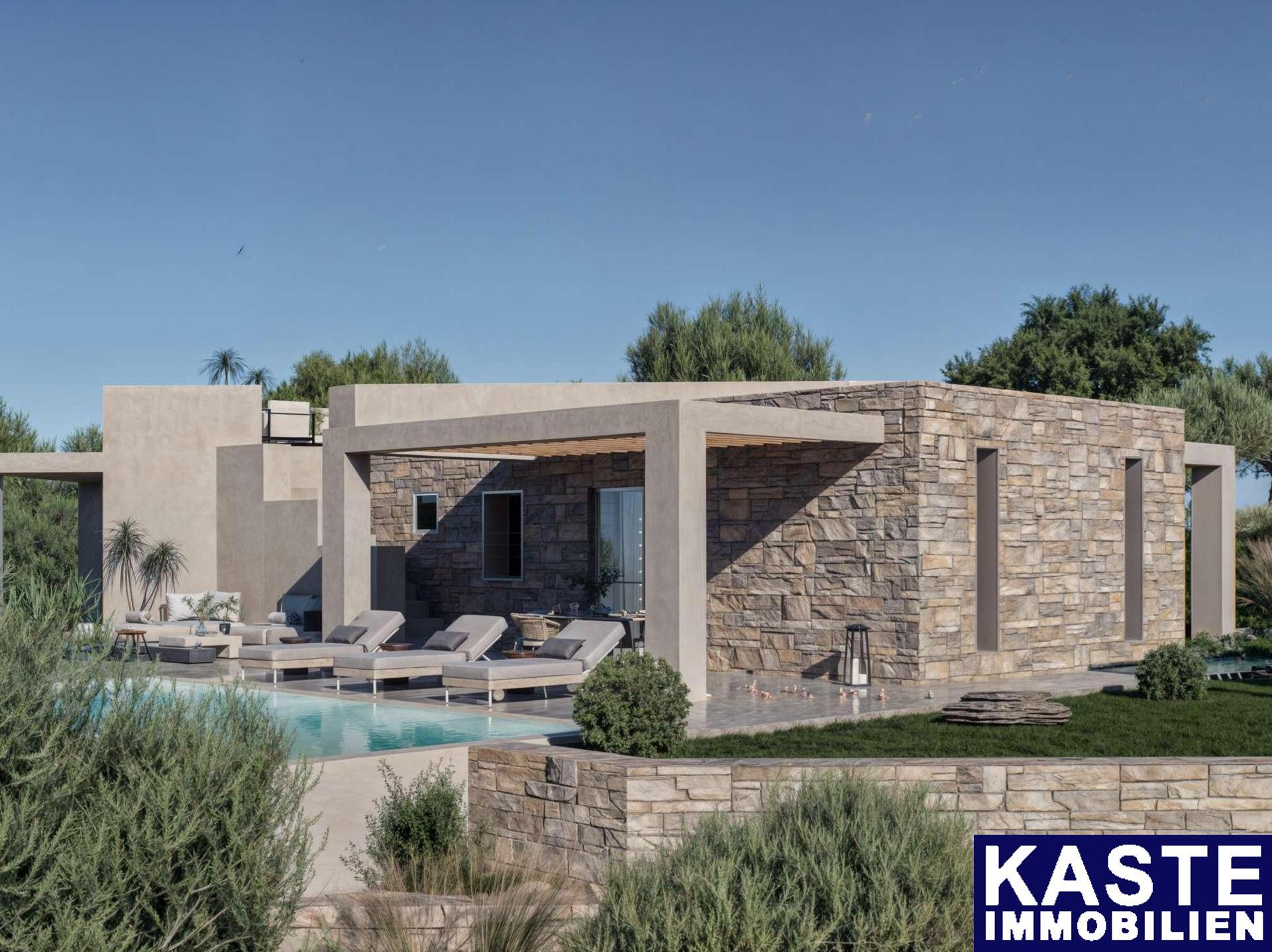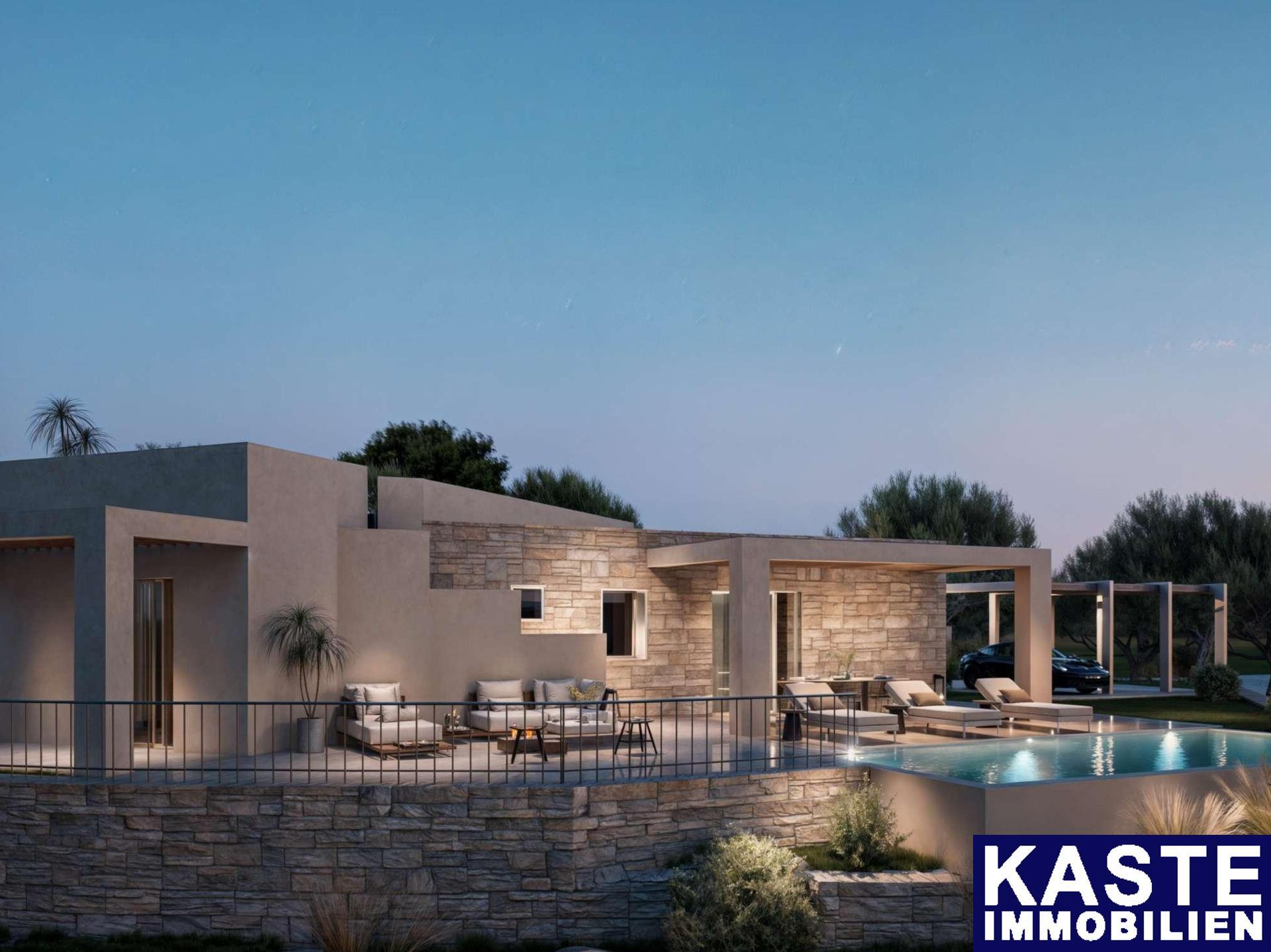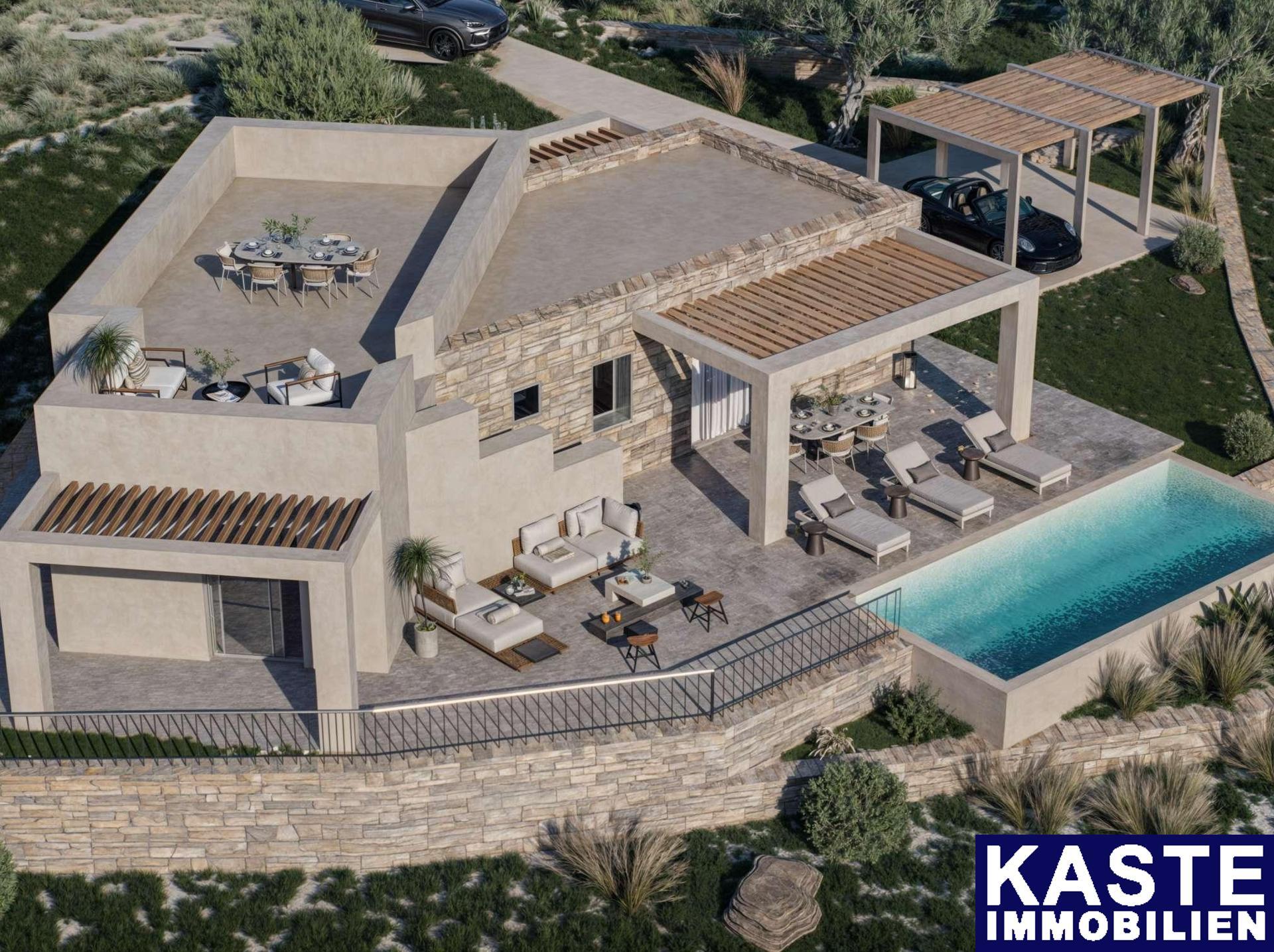 Diese moderne Steinvilla im Erstbezug mit einem Schwimmbad befindet sich im Bau und steht zum Verkauf in der Nähe von Bali, Rethymno. Das ebenerdige Haus erstreckt sich über großzügige 123,75 Quadratmeter auf einem individuellen Grundstück von 706,94 Quadratmetern.