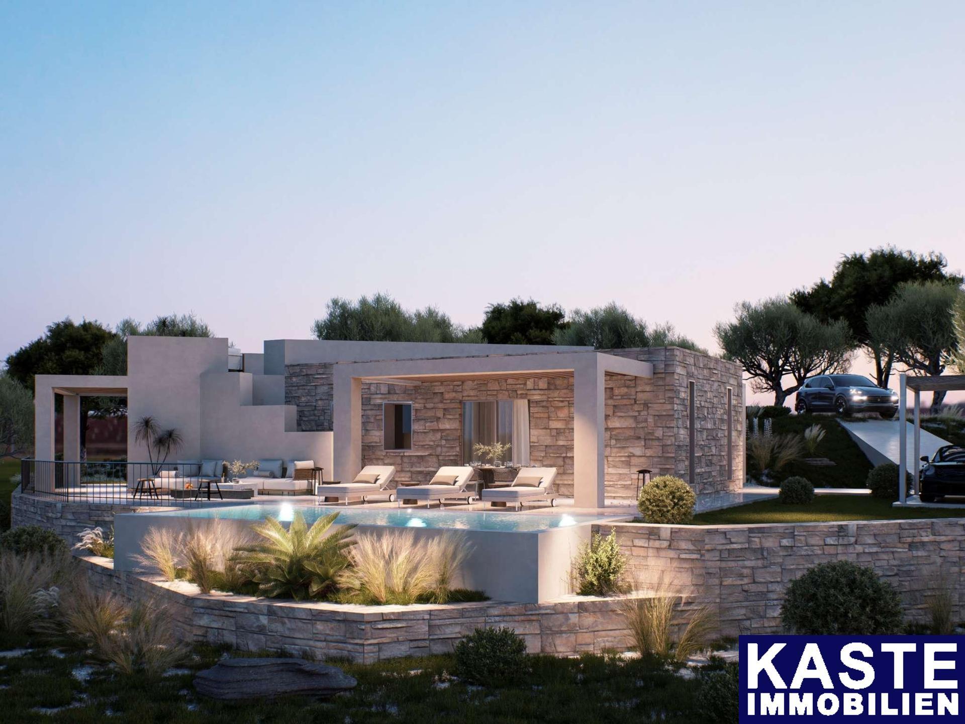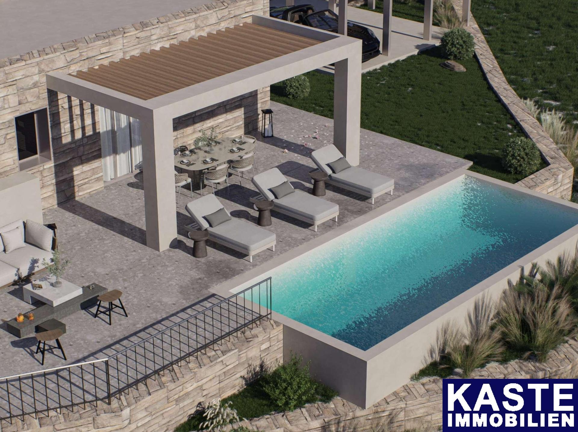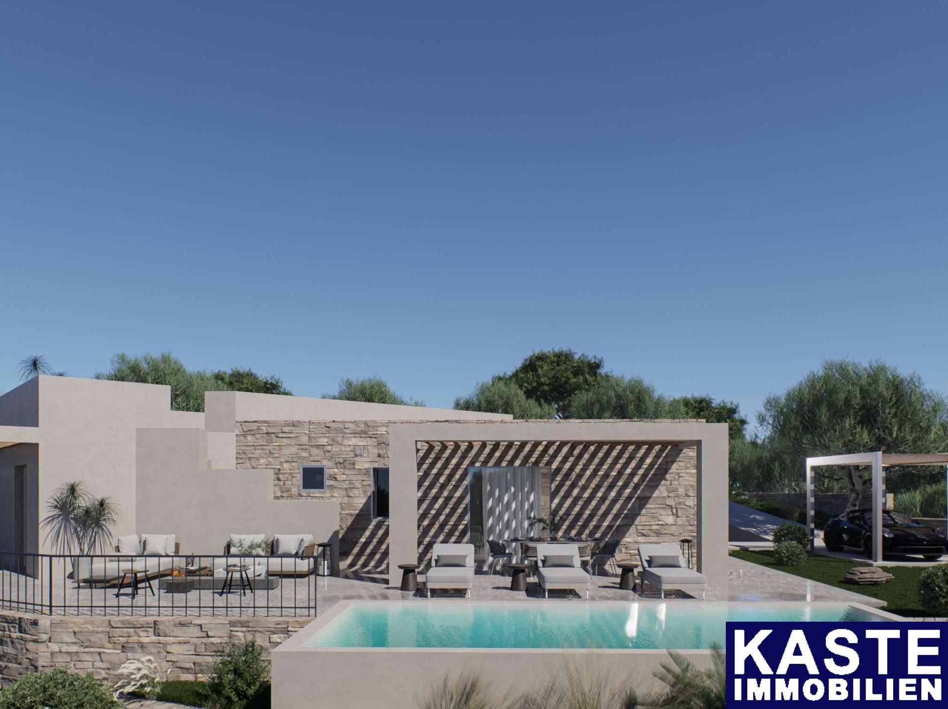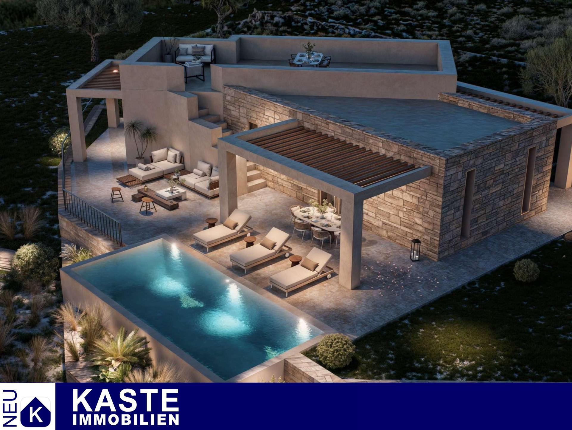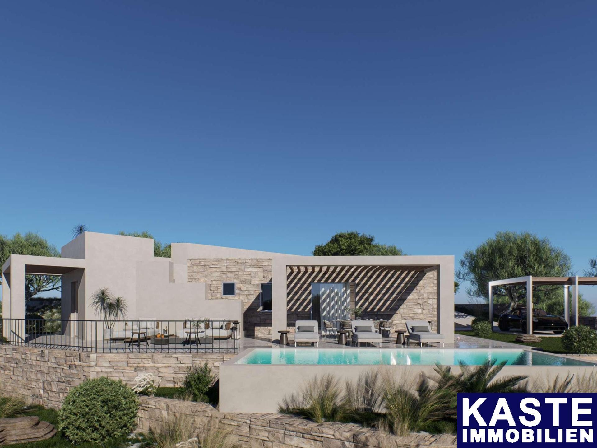 Diese moderne Steinvilla im Erstbezug mit einem Schwimmbad befindet sich im Bau und steht zum Verkauf in der Nähe von Bali, Rethymno. Das ebenerdige Haus erstreckt sich über großzügige 123,75 Quadratmeter auf einem individuellen Grundstück von 706,94 Quadratmetern.