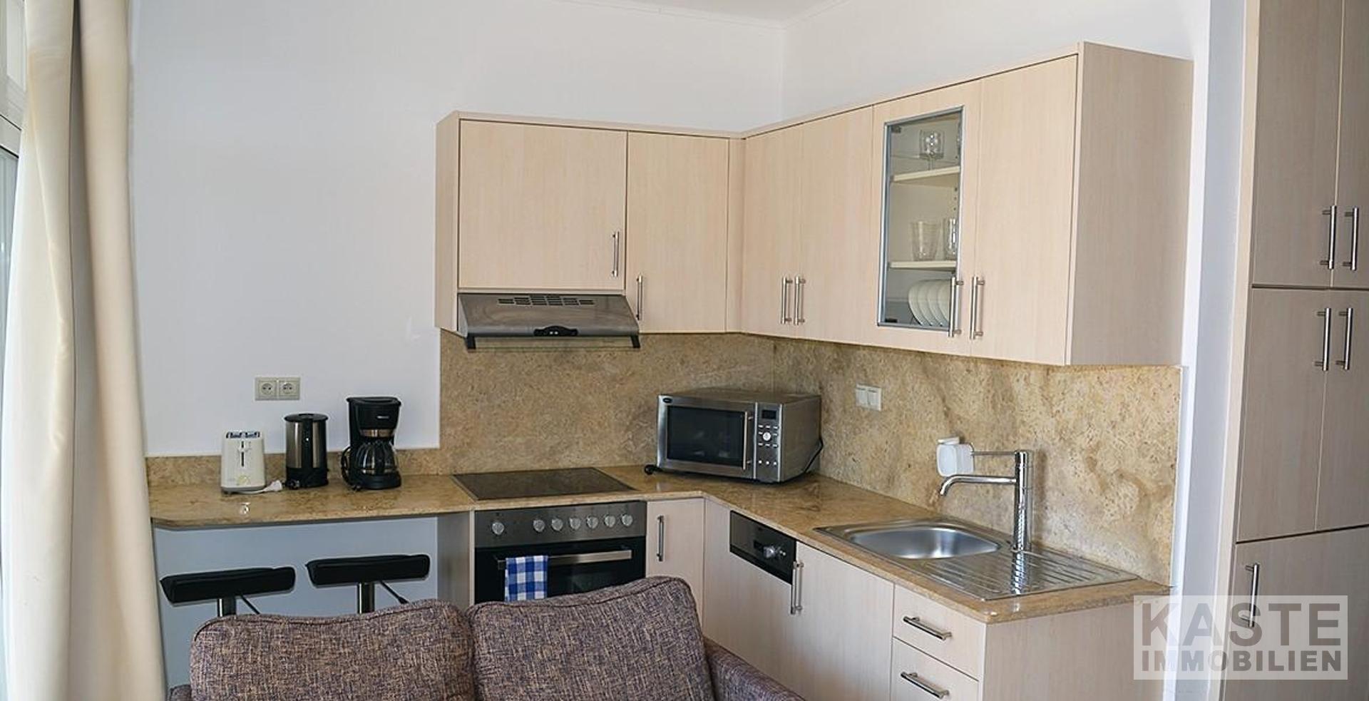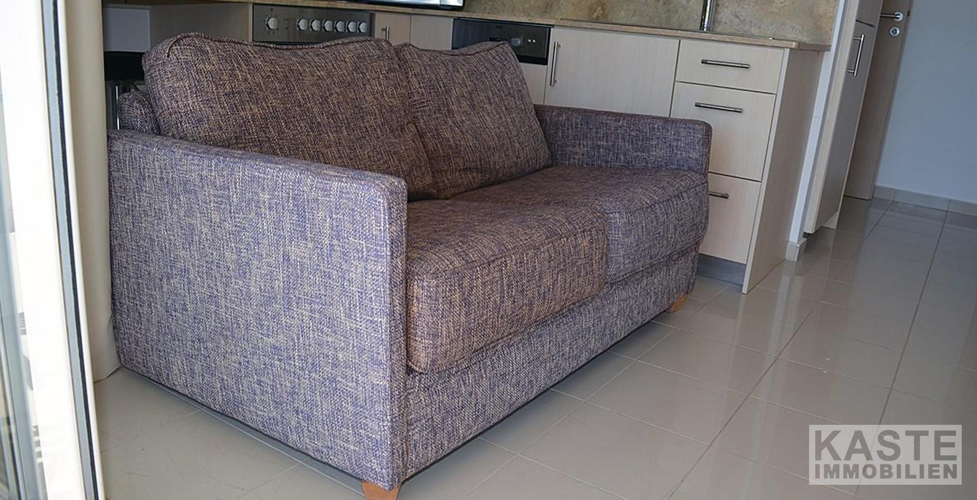 Das moderne Penthouse verfügt über ein Schlafzimmer mit Einbauschränken, eine voll ausgestattete Küche mit Backofen, Kühlschrank und Geschirrspüler, ein modernes Badezimmer mit großer Dusche sowie ein Wohnzimmer mit Fernseher und Schlafsofa. Zwei großzügige Balkone erweitern den Wohnraum: einer befindet sich rückseitig am Schlafzimmer, der andere frontseitig am Wohnzimmer. Eine Treppe direkt vor der Tür des Penthouses führt zu einer privaten Dachterrasse, von der aus Sie die fantastische Aussicht sowie den kretischen Sonnenaufgang und Sonnenuntergang genießen können.