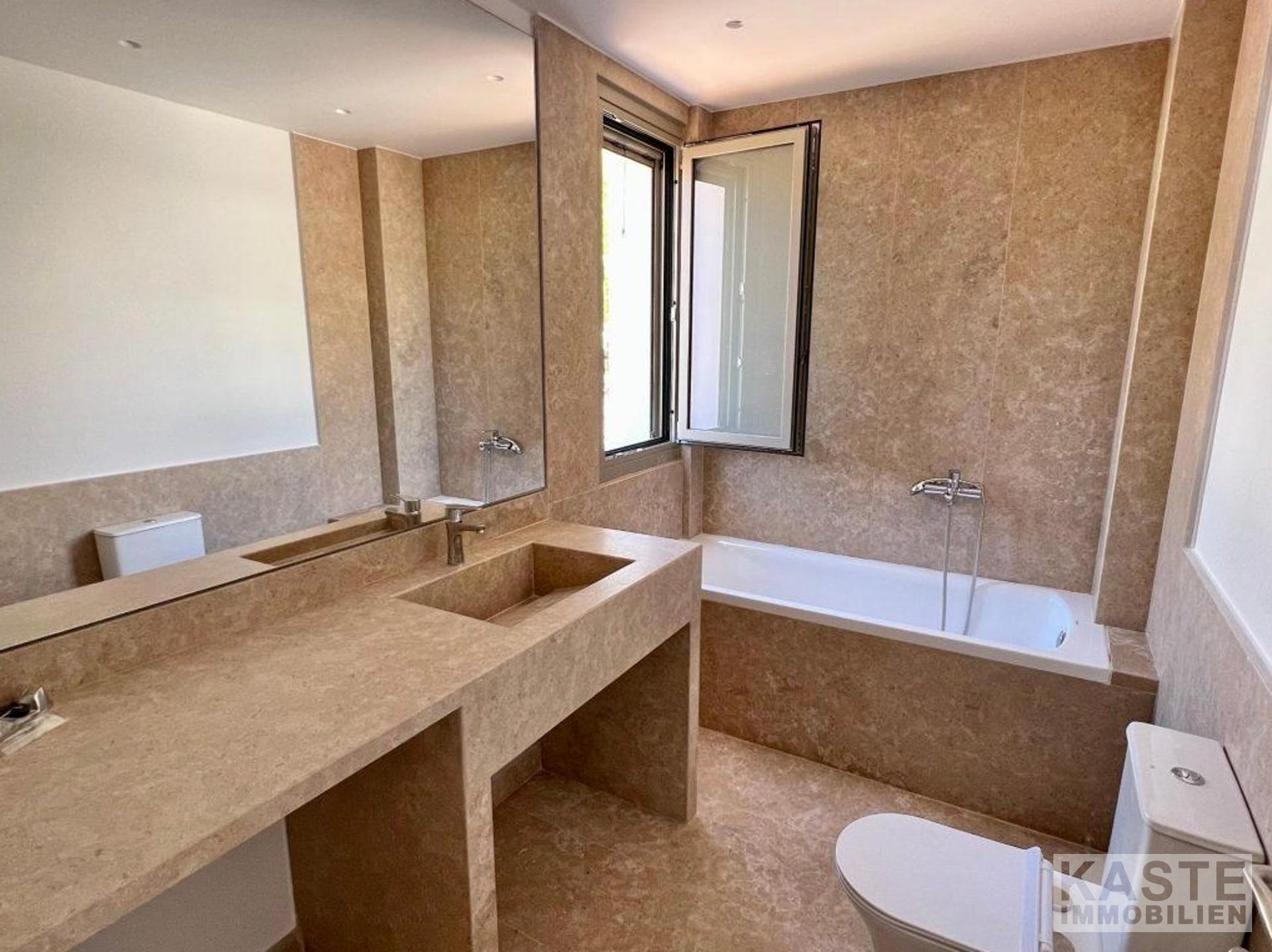 Das Erdgeschoss besteht aus einem Wohnzimmer mit großen Balkontüren zur vorderen Terrasse, einer voll ausgestatteten Küche und einem Gäste-WC. Eine Marmortreppe führt in die mittlere Etage, wo sich zwei Doppelschlafzimmer mit Einbauschränken befinden. Beide haben Zugang zu einem gemeinsamen Balkon mit Meerblick sowie einem großen Badezimmer mit Badewanne. Die Marmortreppe führt weiter in die oberste Etage, wo sich das dritte Schlafzimmer mit eigenem Duschbad und einem großen Fenster mit toller Aussicht befindet.