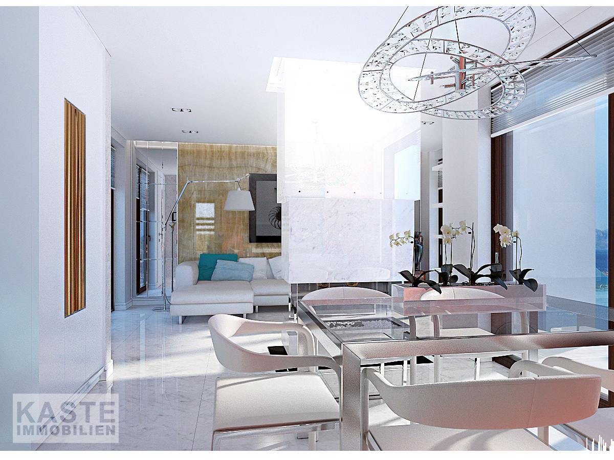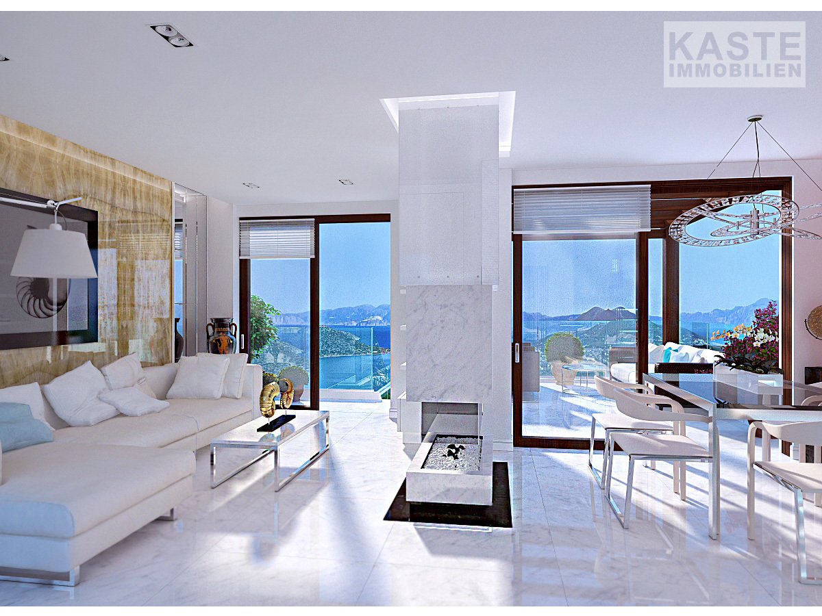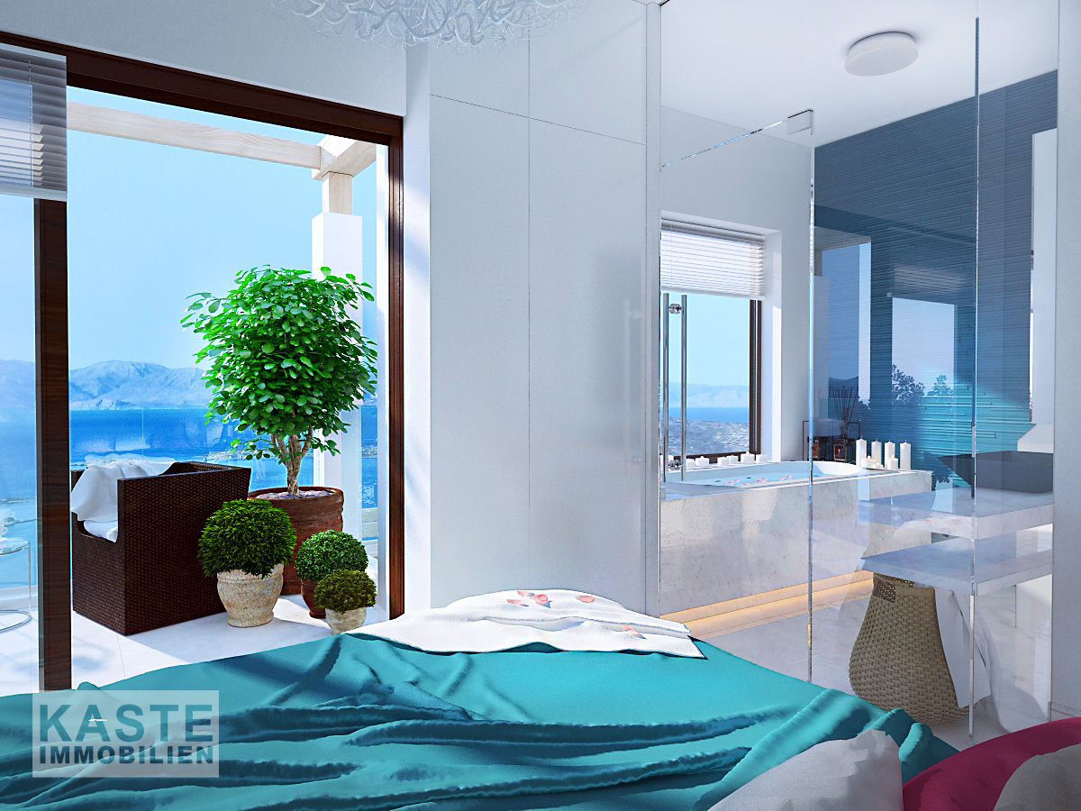 In sämtlichen Räumen wurde besonderer Wert auf großflächige Fenster gelegt, die sich über die volle Raumhöhe erstrecken und somit dem Wohnbereich einen wunderbaren Panoramablick verleihen. Selbst das Badezimmer ermöglicht Ihnen einen atemberaubenden Ausblick auf das Meer und die umliegenden Berge.