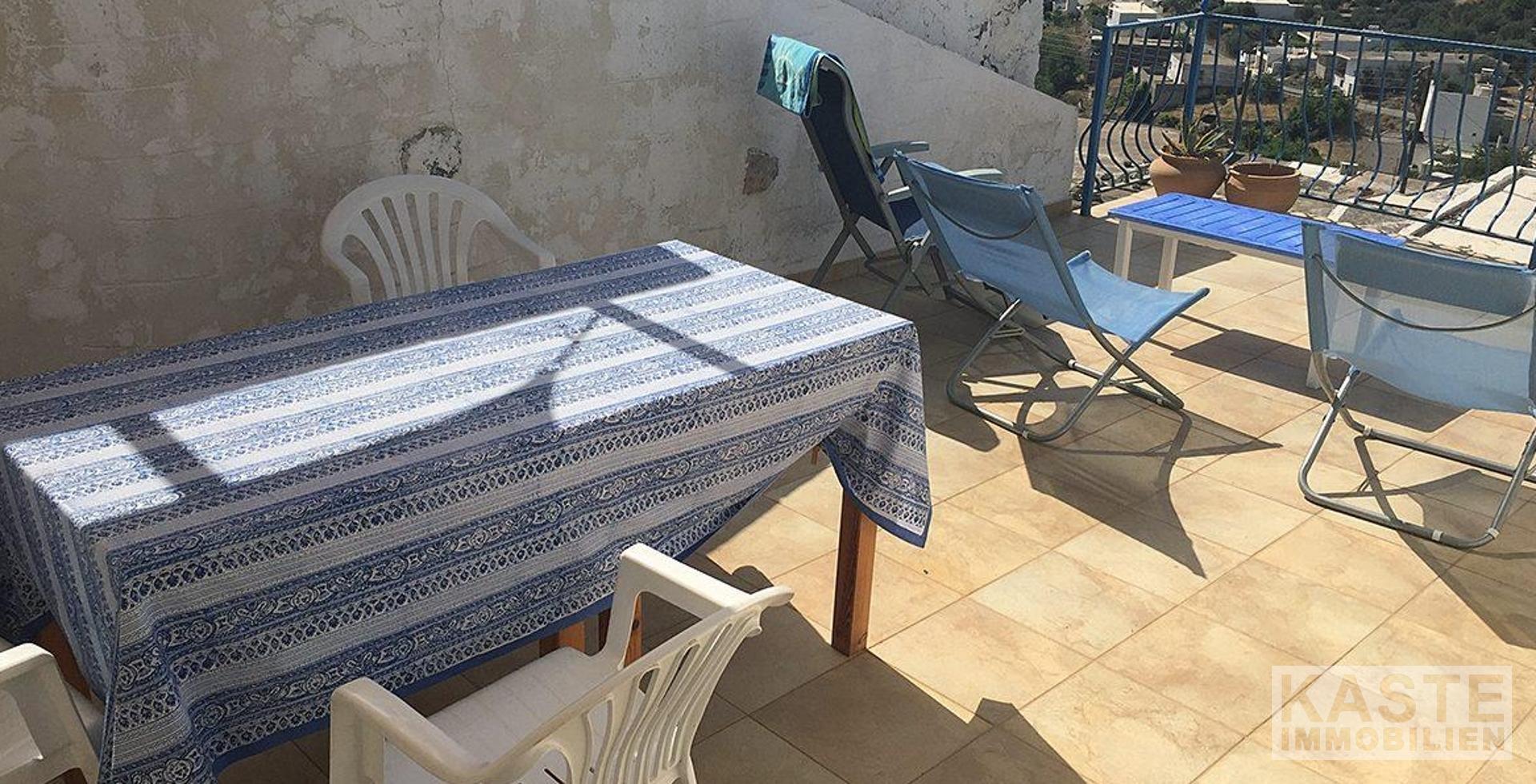 Die erste Etage hält einen hellen offenen Wohnbereich für Sie bereit, der durch einen dekorativen Steinbogen von der voll ausgestatteten Küche mit modernen Geräten getrennt ist. Vom Wohnbereich aus führt eine Tür zu einem Balkon, der einen atemberaubenden Blick auf das Dorf, die umliegenden Berge und das glitzernde Meer bietet.