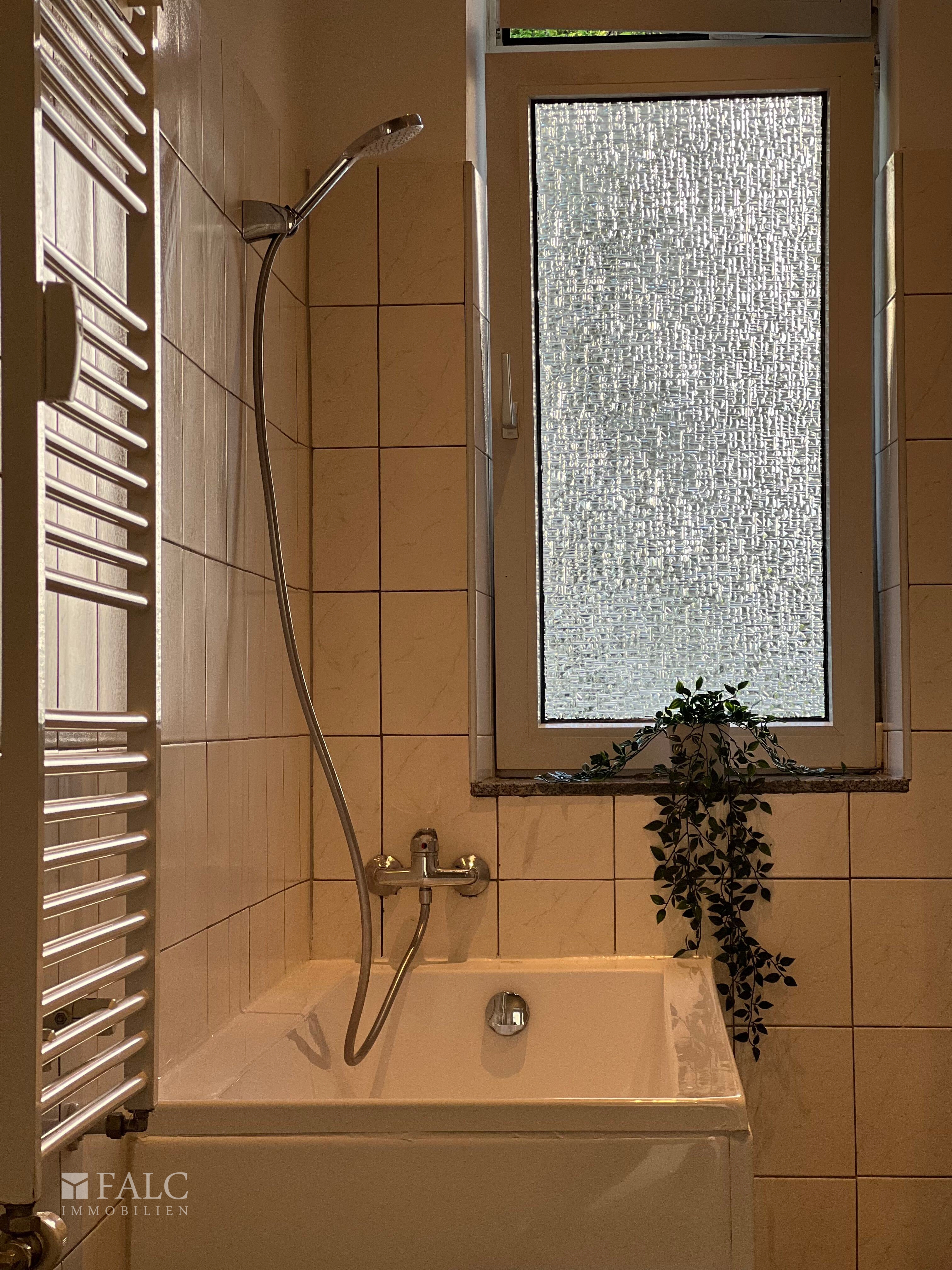 Das Badezimmer ist funktional ausgestattet und verfügt über eine Badewanne sowie moderne Armaturen. Die hellen Fliesen und das Fenster sorgen für eine freundliche und frische Atmosphäre.