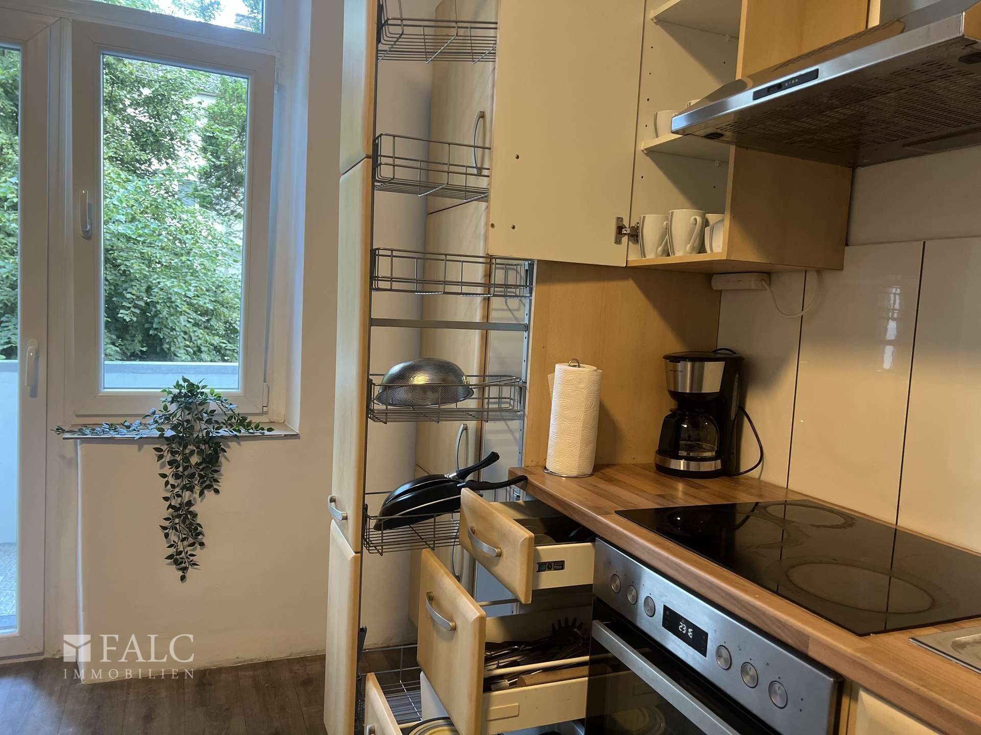 Die Küche ist geräumig und bietet ausreichend Platz für einen Esstisch. Sie ist mit modernen Geräten ausgestattet, die das Kochen zum Vergnügen machen. Von hier aus gelangen Sie direkt auf den Balkon, der einen Blick ins Grüne bietet und zum Entspannen einlädt.