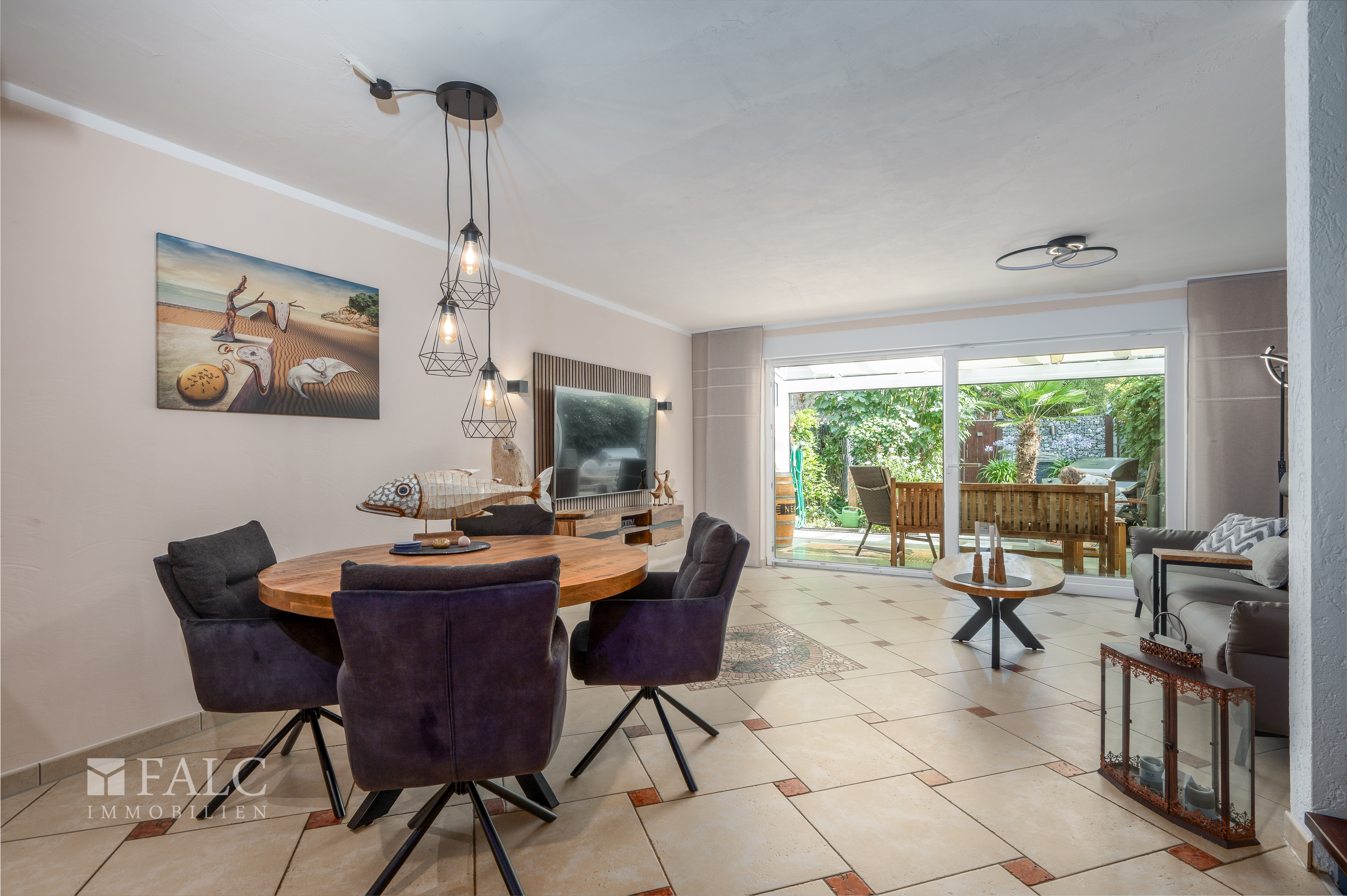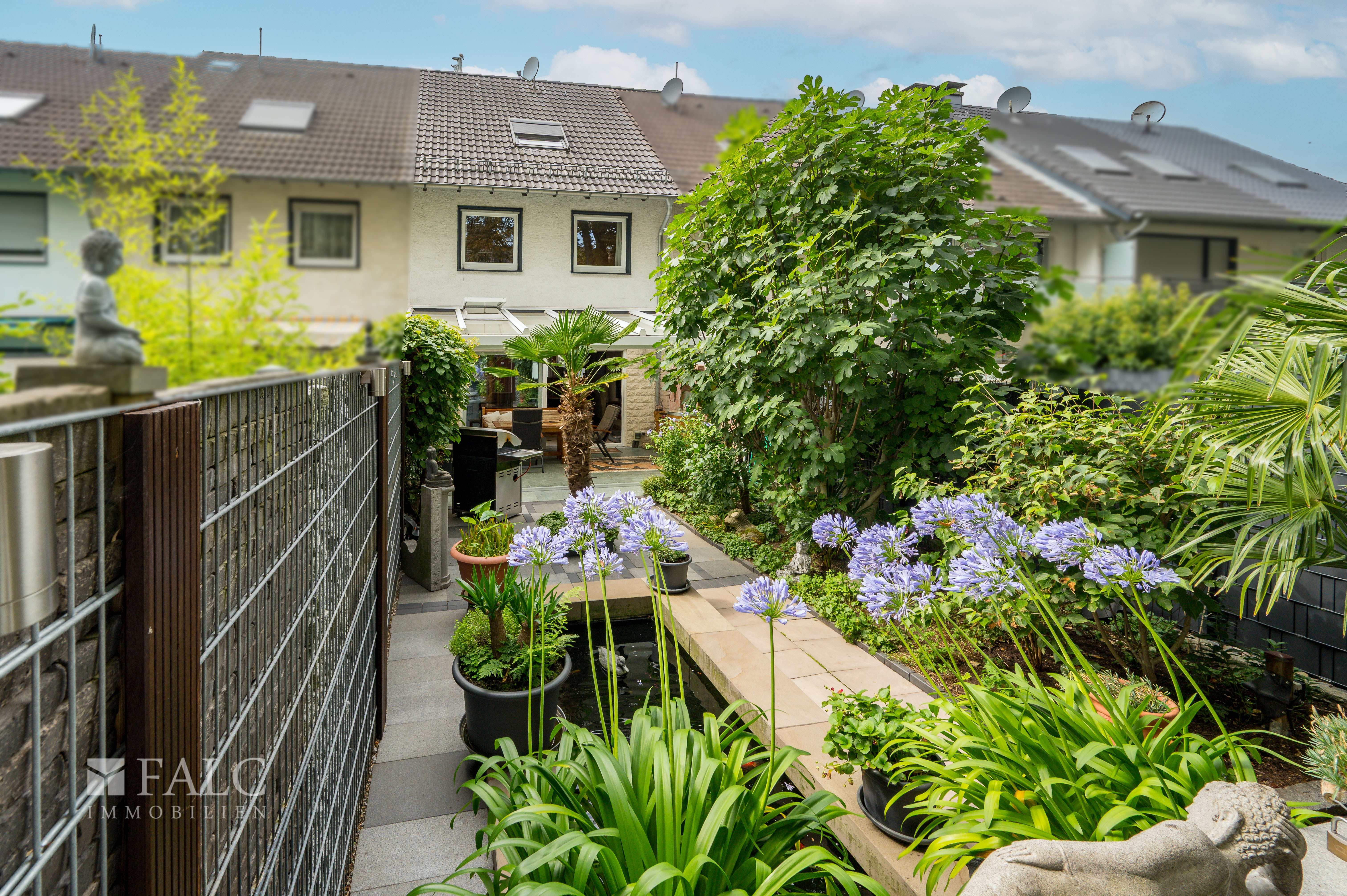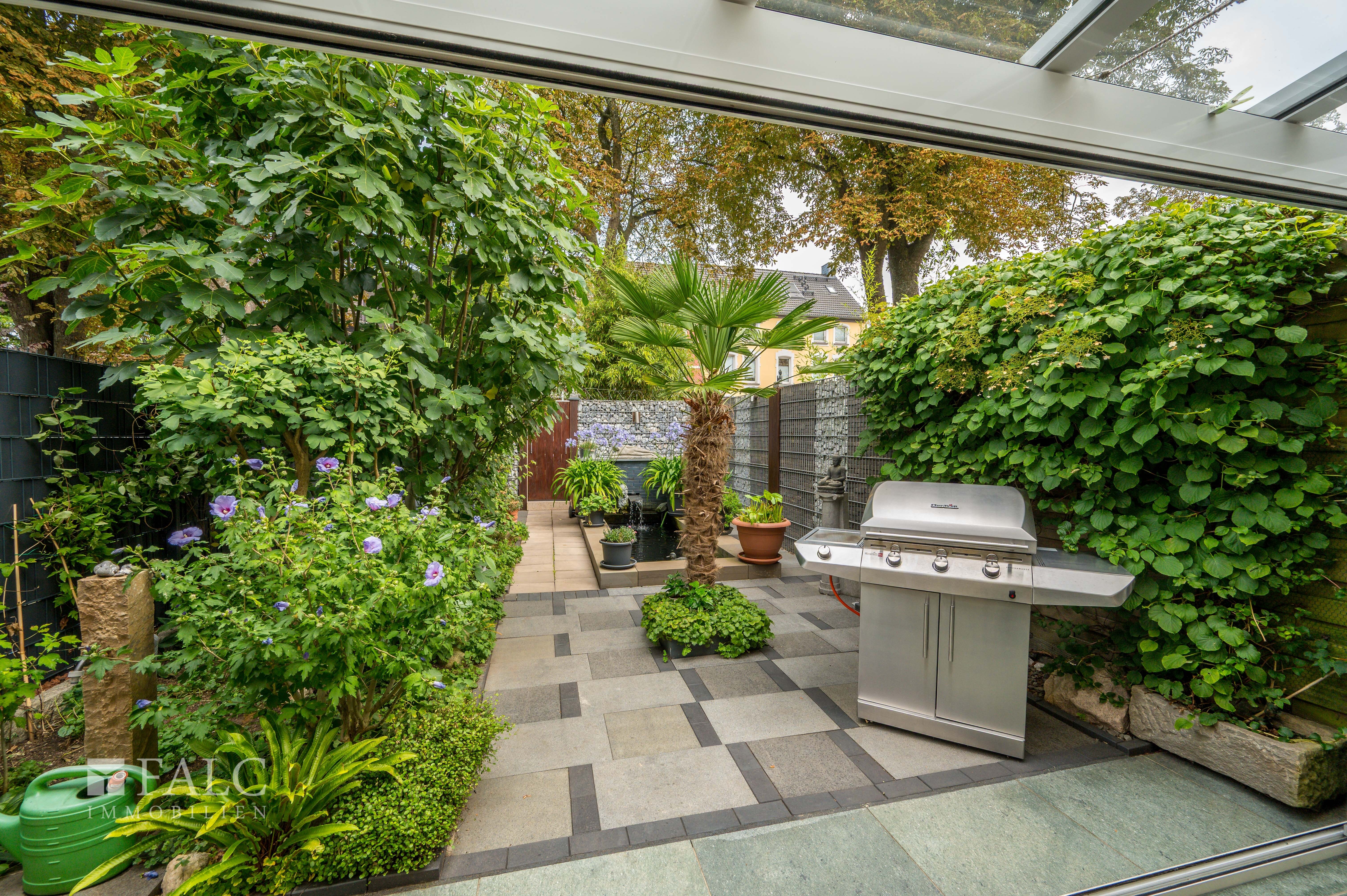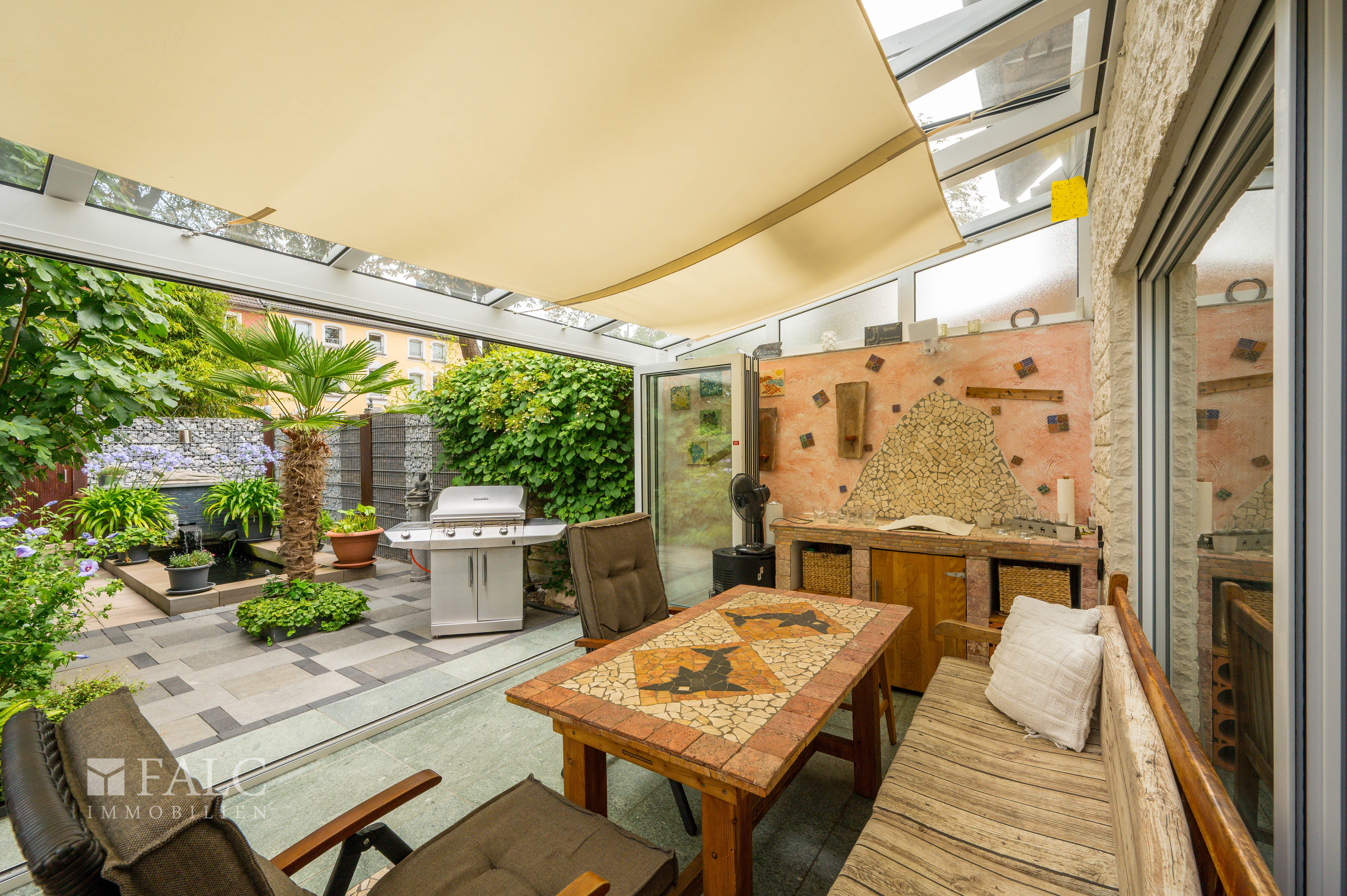 Von hier aus führt der Weg auf die Terrasse, die durch ihre Wintergartenfunktion ganzjährig genutzt werden kann. Der Blick schweift hinaus in den traumhaft angelegten Garten, der mit einem Koiteich und üppiger Bepflanzung wie ein kleines Paradies wirkt. Ein Ort voller Harmonie, an dem man Ruhe und Natur genießen kann.