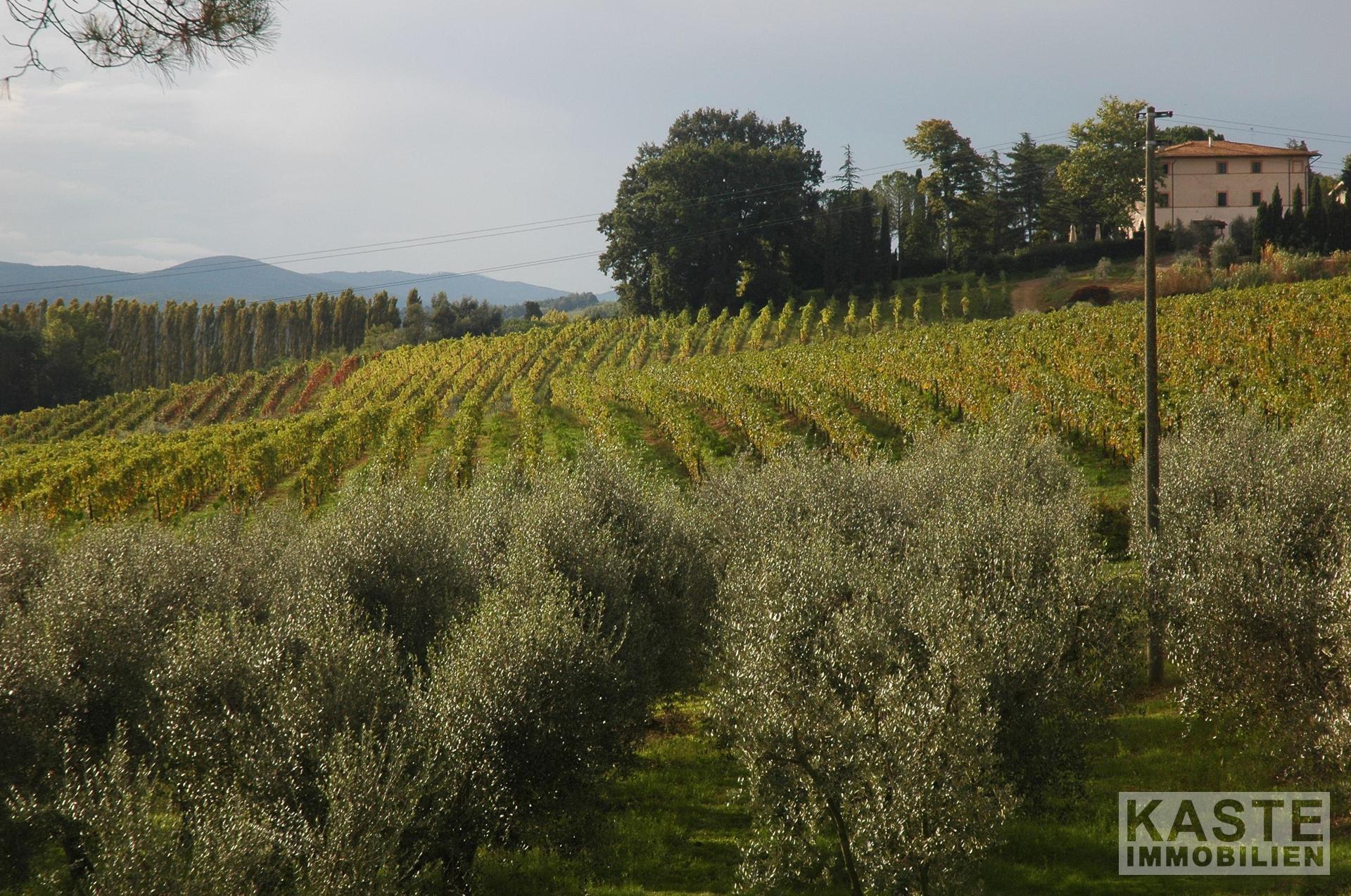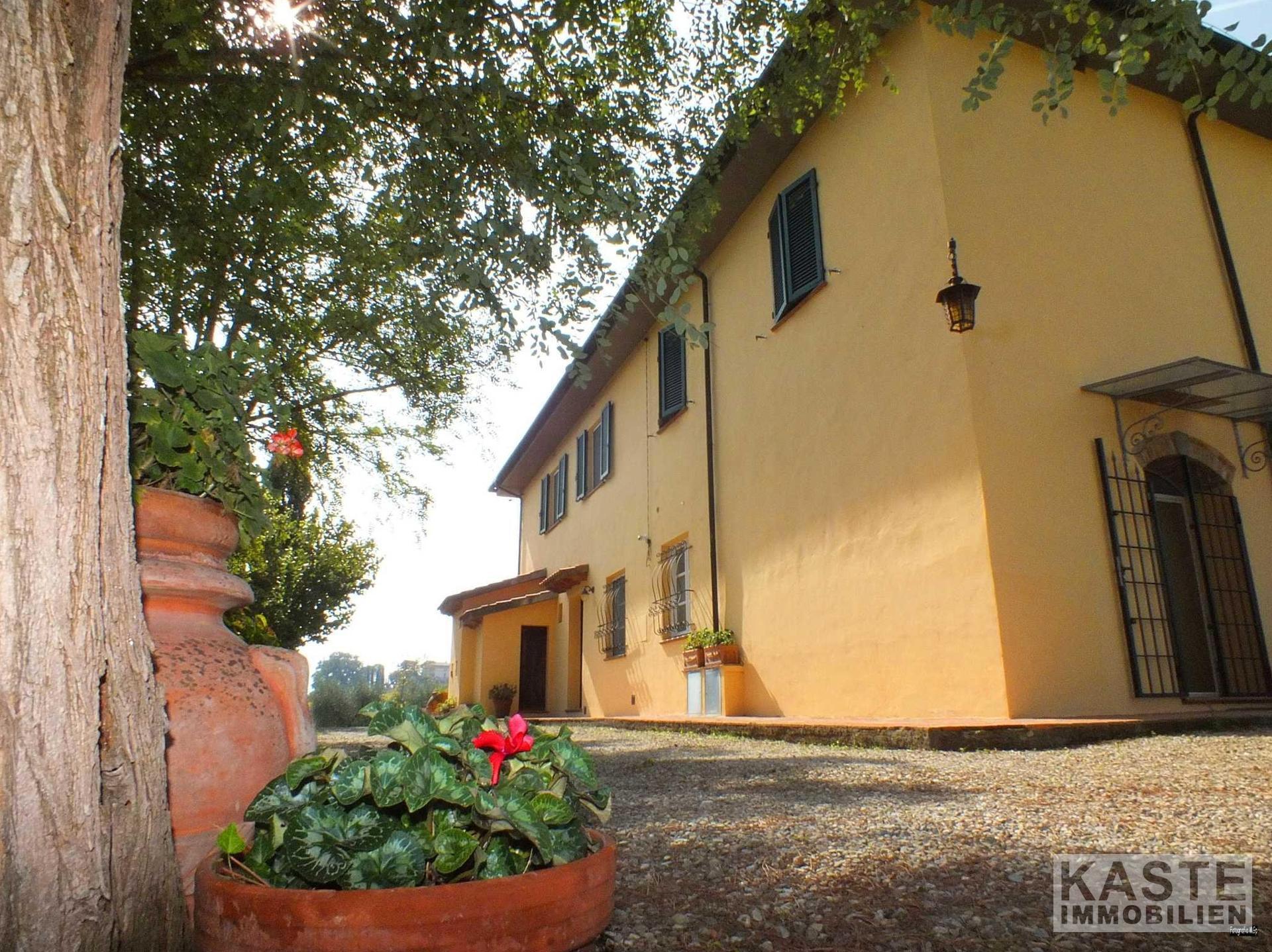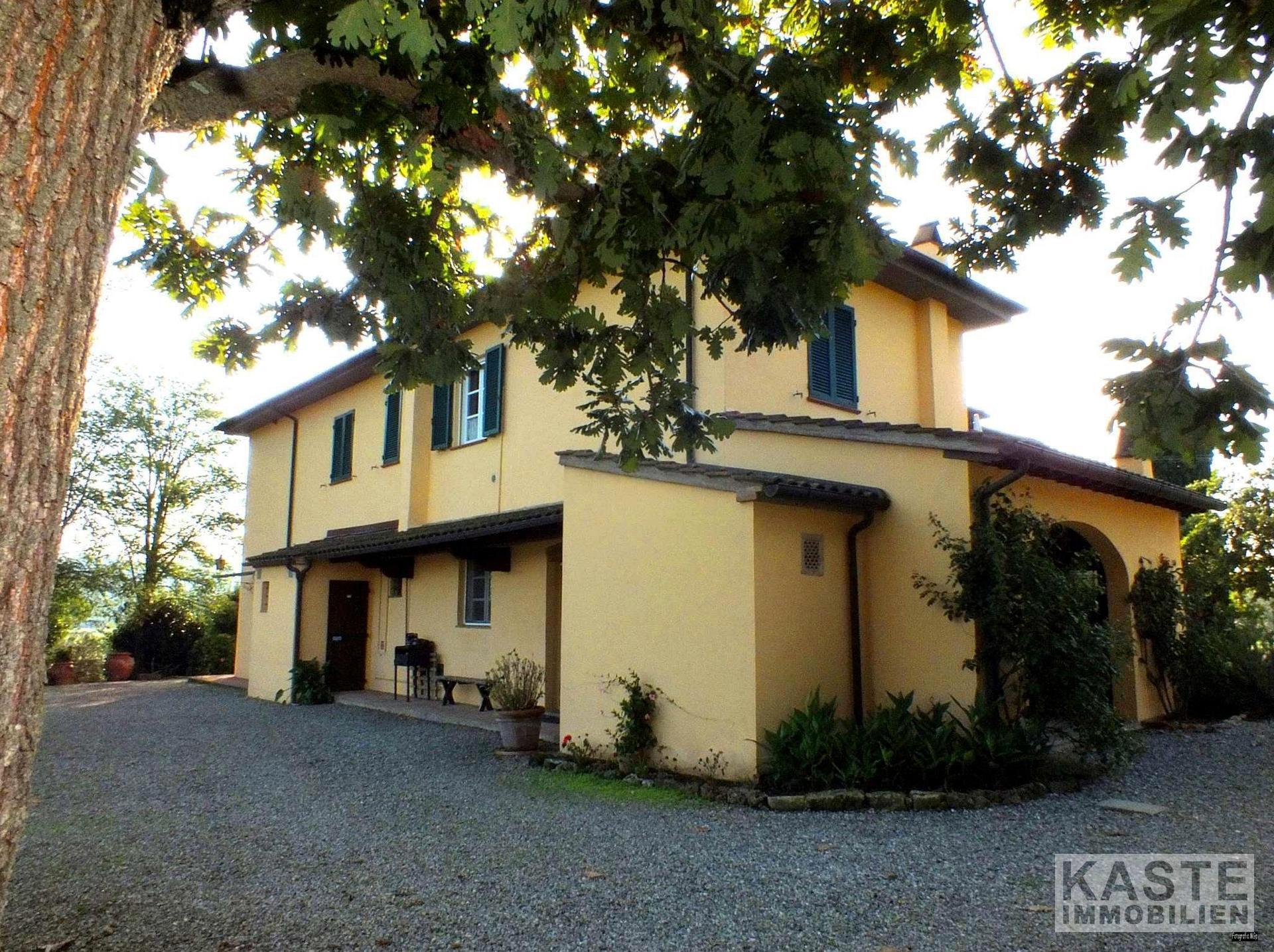 Typisch toskanische Villa auf einem kleinen Hügel mit sehr einfachem Zugang über einen kurzen Feldweg, ursprünglich ein Bauernhaus aus dem Jahr 1897. Das Landhaus wurde 1992 von den jetzigen Besitzern komplett renoviert, die die Basis der Häuser unter Berücksichtigung der seismischen Regeln der Gegend restaurierten. Die gesamte Villa von 560 qm ist von einem bezaubernden Garten von ca. 5000 qm umgeben, in dem sich ein 6x12m großer, mit Chlor gefilterter Swimmingpool und ein zusätzliches 3 Hektar großes Grundstück mit 350 Olivenbäumen befindet. Das Haus ist sehr groß und wurde jahrelang als Agritourismus und B&B betrieben, jetzt wird es an Touristen vermietet. Das Haus besteht aus 2 Etagen und es ist derzeit in 4 Wohnungen aufgeteilt. 1) die erste Einheit ist im Erdgeschoss, sie ist sehr klein nur für Gäste, die zu zweit sind oder vielleicht mit einem Baby, sie besteht aus Schlafzimmer-Bad-Küche mit Lodge. 2-3) die anderen 2 großen Wohnungen mit 2 und 3 Schlafzimmern befinden sich im ersten Stock und beide werden an Touristen vermietet 4) die letzte Einheit ist die größte und wird von den Eigentümern selber genutzt. Sie verfügt über eine professionelle Küche und einen Saal, um den Touristen Frühstück anzubieten, so dass es sehr einfach ist, hier als B&B zu arbeiten. Alles ist startklar. Jede Einheit hat eine Loggia oder eine Terrasse mit Blick auf den Garten, so dass die Privatsphäre für jede Wohnung gewährleistet ist. Angrenzend an die Wohnungen zusätzliche Dienstleistungen wie Bad und Außendusche, Ofen / Grill. Außerdem verfügt das Anwesen über 4 Pferdeboxen, in denen seit Jahren Pferde leben und eine große Koppel, auf der sie laufen können. Und ein großes Nebengebäude für Werkzeuge und Maschinen.