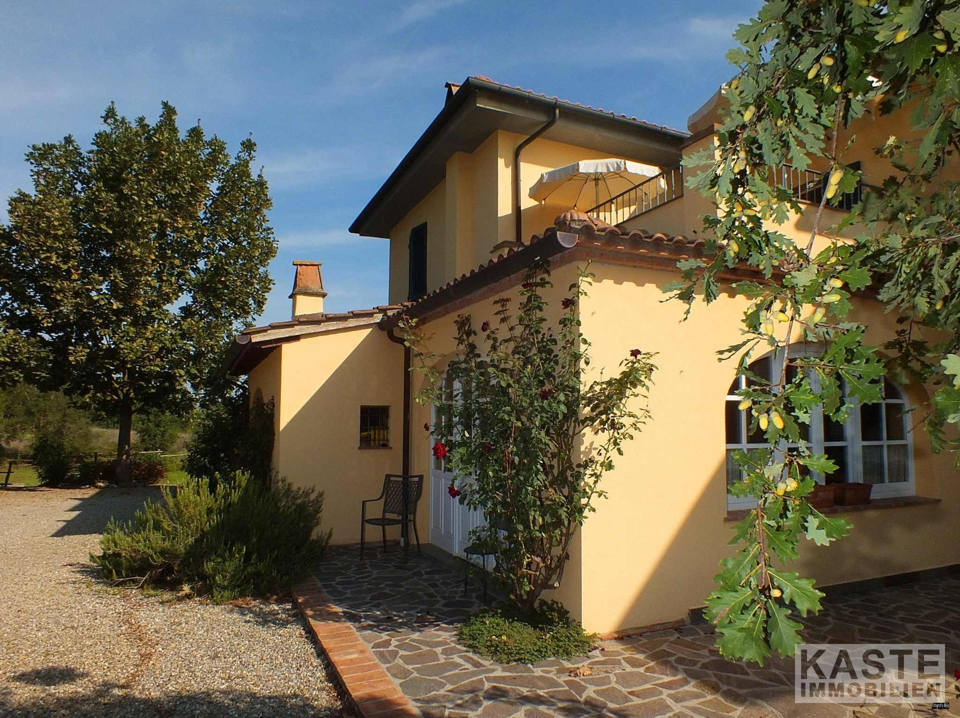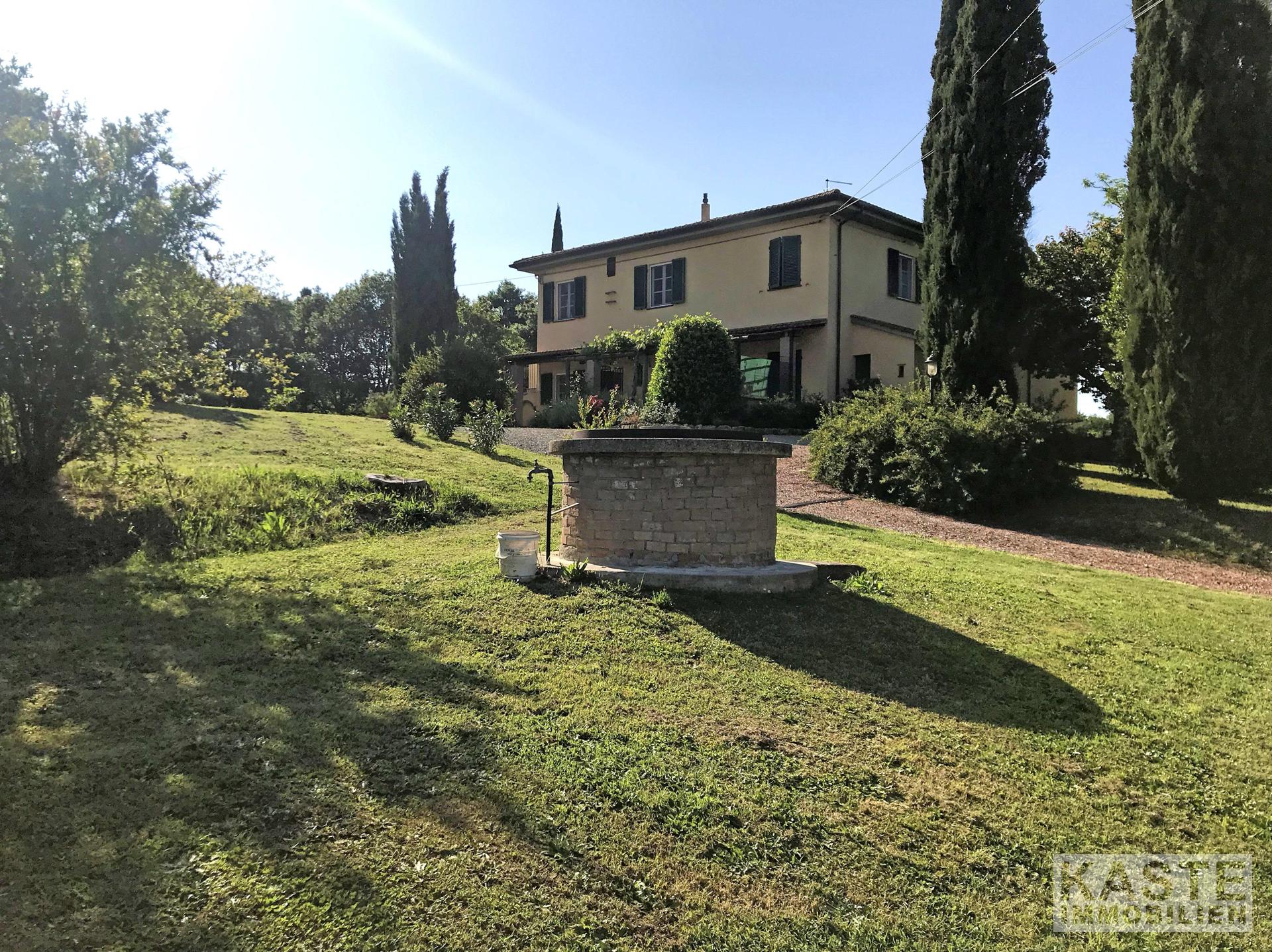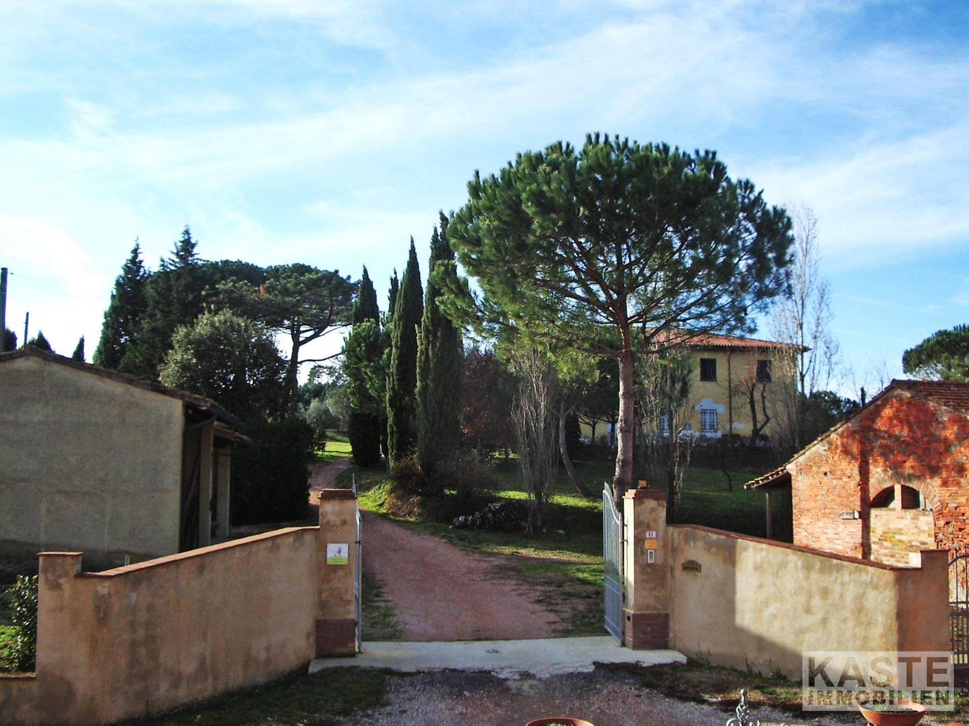 Typisch toskanische Villa auf einem kleinen Hügel mit sehr einfachem Zugang über einen kurzen Feldweg, ursprünglich ein Bauernhaus aus dem Jahr 1897. Das Landhaus wurde 1992 von den jetzigen Besitzern komplett renoviert, die die Basis der Häuser unter Berücksichtigung der seismischen Regeln der Gegend restaurierten. Die gesamte Villa von 560 qm ist von einem bezaubernden Garten von ca. 5000 qm umgeben, in dem sich ein 6x12m großer, mit Chlor gefilterter Swimmingpool und ein zusätzliches 3 Hektar großes Grundstück mit 350 Olivenbäumen befindet. Das Haus ist sehr groß und wurde jahrelang als Agritourismus und B&B betrieben, jetzt wird es an Touristen vermietet. Das Haus besteht aus 2 Etagen und es ist derzeit in 4 Wohnungen aufgeteilt. 1) die erste Einheit ist im Erdgeschoss, sie ist sehr klein nur für Gäste, die zu zweit sind oder vielleicht mit einem Baby, sie besteht aus Schlafzimmer-Bad-Küche mit Lodge. 2-3) die anderen 2 großen Wohnungen mit 2 und 3 Schlafzimmern befinden sich im ersten Stock und beide werden an Touristen vermietet 4) die letzte Einheit ist die größte und wird von den Eigentümern selber genutzt. Sie verfügt über eine professionelle Küche und einen Saal, um den Touristen Frühstück anzubieten, so dass es sehr einfach ist, hier als B&B zu arbeiten. Alles ist startklar. Jede Einheit hat eine Loggia oder eine Terrasse mit Blick auf den Garten, so dass die Privatsphäre für jede Wohnung gewährleistet ist. Angrenzend an die Wohnungen zusätzliche Dienstleistungen wie Bad und Außendusche, Ofen / Grill. Außerdem verfügt das Anwesen über 4 Pferdeboxen, in denen seit Jahren Pferde leben und eine große Koppel, auf der sie laufen können. Und ein großes Nebengebäude für Werkzeuge und Maschinen.
