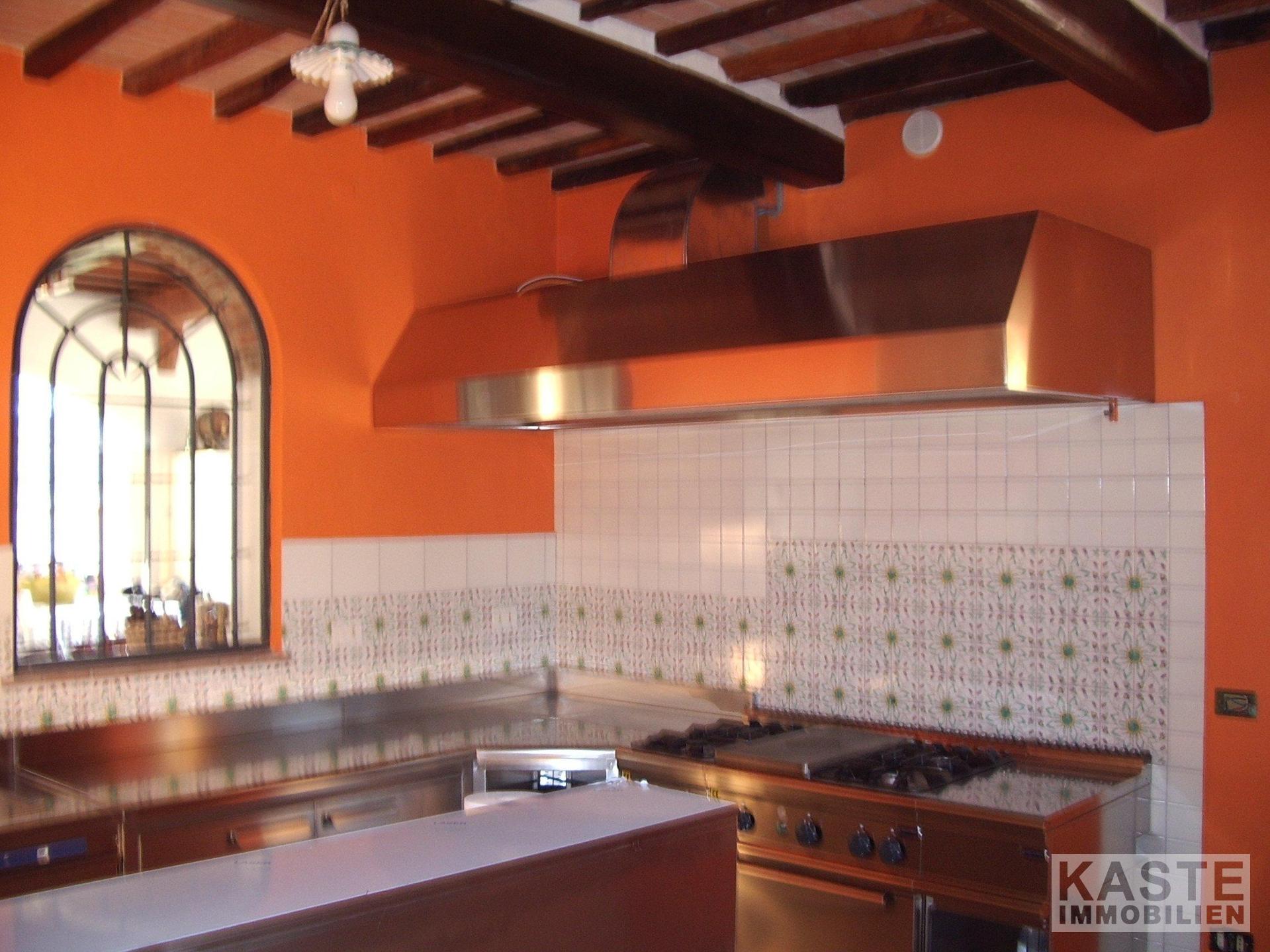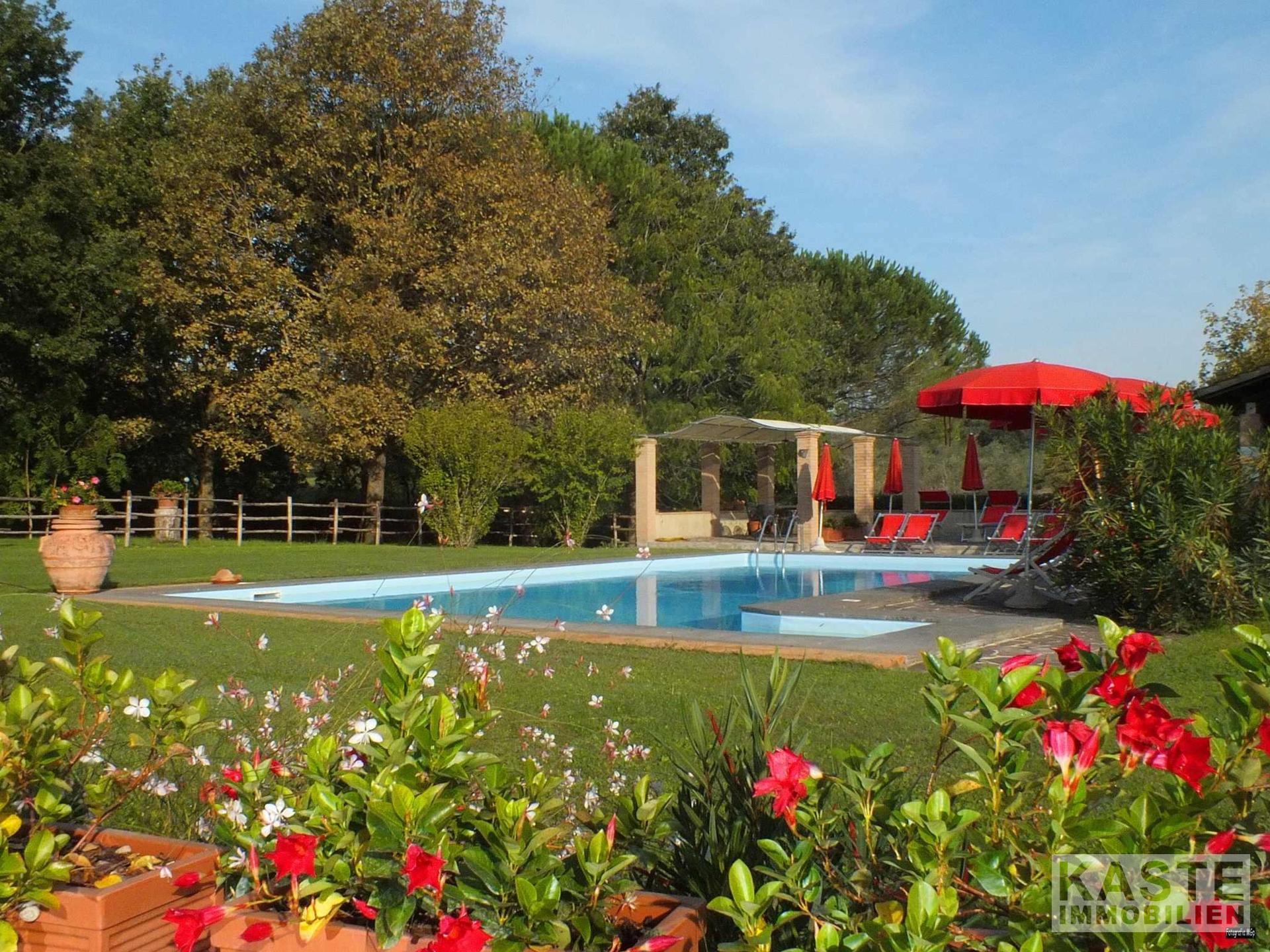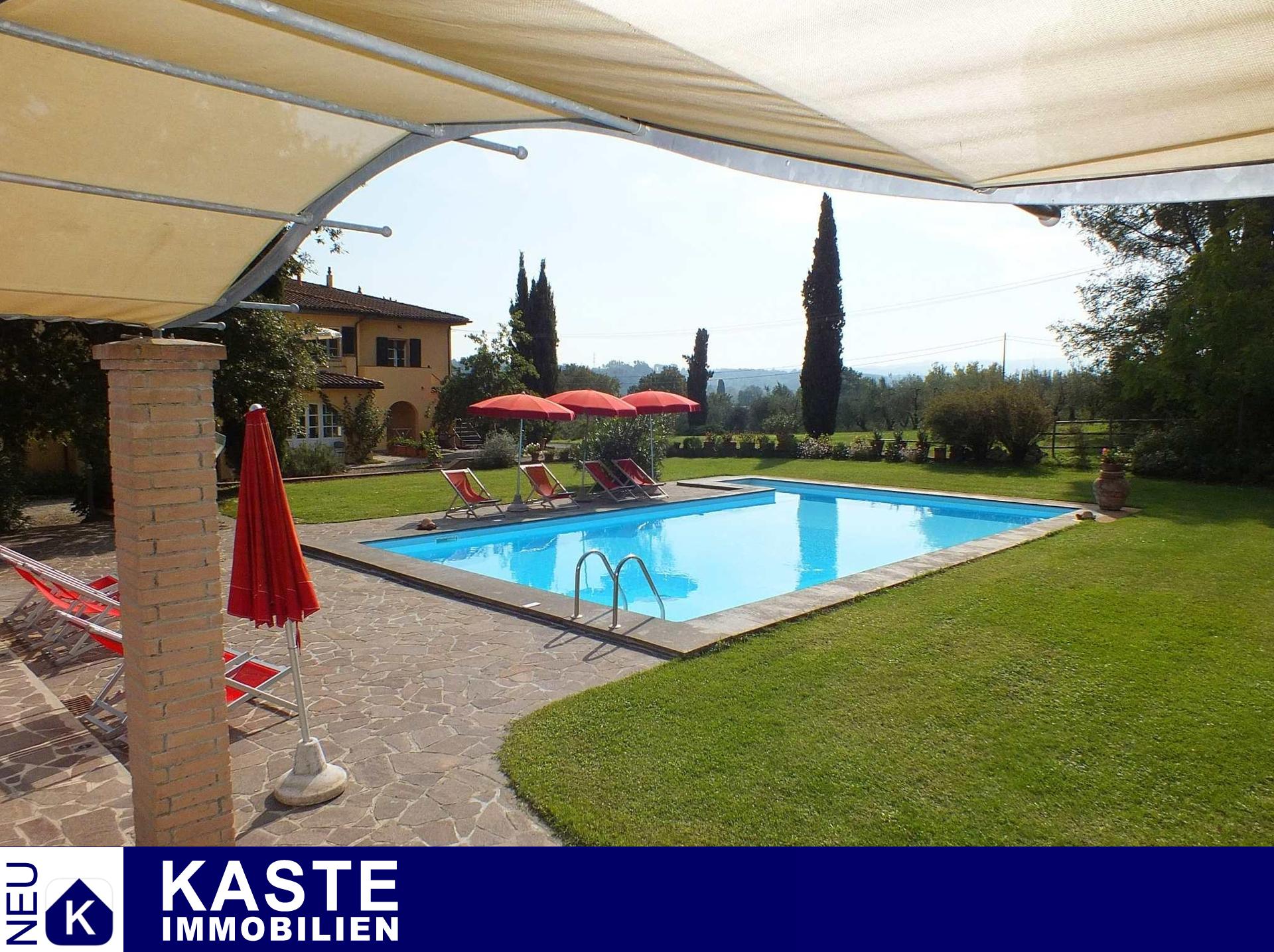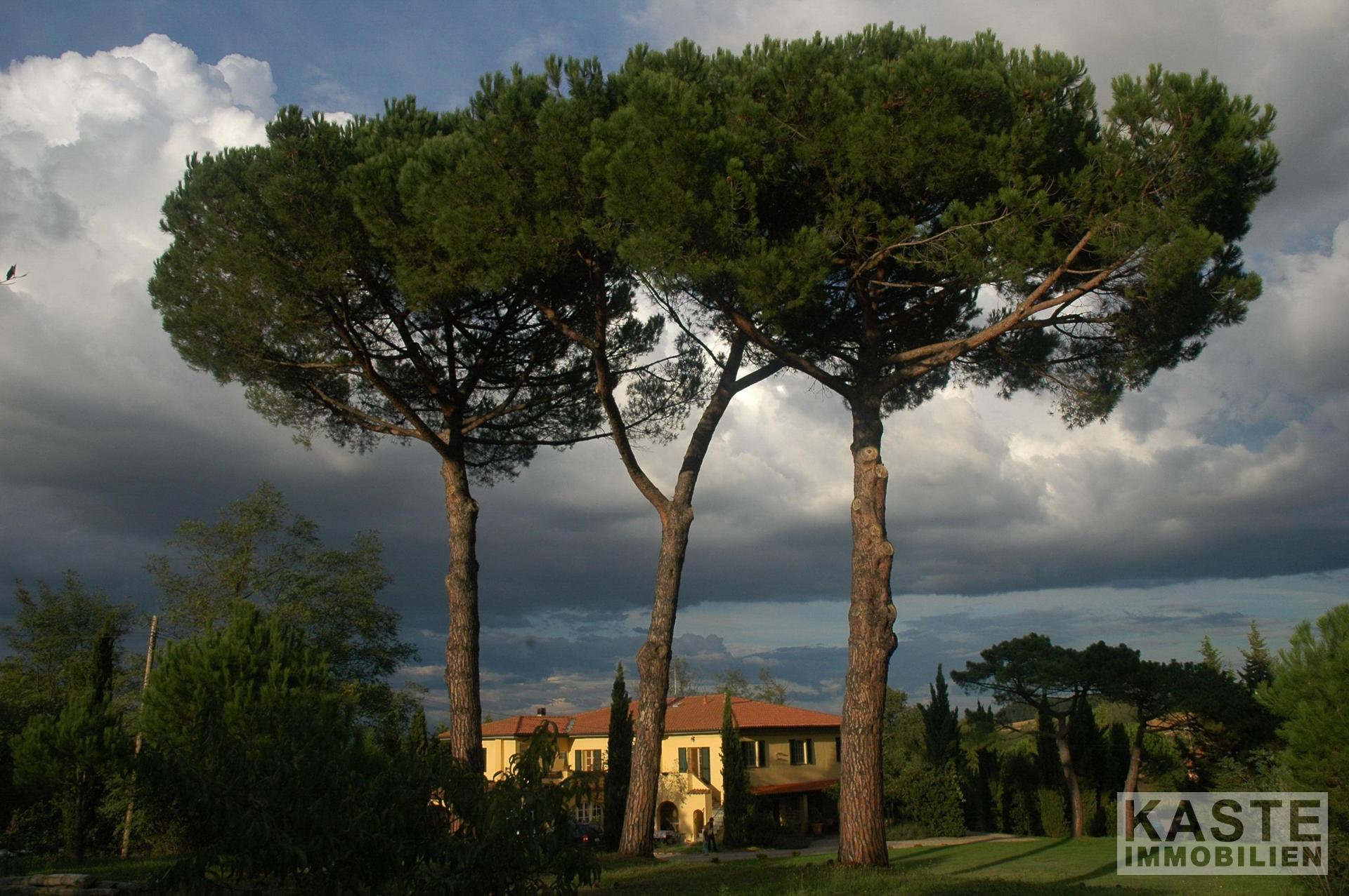 Typisch toskanische Villa auf einem kleinen Hügel mit sehr einfachem Zugang über einen kurzen Feldweg, ursprünglich ein Bauernhaus aus dem Jahr 1897. Das Landhaus wurde 1992 von den jetzigen Besitzern komplett renoviert, die die Basis der Häuser unter Berücksichtigung der seismischen Regeln der Gegend restaurierten. Die gesamte Villa von 560 qm ist von einem bezaubernden Garten von ca. 5000 qm umgeben, in dem sich ein 6x12m großer, mit Chlor gefilterter Swimmingpool und ein zusätzliches 3 Hektar großes Grundstück mit 350 Olivenbäumen befindet. Das Haus ist sehr groß und wurde jahrelang als Agritourismus und B&B betrieben, jetzt wird es an Touristen vermietet. Das Haus besteht aus 2 Etagen und es ist derzeit in 4 Wohnungen aufgeteilt. 1) die erste Einheit ist im Erdgeschoss, sie ist sehr klein nur für Gäste, die zu zweit sind oder vielleicht mit einem Baby, sie besteht aus Schlafzimmer-Bad-Küche mit Lodge. 2-3) die anderen 2 großen Wohnungen mit 2 und 3 Schlafzimmern befinden sich im ersten Stock und beide werden an Touristen vermietet 4) die letzte Einheit ist die größte und wird von den Eigentümern selber genutzt. Sie verfügt über eine professionelle Küche und einen Saal, um den Touristen Frühstück anzubieten, so dass es sehr einfach ist, hier als B&B zu arbeiten. Alles ist startklar. Jede Einheit hat eine Loggia oder eine Terrasse mit Blick auf den Garten, so dass die Privatsphäre für jede Wohnung gewährleistet ist. Angrenzend an die Wohnungen zusätzliche Dienstleistungen wie Bad und Außendusche, Ofen / Grill. Außerdem verfügt das Anwesen über 4 Pferdeboxen, in denen seit Jahren Pferde leben und eine große Koppel, auf der sie laufen können. Und ein großes Nebengebäude für Werkzeuge und Maschinen.