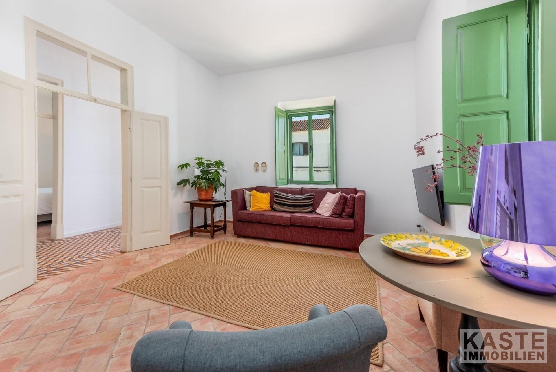 Unterhalb der Dachterrasse befindet sich ein Technikraum, der den Solar-Warmwassertank und ausreichend Stauraum für Wäsche und Reinigungsmittel beherbergt. Das Anwesen besteht aus insgesamt vier Wohneinheiten, darunter ein Duplex-Apartment mit einer Verbindungstür zu einer Schlafzimmersuite. Die obere Etage verfügt über ein weiteres Schlafzimmer und ein Badezimmer, während im Erdgeschoss eine Einbauküche mit Wohnzimmer und privater Sonnenterrasse zu finden ist.