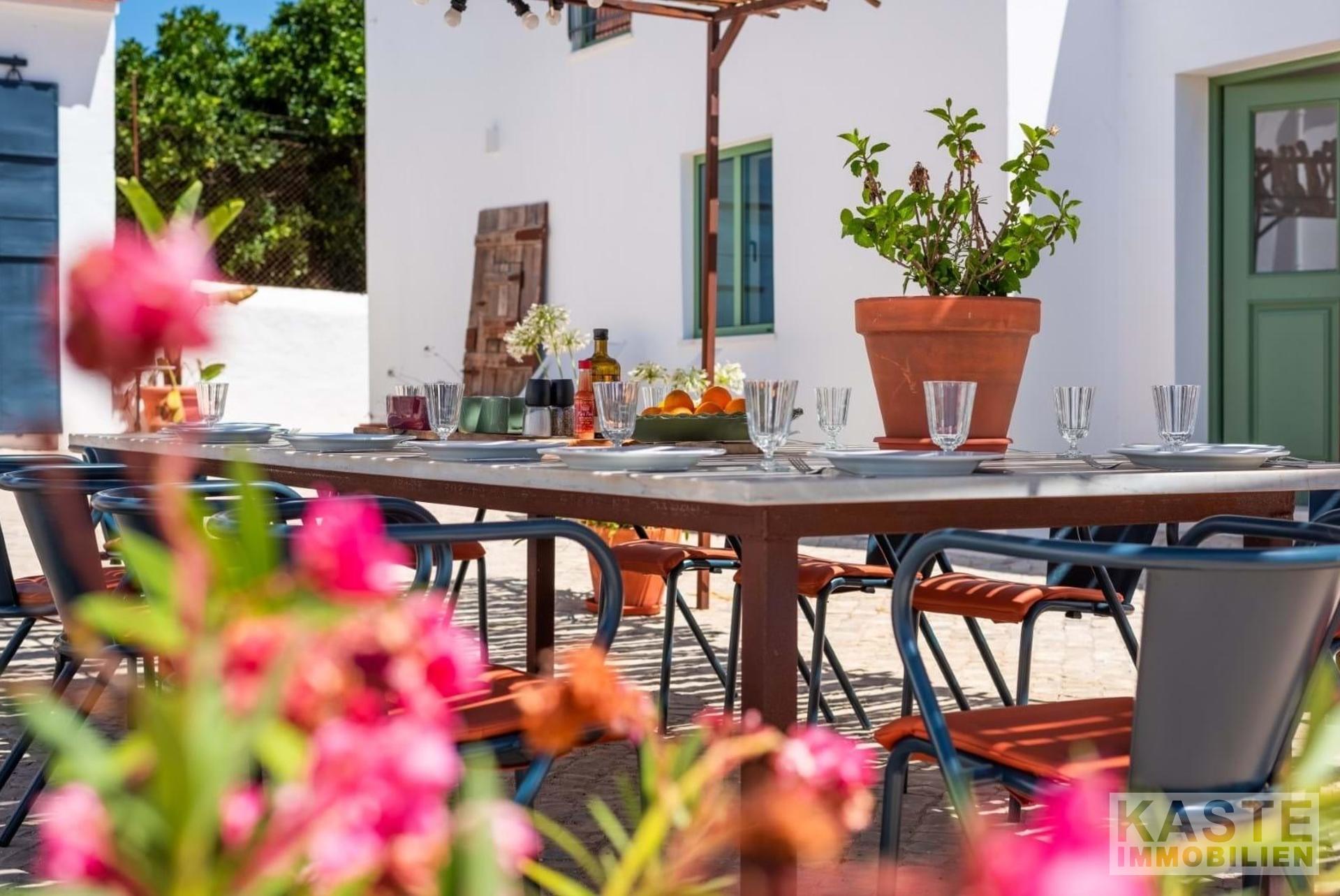 Die Küche ist der Traum eines jeden Kochs und bietet großzügige Arbeitsflächen sowie eine vollständige Ausstattung. Eine Tür führt zu einem Teil des Gartens, wo ein altes Fass aus dem Nebengebäude als Tisch für Getränke und Snacks dient, während es von Orangenbäumen beschattet wird. Dieser Bereich wurde geöffnet, um einen offenen Wohnbereich zu schaffen, der von natürlichem Licht durchflutet ist und definierte Wohn- und Essbereiche bietet. Flügeltüren neben dem Esszimmer führen zu einer überdachten Terrasse und den weiteren Räumlichkeiten, von wo aus eine Treppe zu einer großzügigen Dachterrasse mit Blick auf die umliegende Landschaft führt - ein perfekter Ort, um die Sterne zu beobachten.