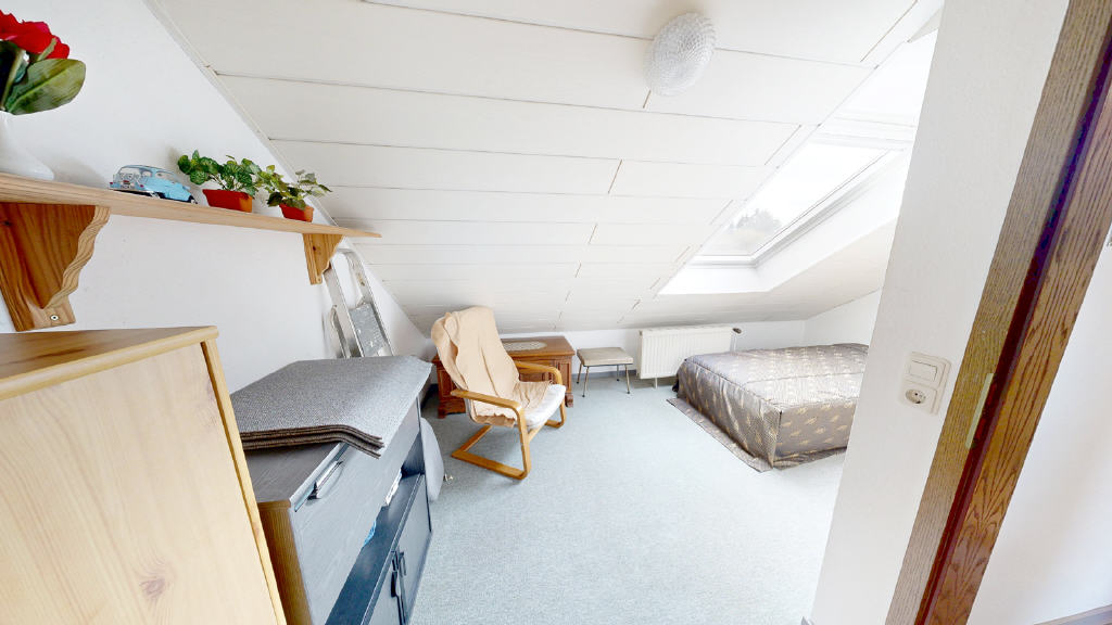 Das lichtdurchflutete wohnlich ausgebaute Dachgeschoss umfasst gleich zwei Räume und ein weiteres Badezimmer.