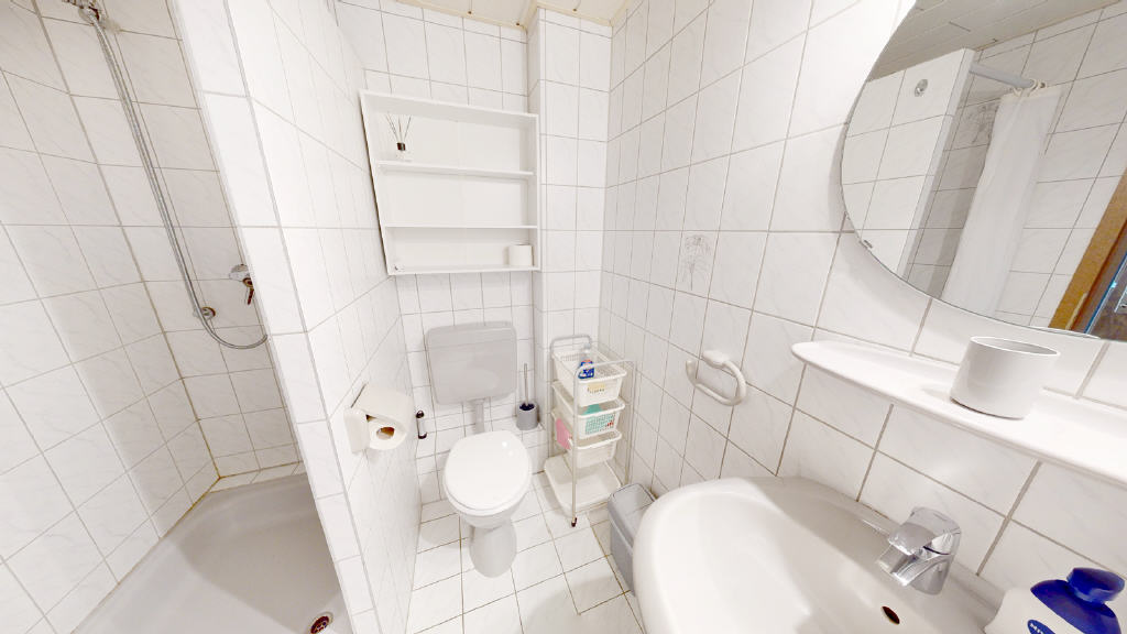 Zurück im Haus: Das Obergeschoss beherbergt ein Kinderzimmer, ein Schlafzimmer sowie ein Vollbad. Das deckenhoch in weiß geflieste Badezimmer verfügt über ein WC, ein Waschtisch, eine Dusche sowie eine Badewanne.