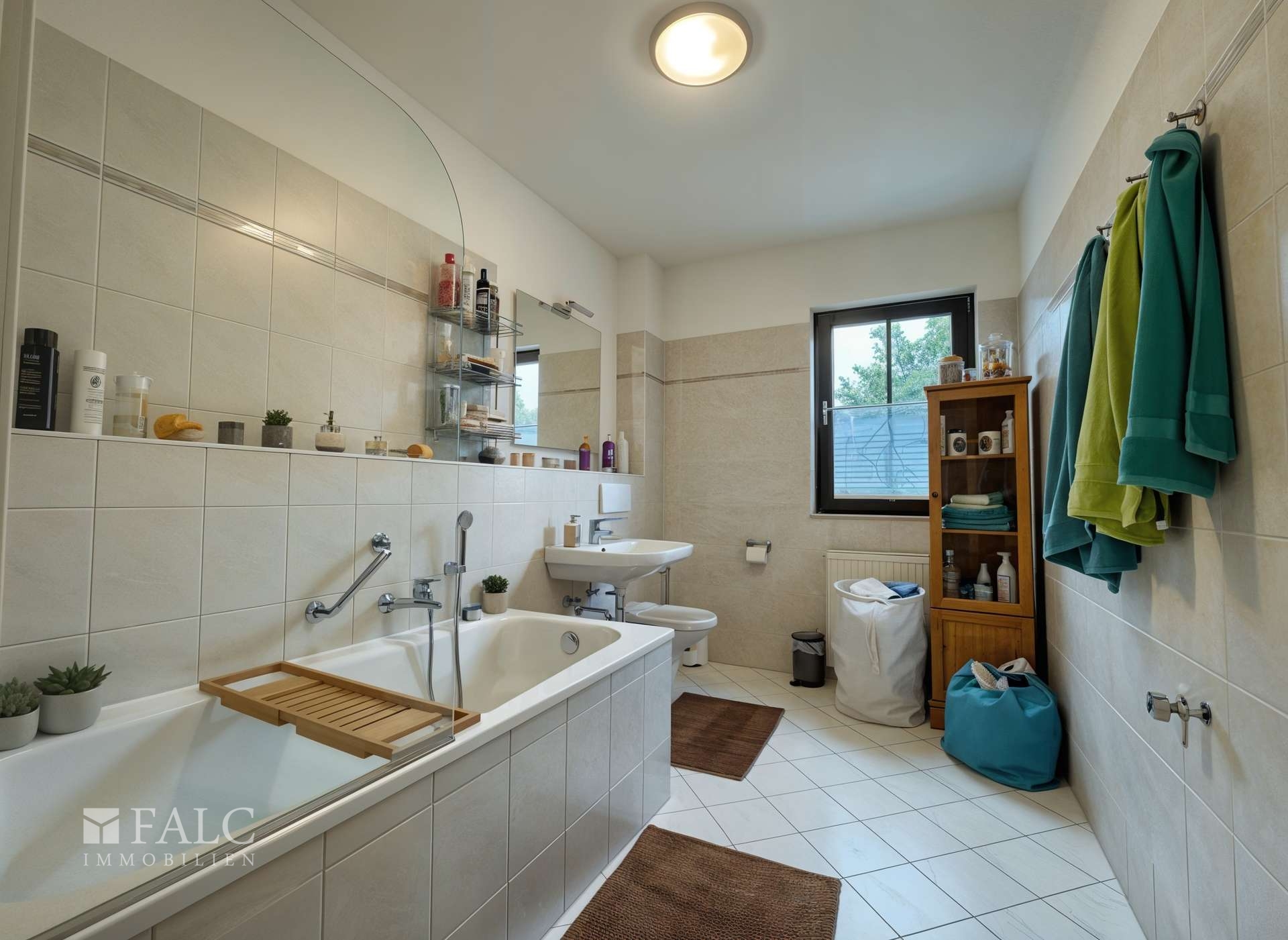 Das Badezimmer ist mit einer Badewanne ausgestattet und bietet alles, was Sie für Ihre tägliche Routine benötigen. Helle Fliesen und ein Fenster sorgen für ein frisches Ambiente.