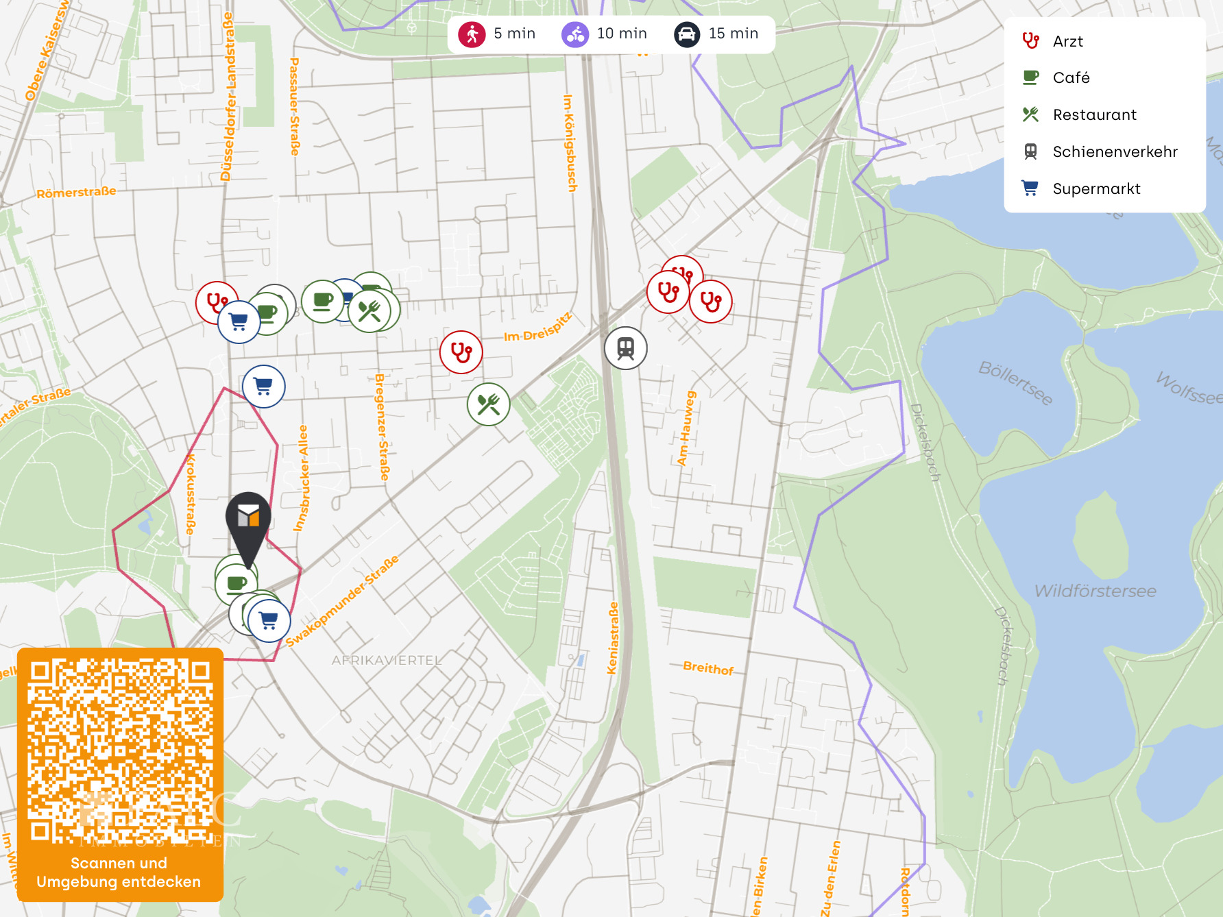 Diese Immobilie befindet sich in einer Umgebung, die das tägliche Leben besonders angenehm macht – lebendig, gut angebunden und voller kleiner Annehmlichkeiten, die den Alltag bereichern. Hier wohnen Sie dort, wo Wege kurz, Möglichkeiten vielfältig und Komfort selbstverständlich sind.